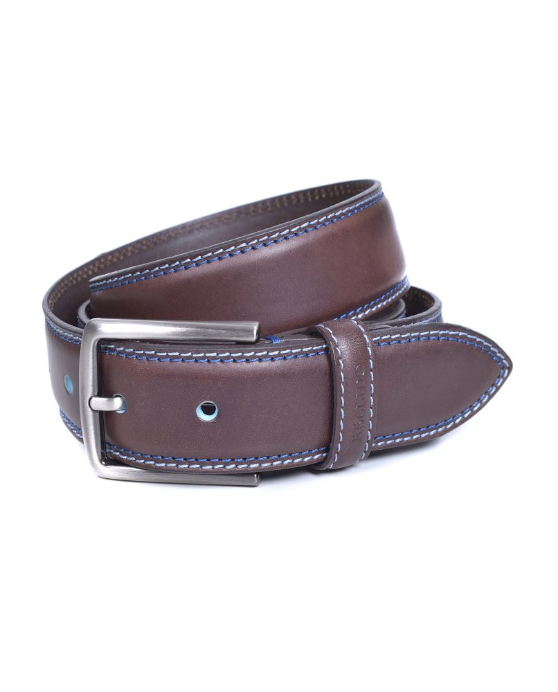 Cinturón en piel de vacuno con pespuntes en azul.
