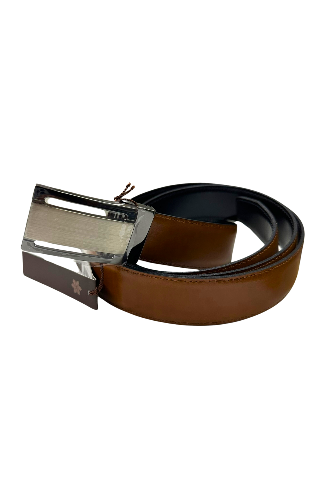 Cinturón de vestir en piel de vacuno reversible, por lo que se puede utilizar por ambos lados. Por un lado en color negro y por el otro en color marrón castaño.