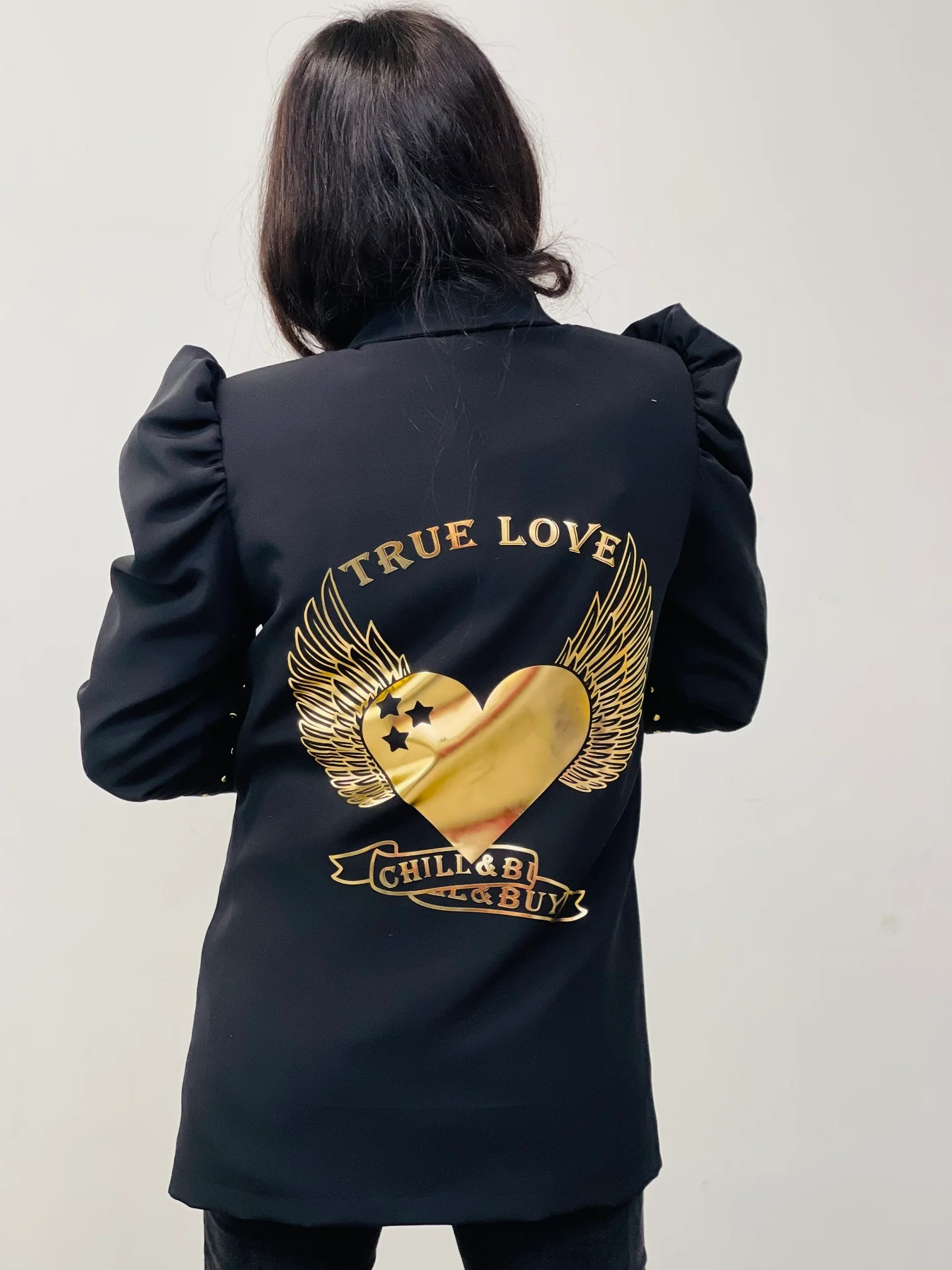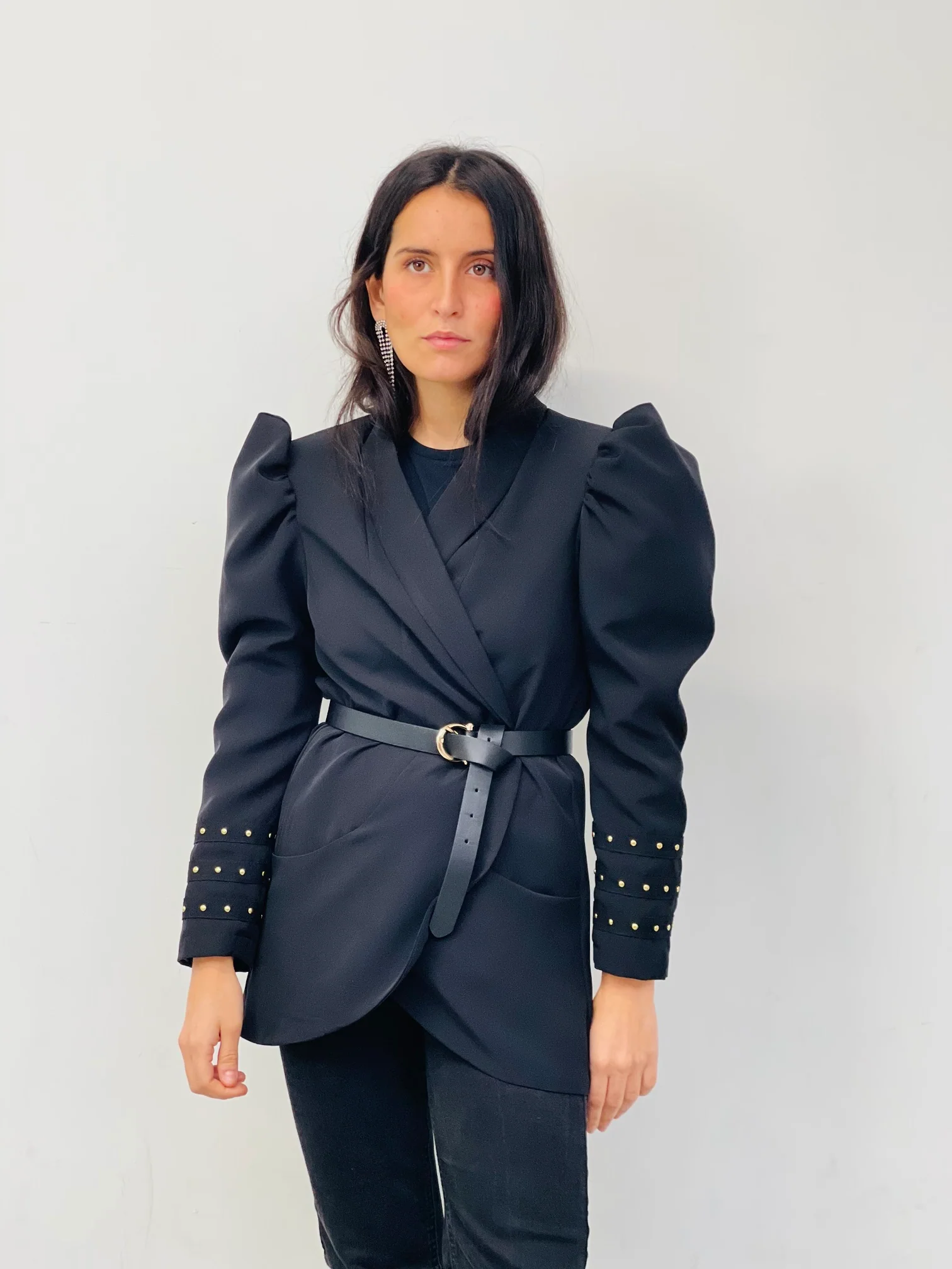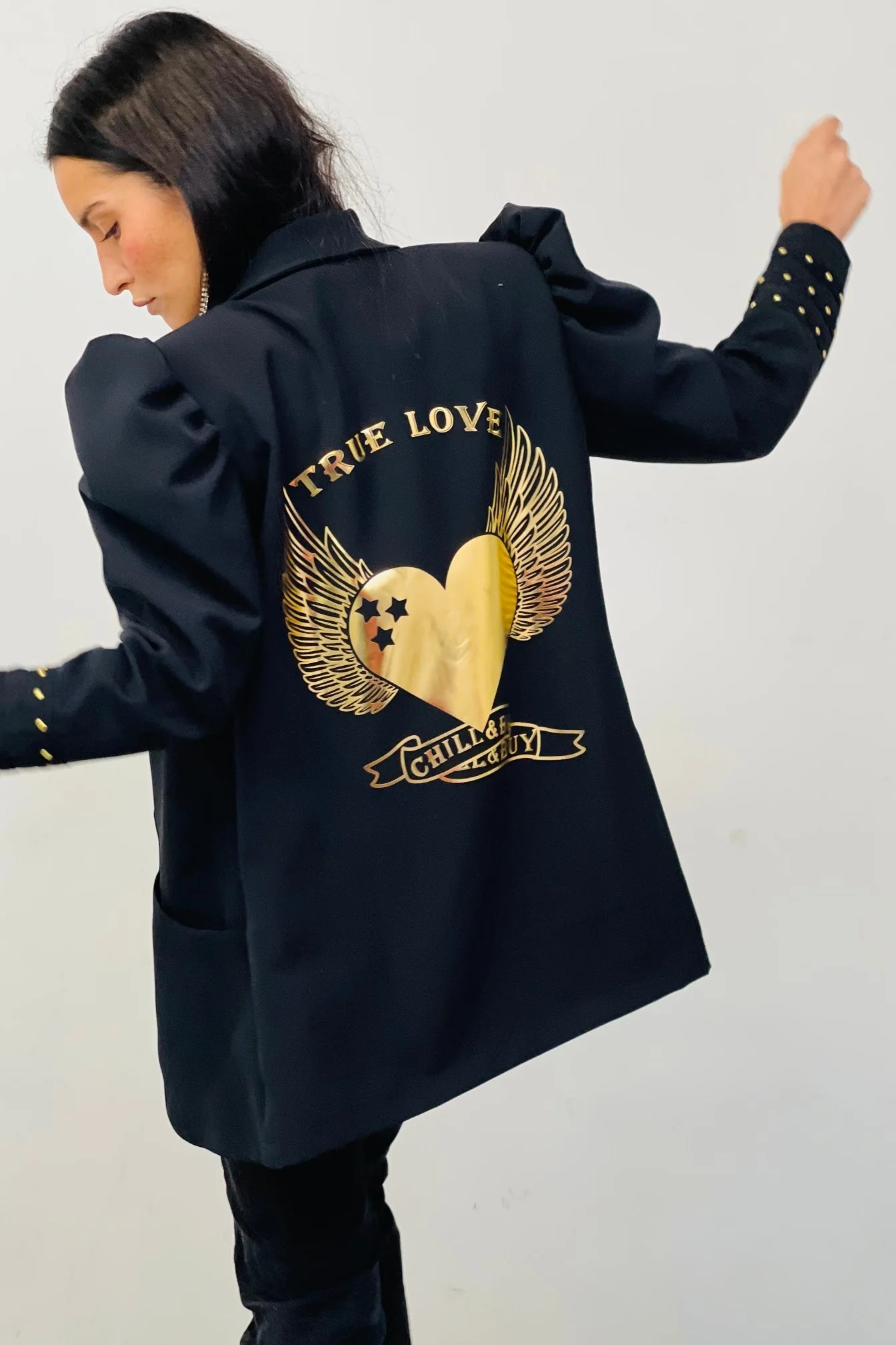 Blazer con cuello smoking , manga larga y hombros marcados con abullonado y detalle de tachuelas en los pu帽os. Bolsillos delanteros y estampaci贸n trasera.