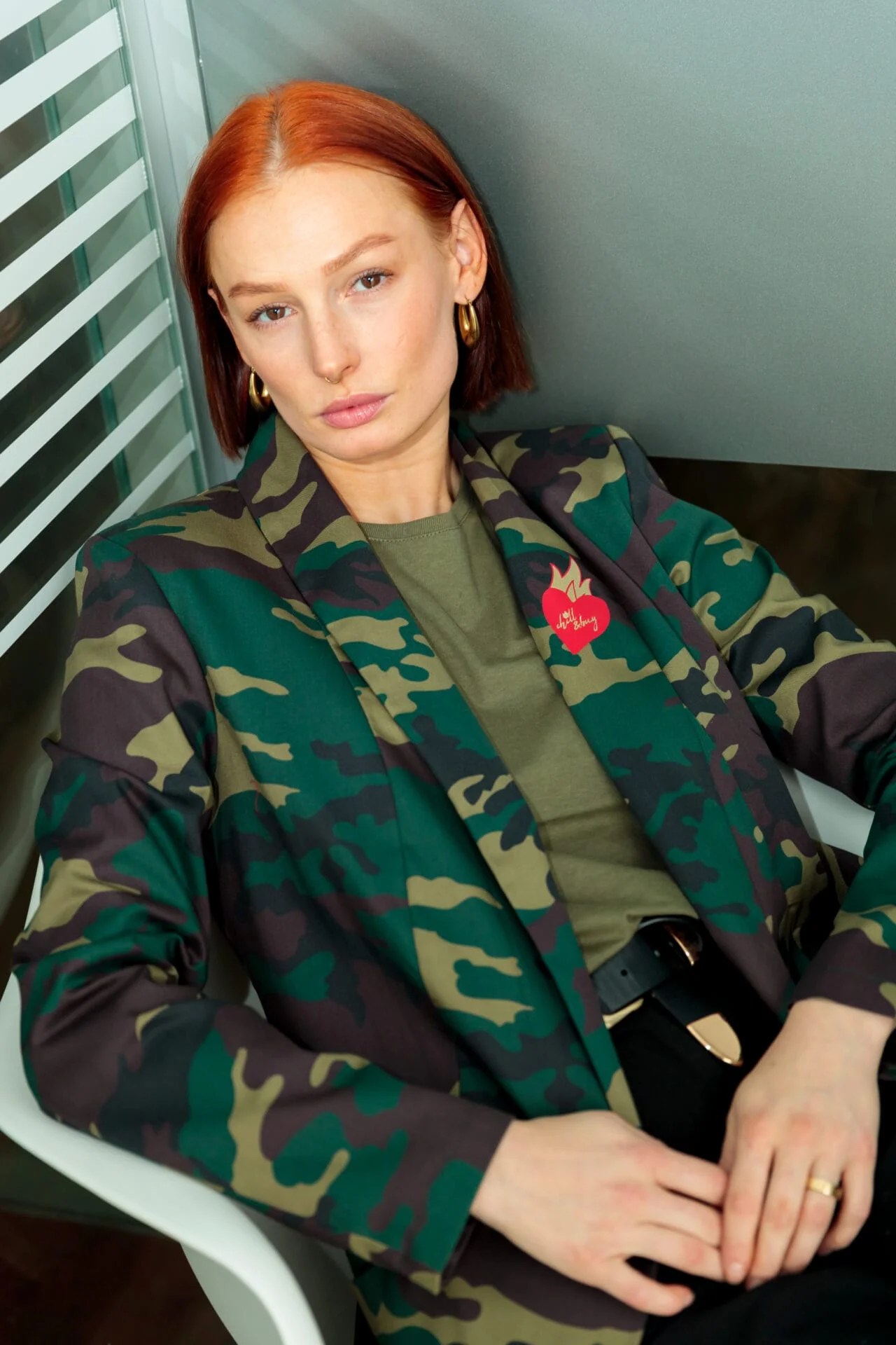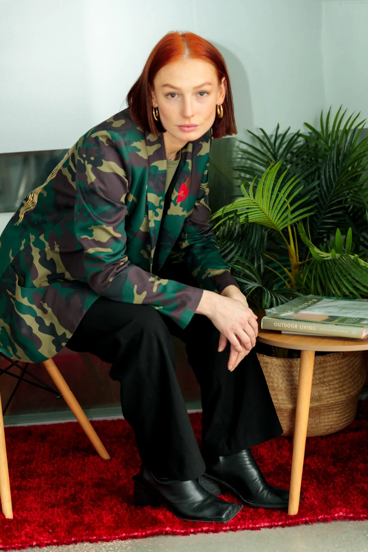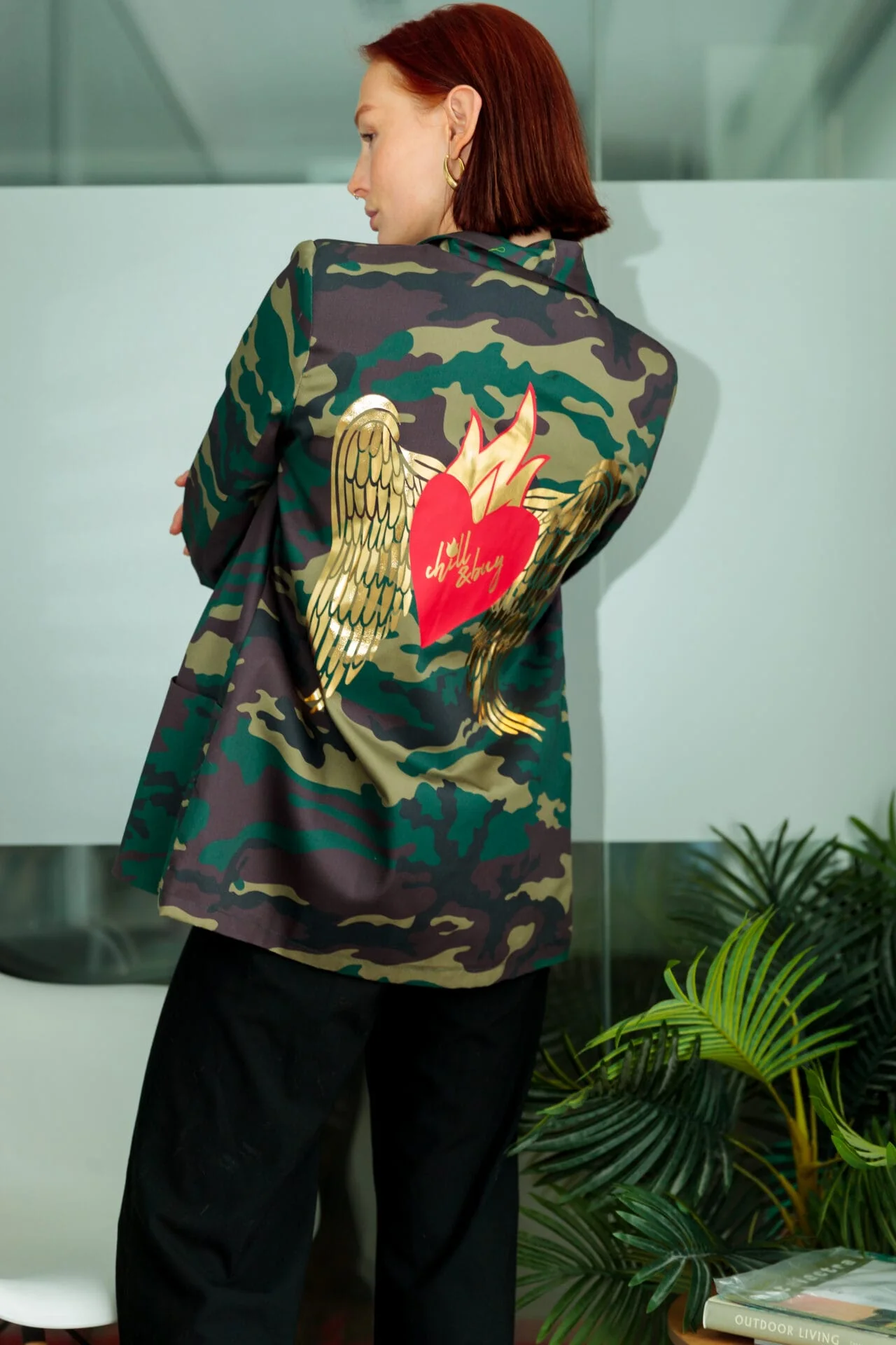 Blazer Smoking confeccionada en estampado camuflaje tonos verdes, con bolsillos y forrada en tono rojo. Estampaci贸n trasera.