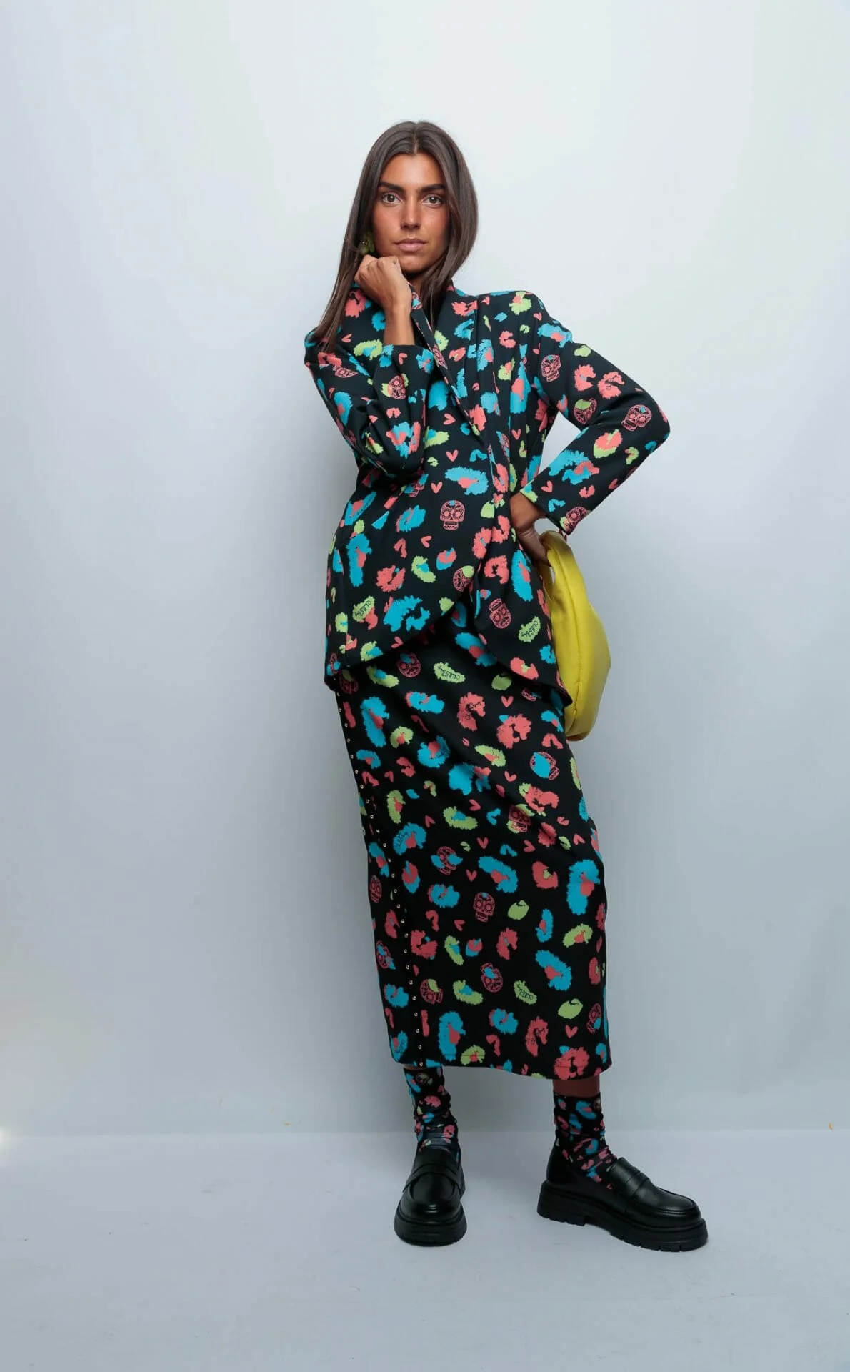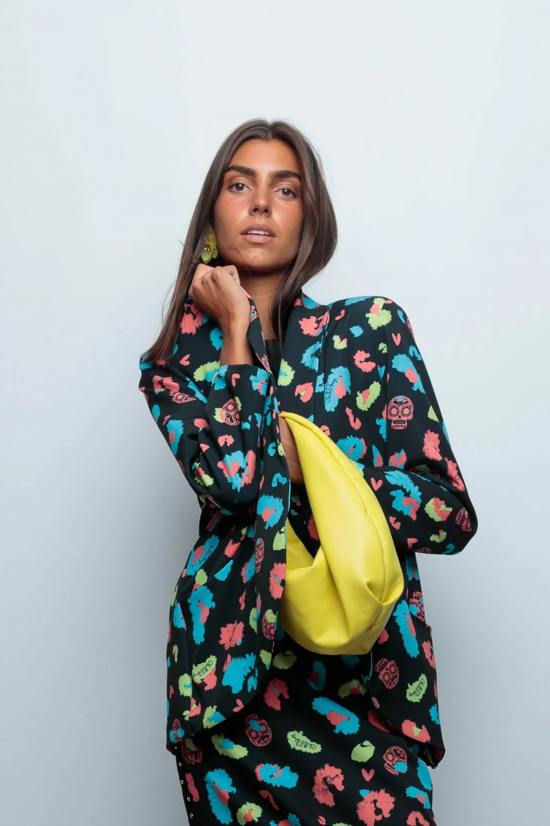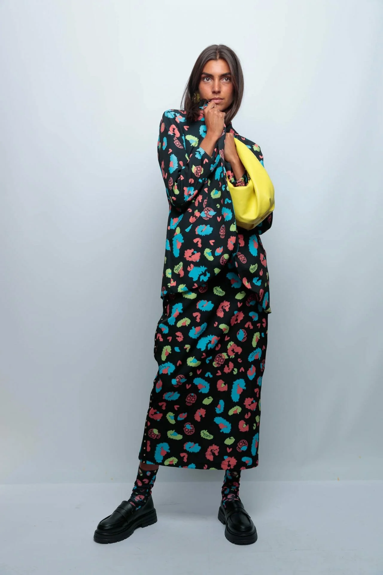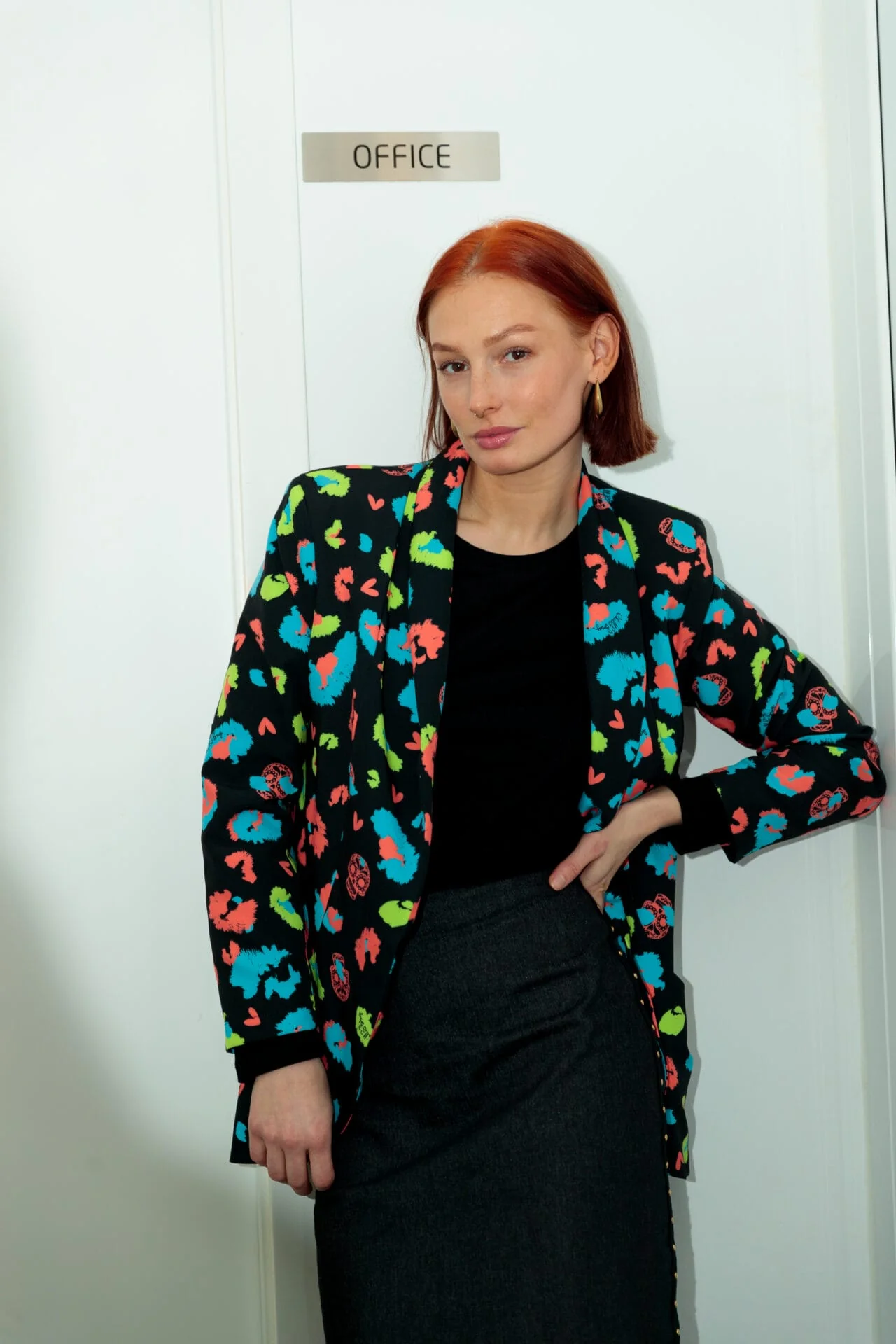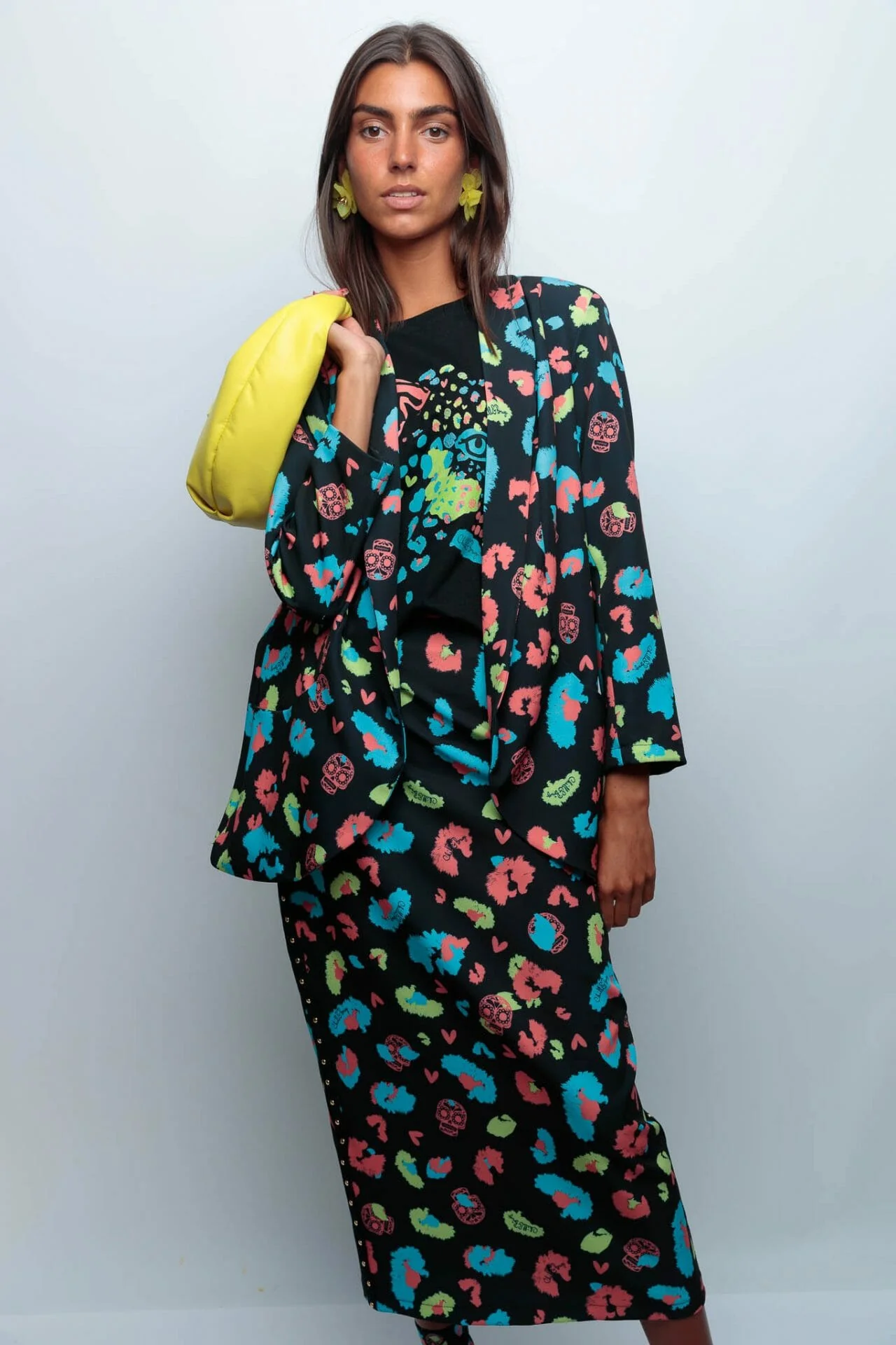 Blazer corte smoking, con bolsillos y forrada. Confeccionada en tejido estampado animal print con tonos negro, turquesa coral y lima.