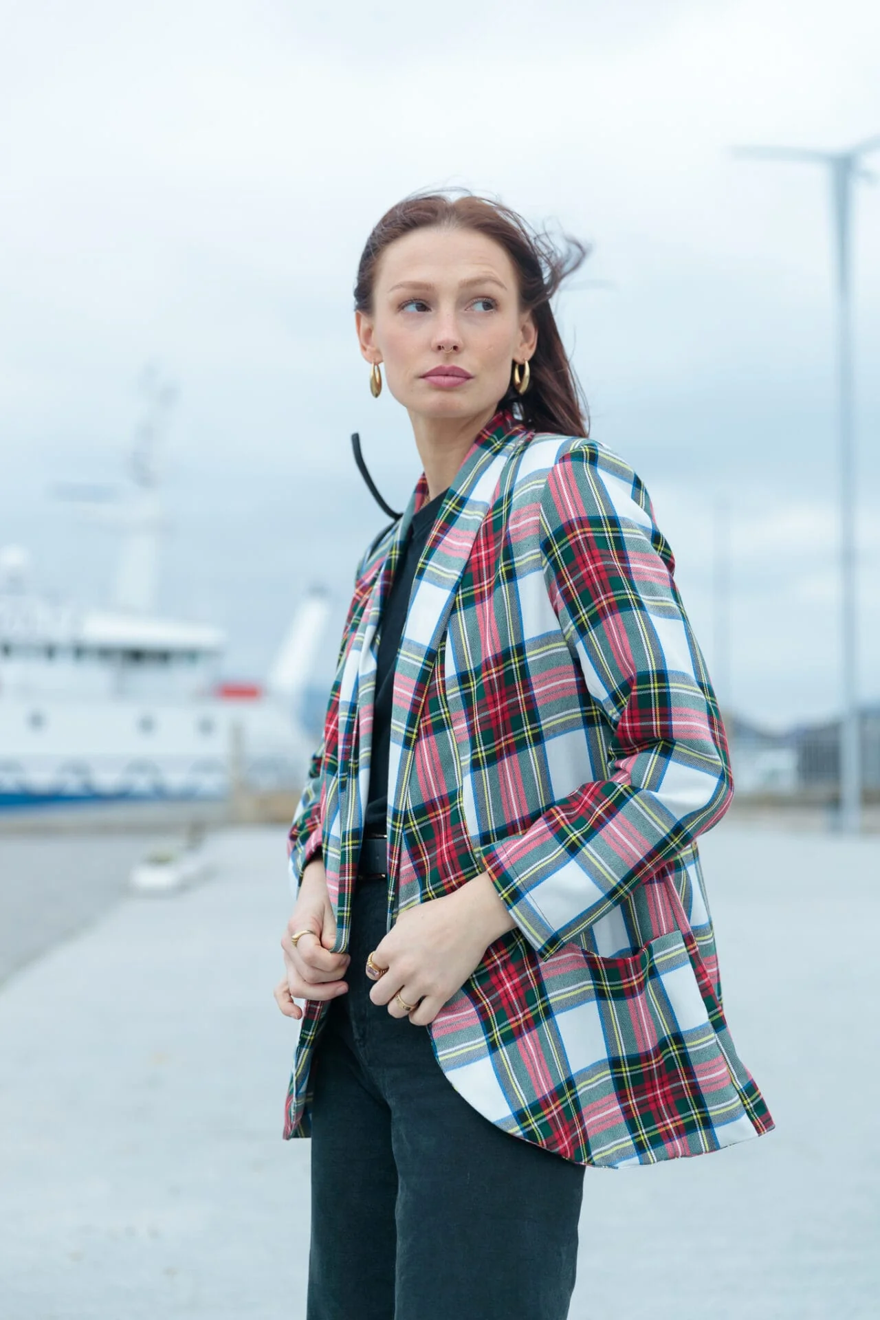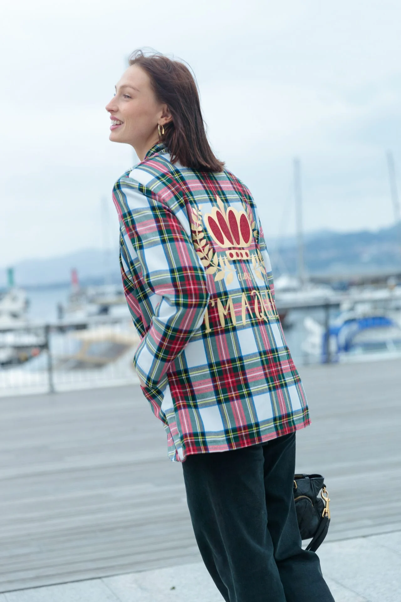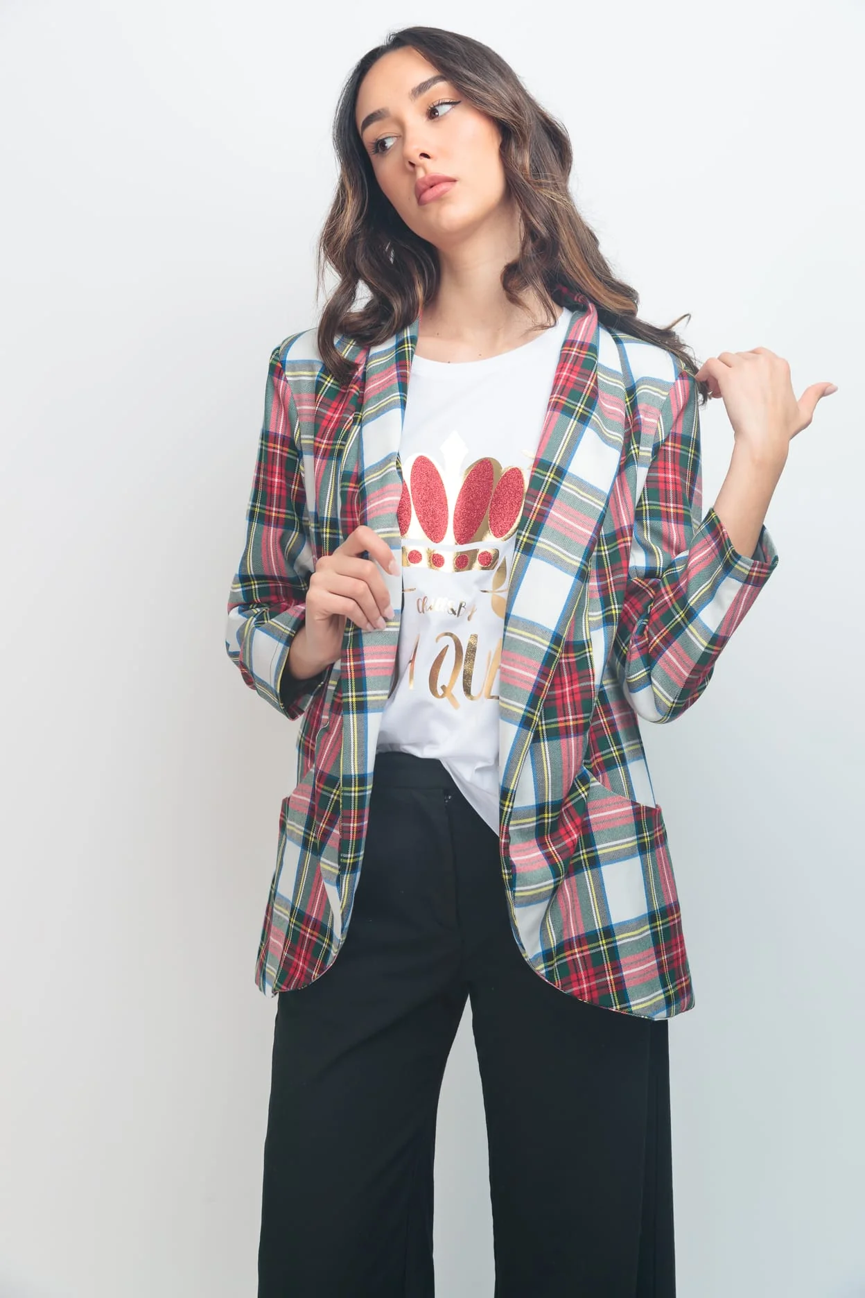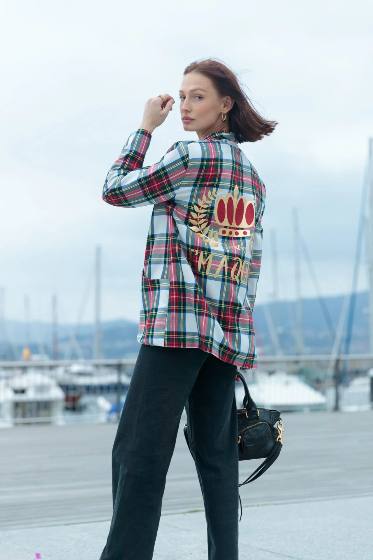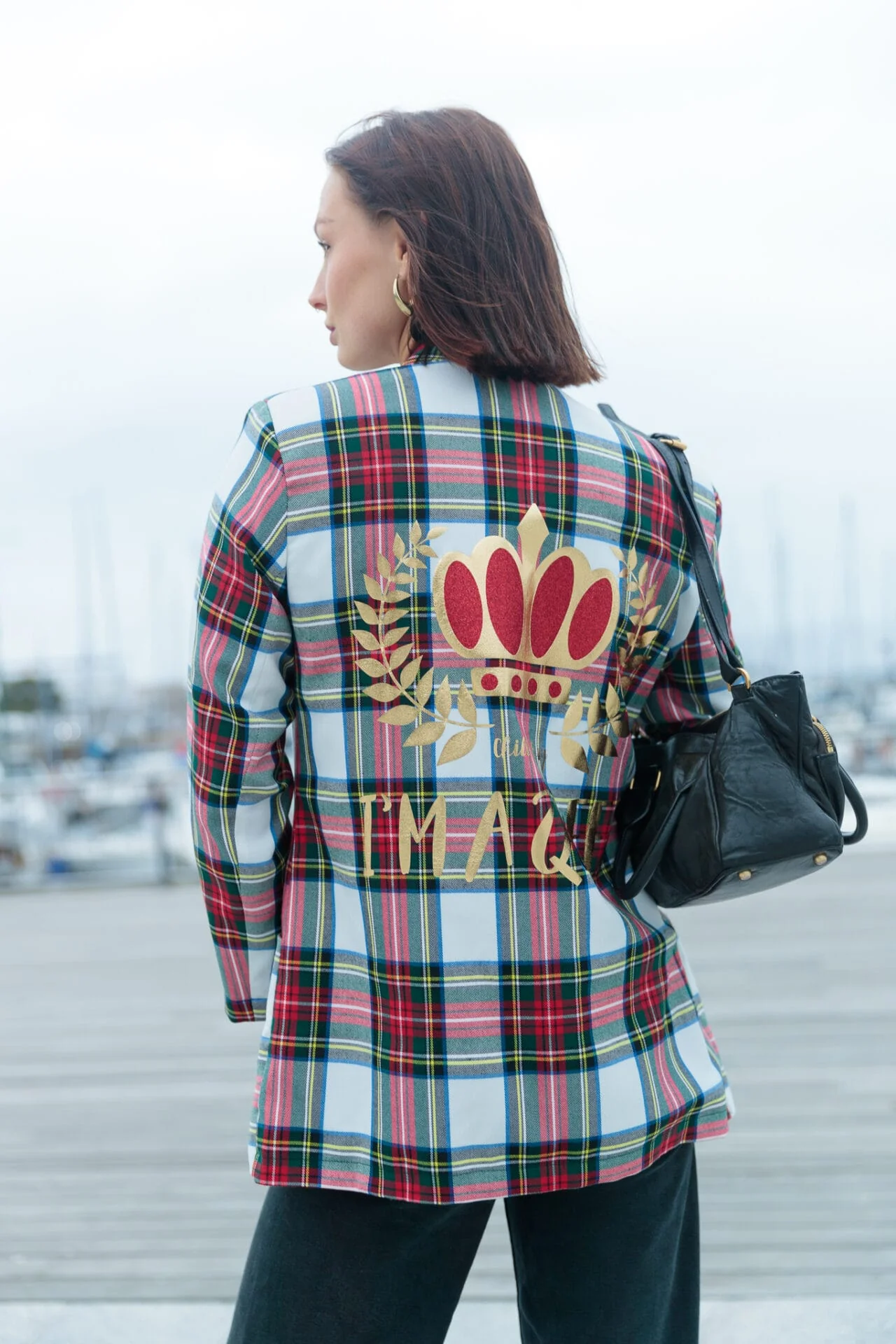Blazer corte smoking en escocés blanco y rojo. Dotado de bolsillos funcionales y forrado para brindarte comodidad durante todo el día, este blazer es tanto práctico como elegante. Los detalles son clave, y la estampación trasera de una corona en color dorado glitter añade un toque de glamour y realeza a tu conjunto. La frase «I’m Queen» impresa junto a la corona subraya tu poderío y autoestima, recordándote que eres digna de ocupar tu lugar en el trono de la moda.