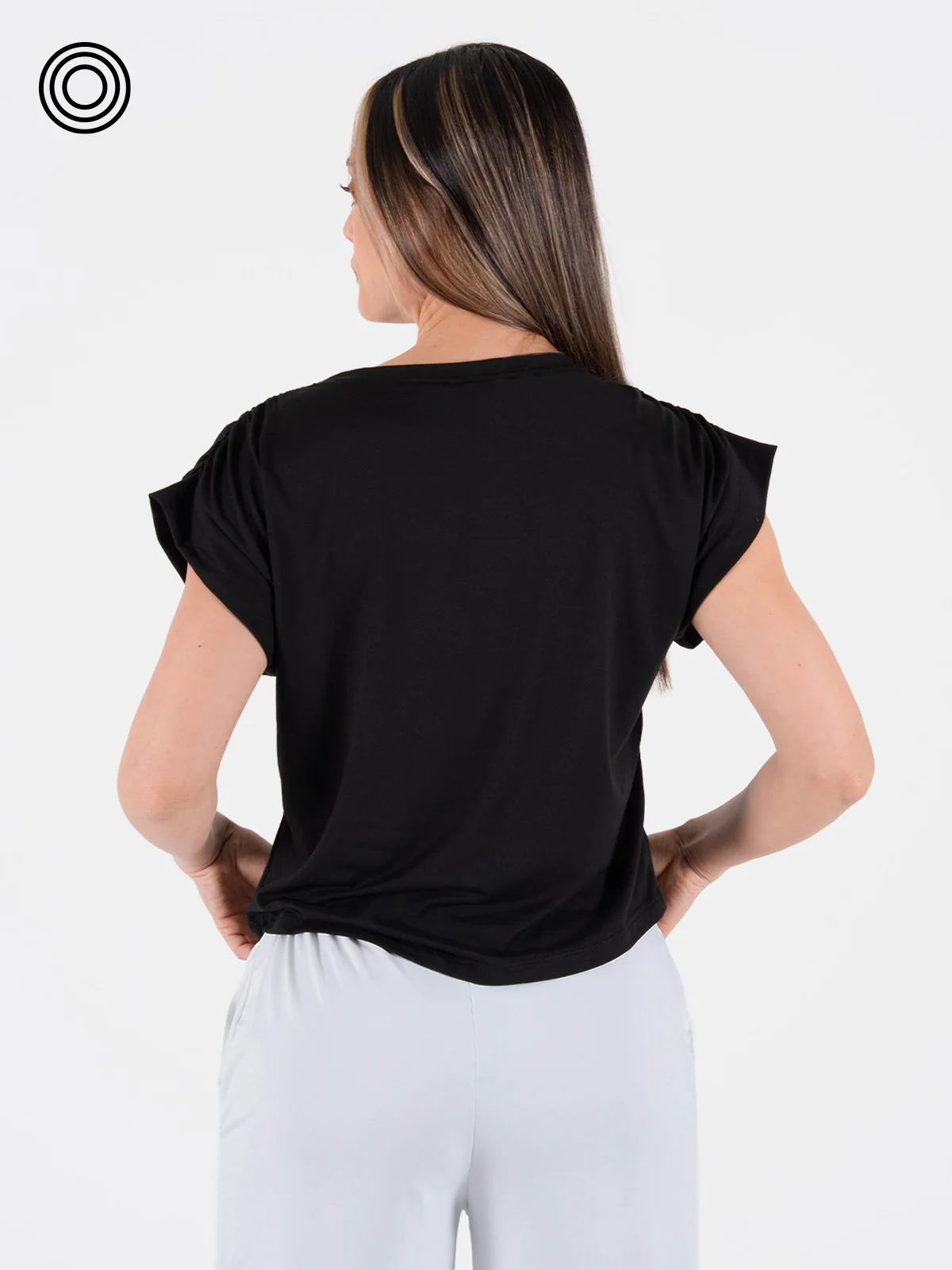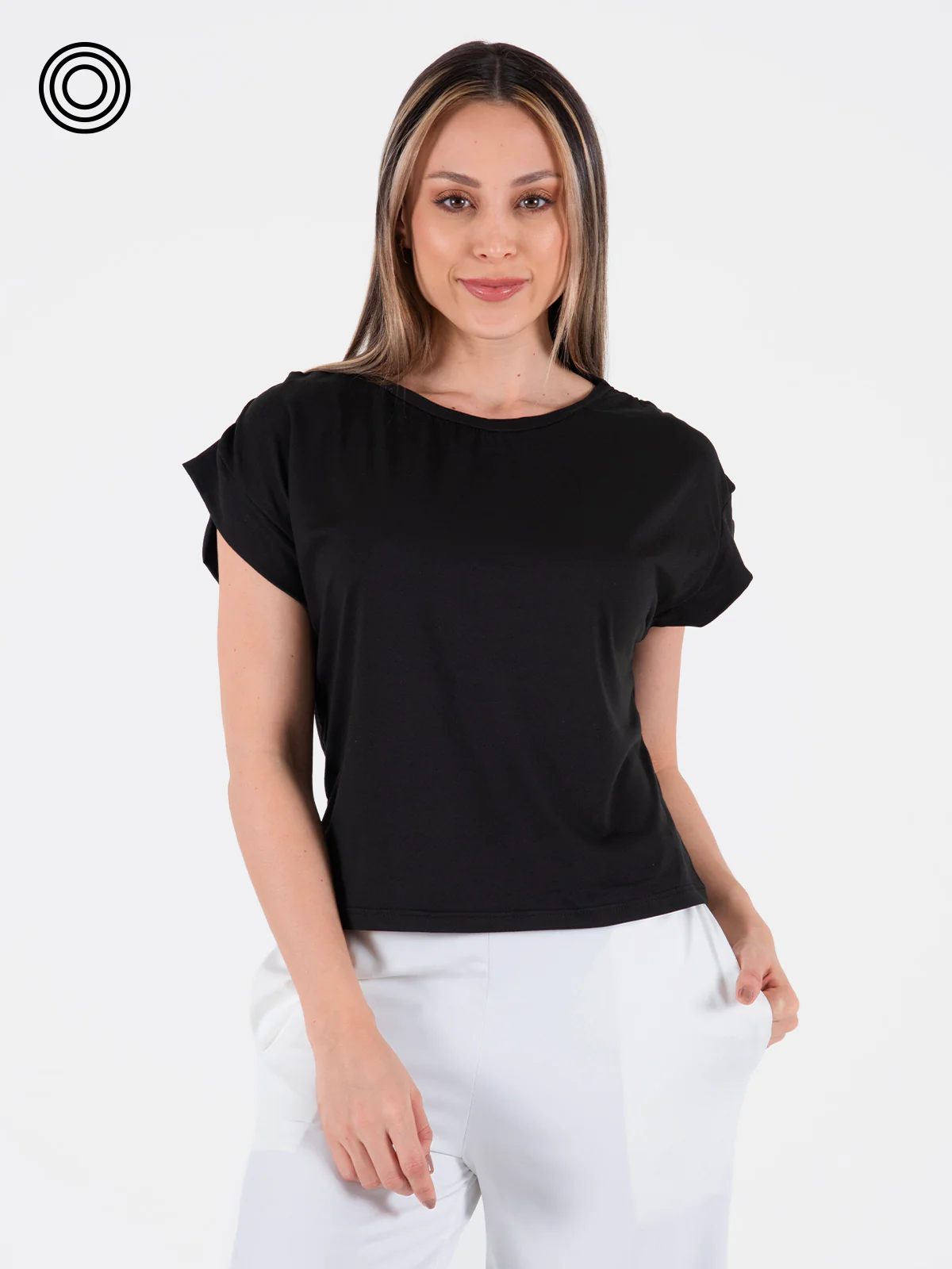 Blusa dama, recogida en hombros, con cuello redondo y manga sisa con puños.