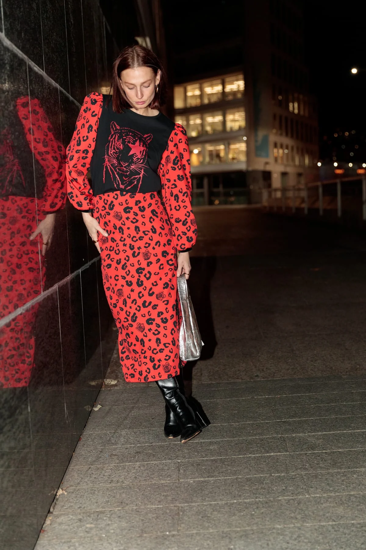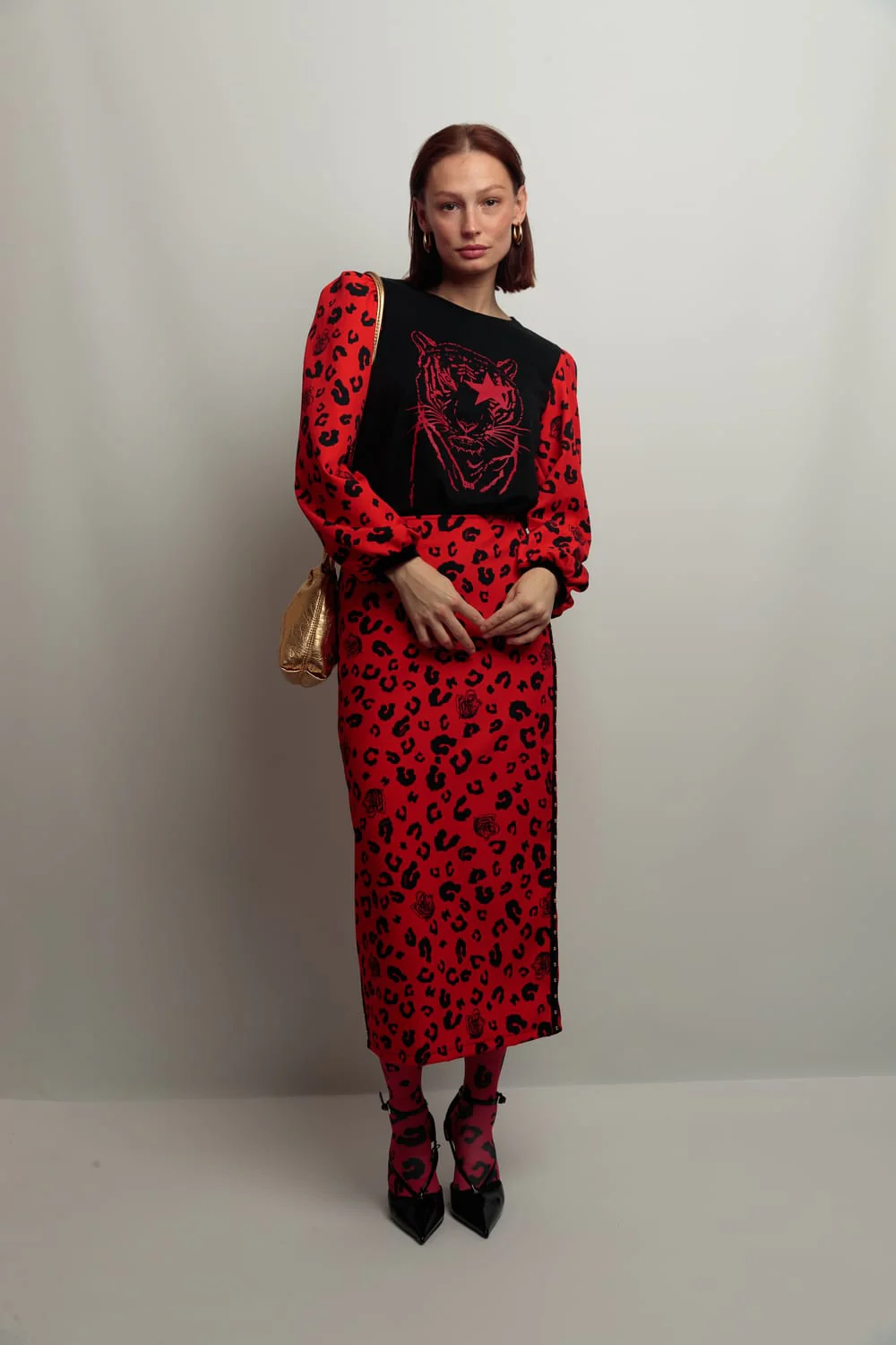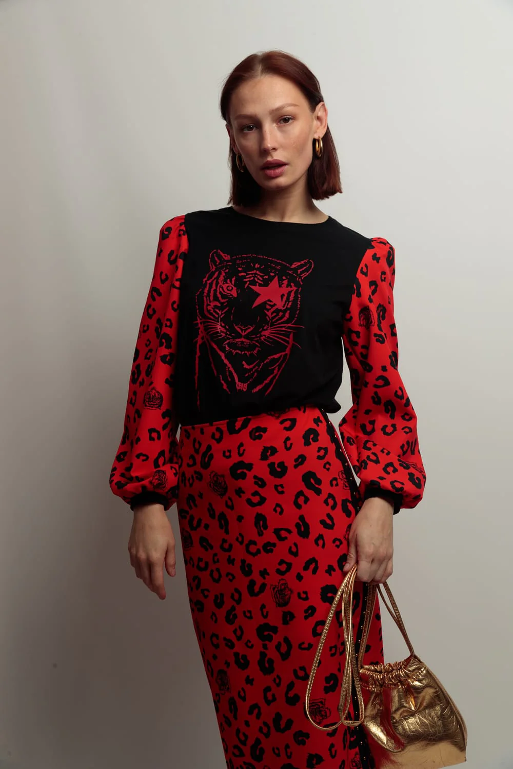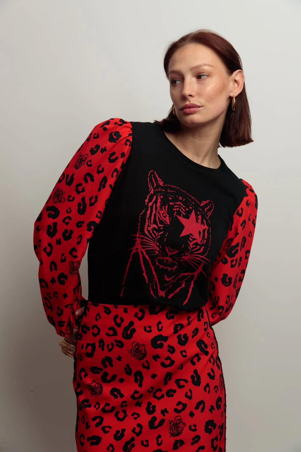 Camiseta de algodón en color negro con cuello redondo, y corte evasé. Detalle de mangas abullonadas en estampado animal print color rojo. Estampación frontal.