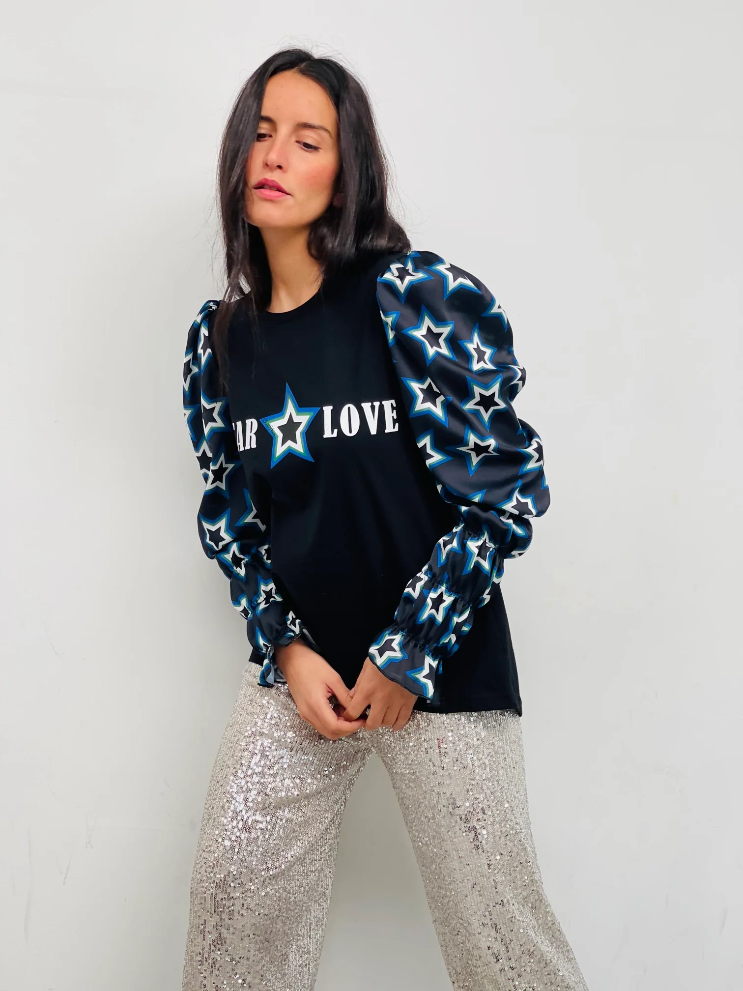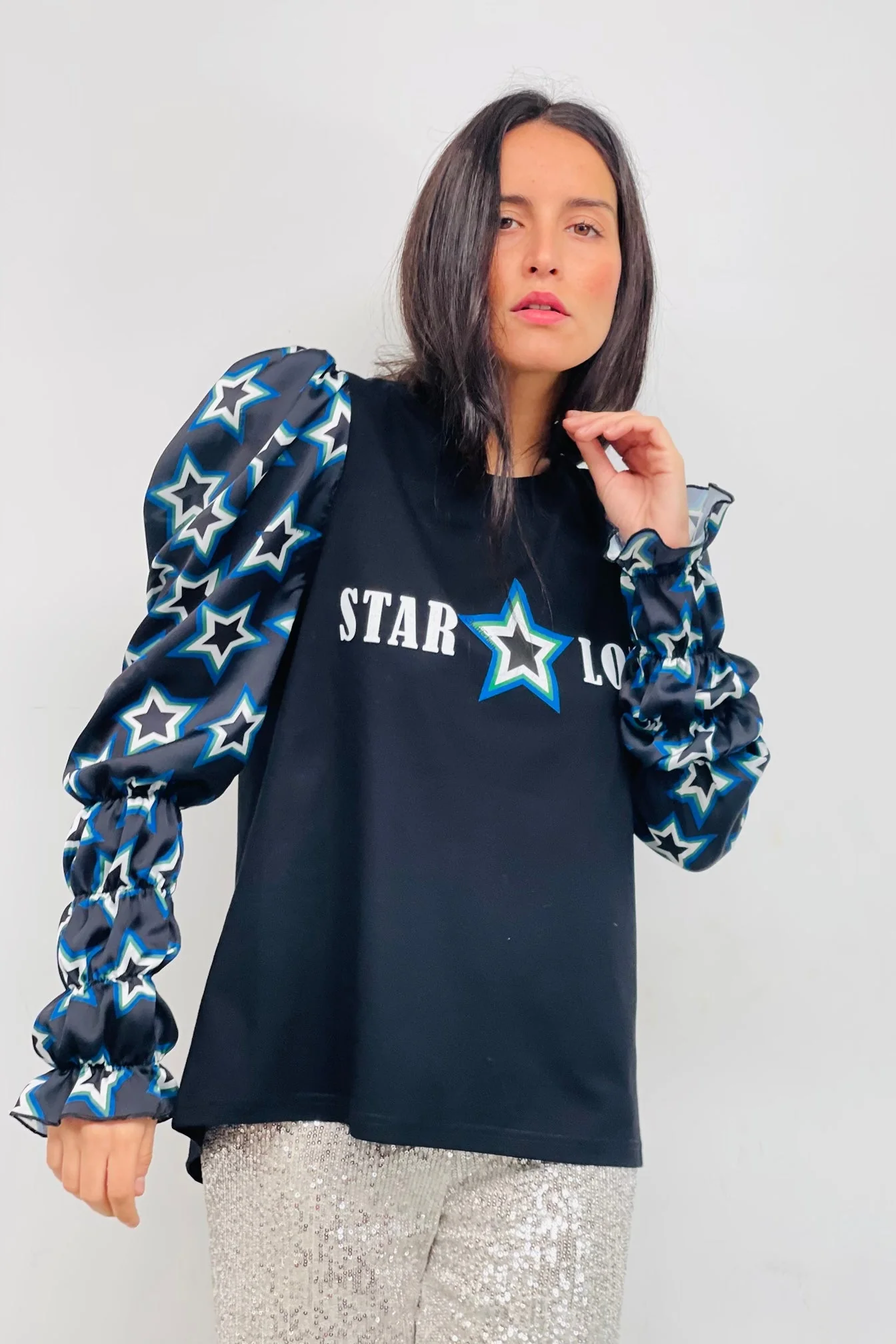 Camiseta de algodón en color negro, con cuello redondo, corte evasé y bajo asimétrico. Detalle de manga larga abullonada estampada en tonos negro con estrellas azules y blanco. Estampación frontal.