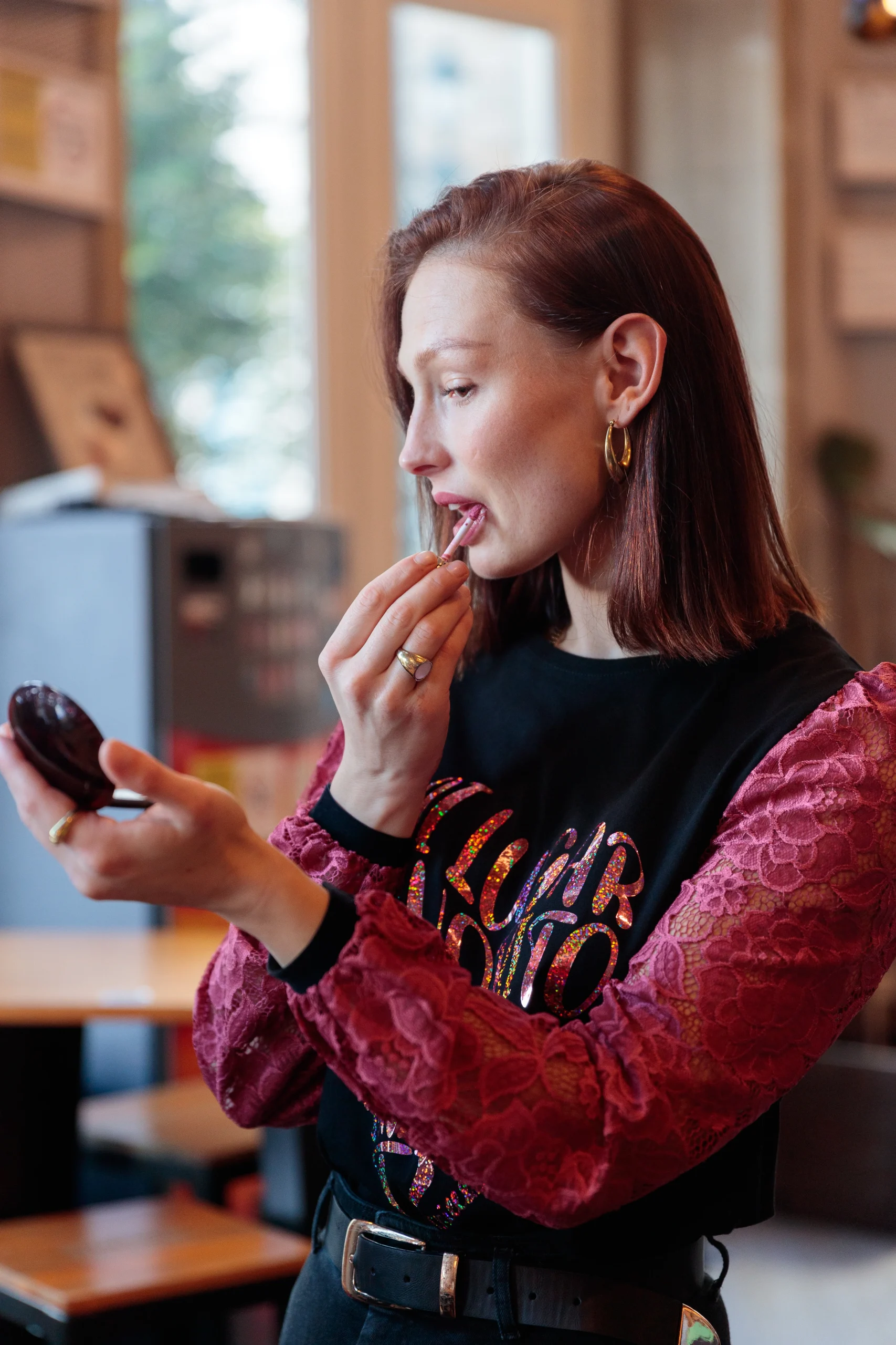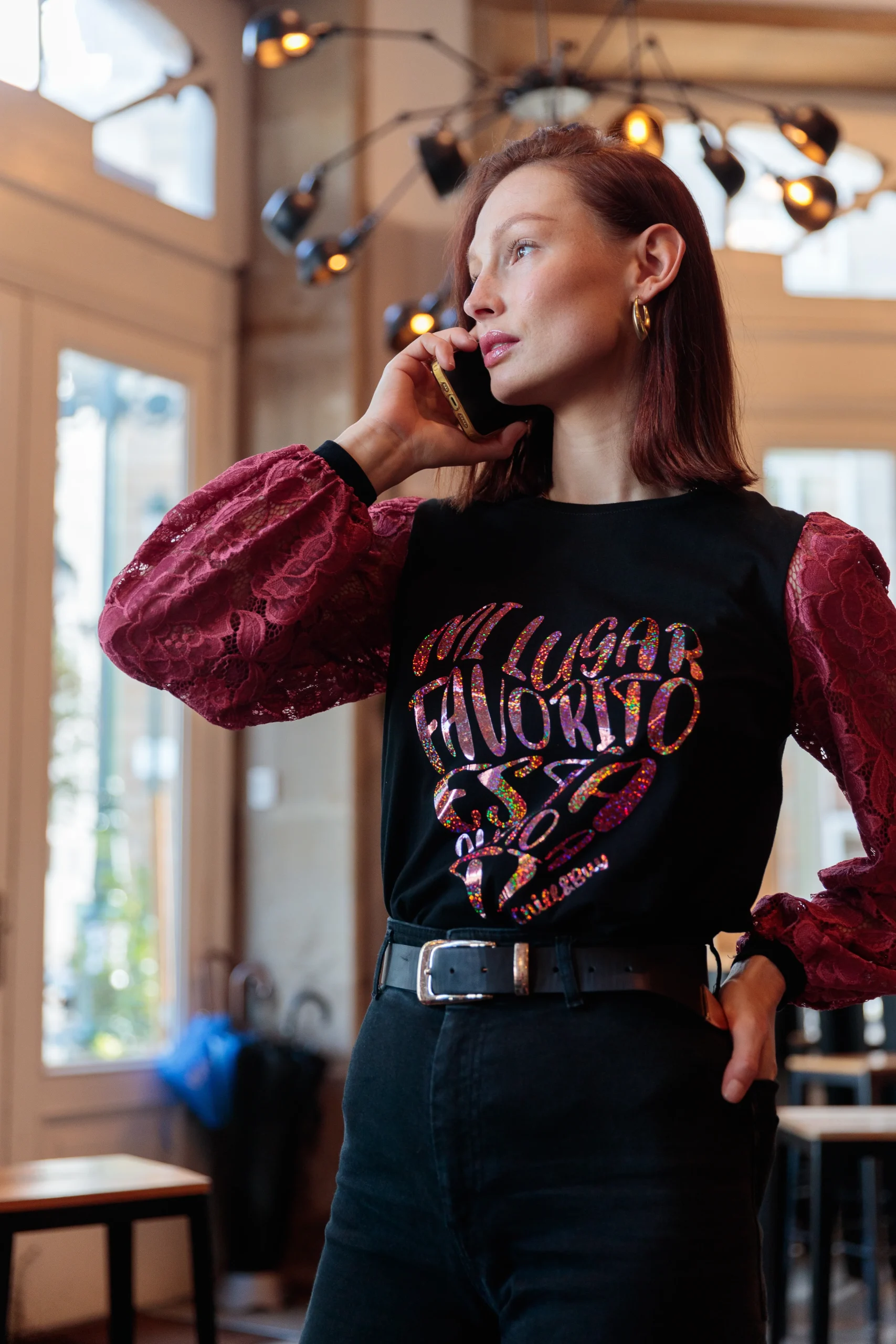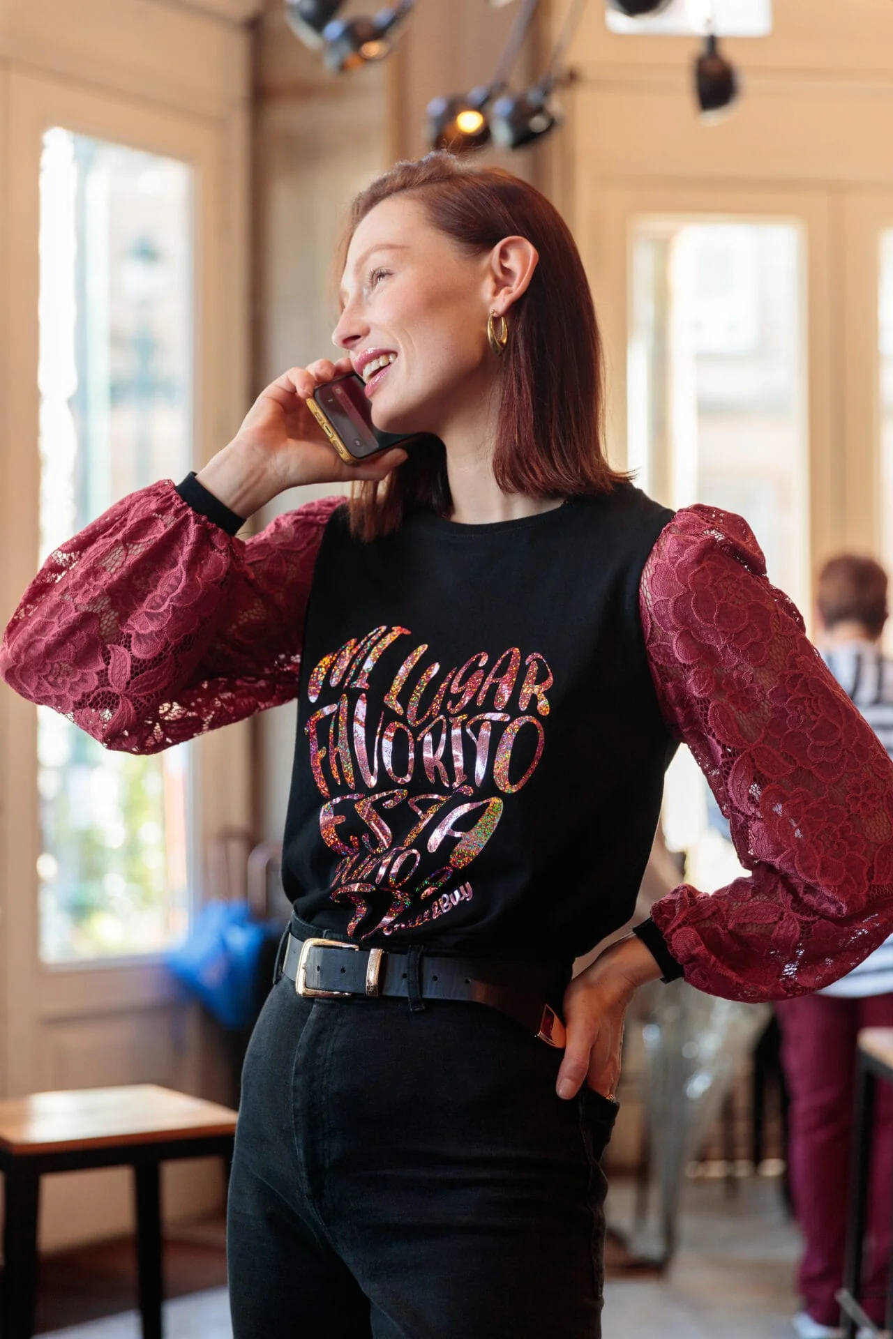 Camiseta de algodón, con cuello redondo, corte evasé y bajo asimétrico con detalle de mangas abullonadas de blonda y estampación frontal a contraste.