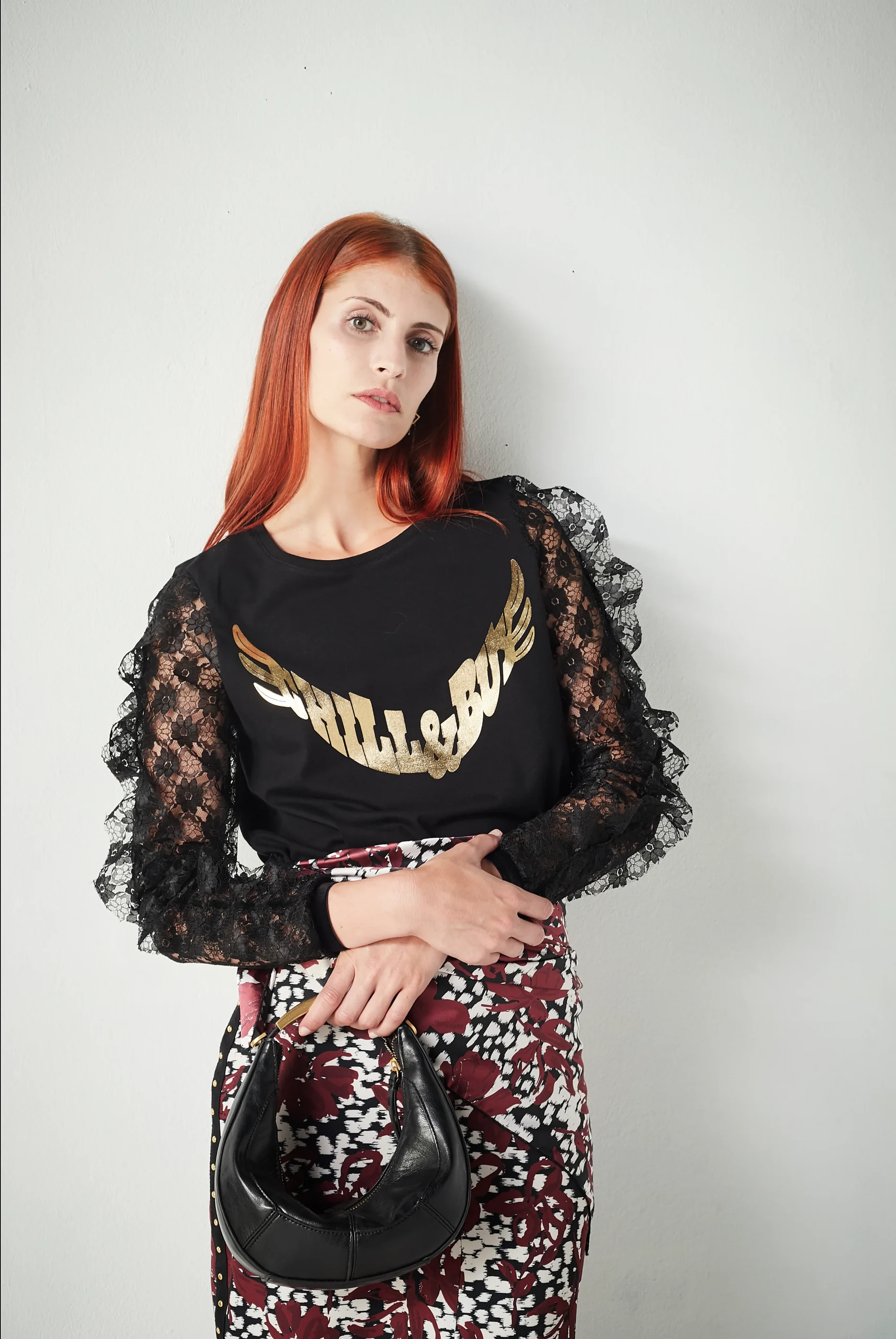 Camiseta con cuerpo de algodón negro y mangas abullonadas de terciopelo rojo. Destaca su estampado central de estrella dorada rodeada de detalles en rojo, que aporta un toque moderno y llamativo. Una prenda cómoda y versátil con un punto festivo ideal para dar estilo a cualquier look.