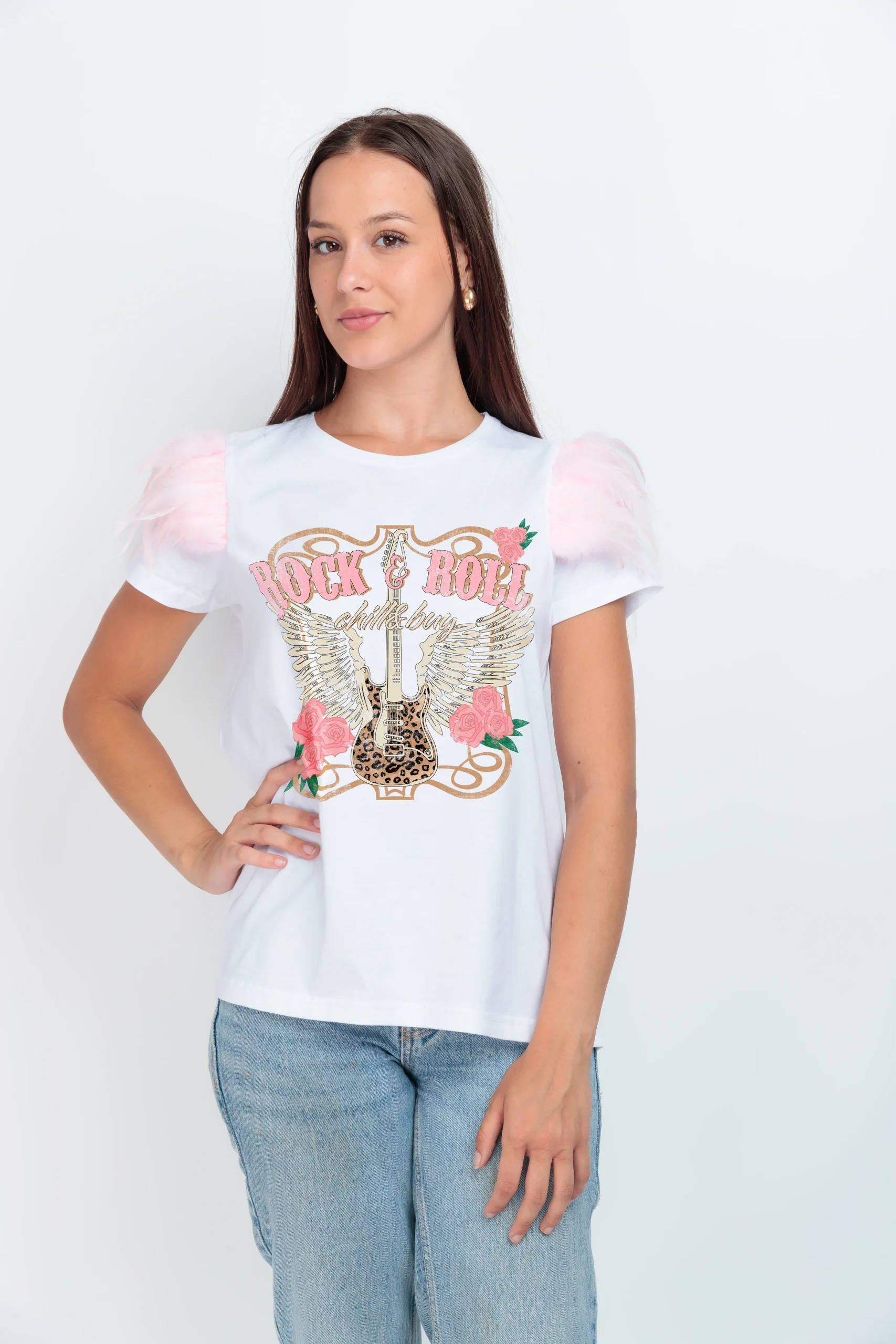 Estampación frontal con ilustración de guitarra con alas en patrón vichy, enmarcada con detalles florales y el texto «Rock & Roll Chill & Buy».