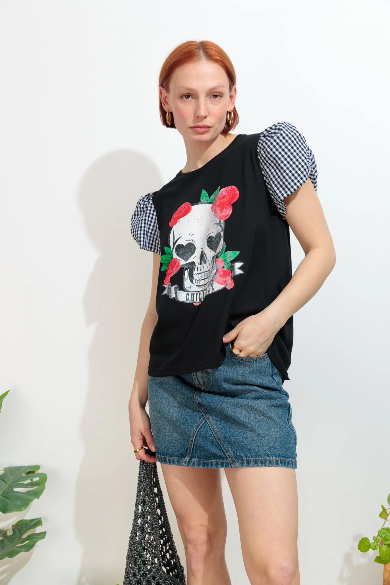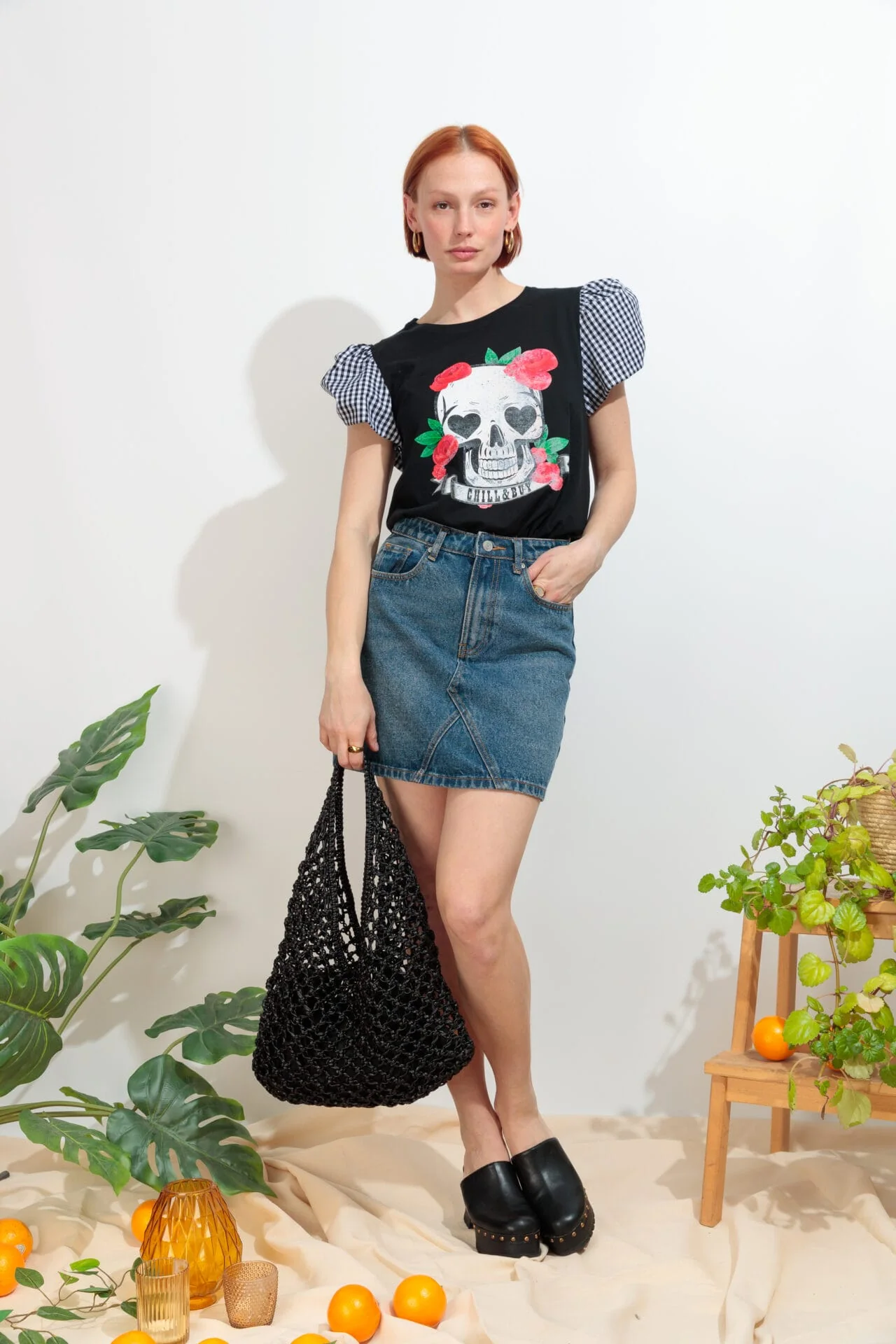 Camiseta de algodón en color marino, corte entallado y bajo recto. Detalle de manga corta abullonada en vichy marino. Estampación frontal.