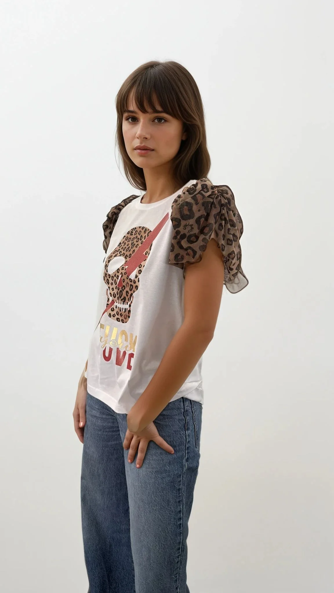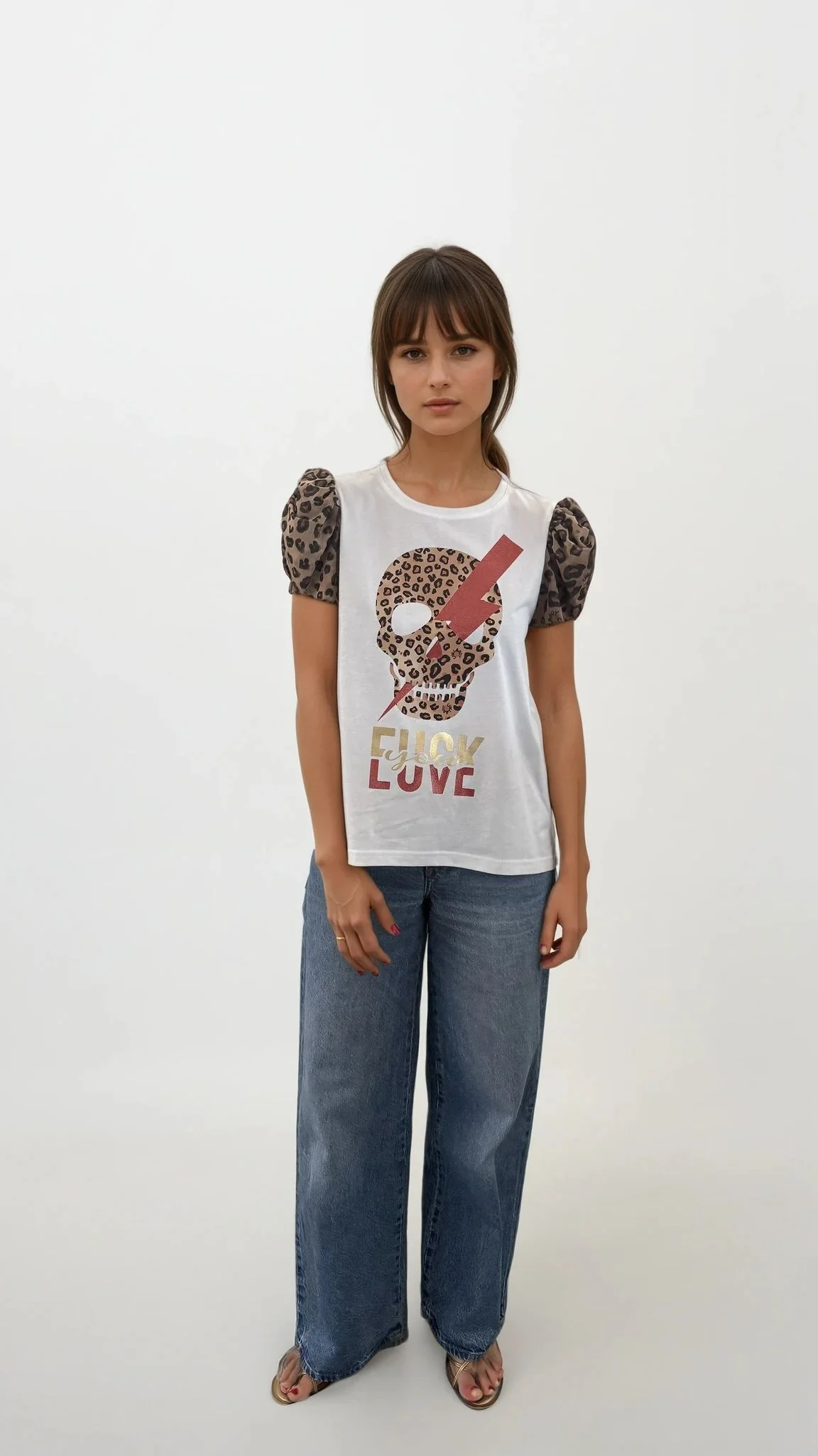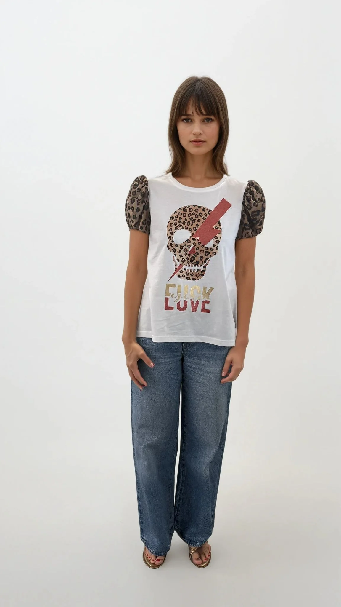 Sus mangas abullonadas están realizadas en un delicado tul estampado animal print en tonos camel y negro, que aportan volumen y carácter al diseño. El gráfico frontal de calavera con print de leopardo y rayo metalizado rojo es una declaración de rebeldÃa y actitud: «F** your love»*, con tipografÃa combinada en dorado y rojo.