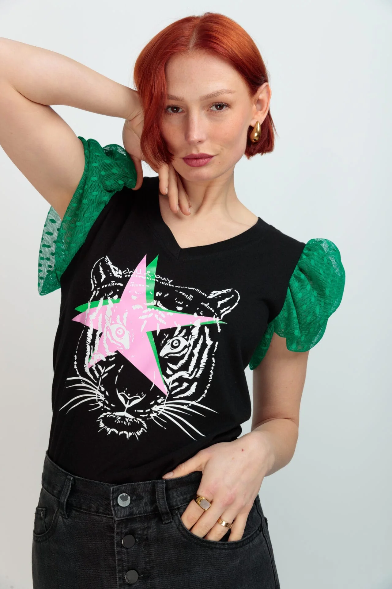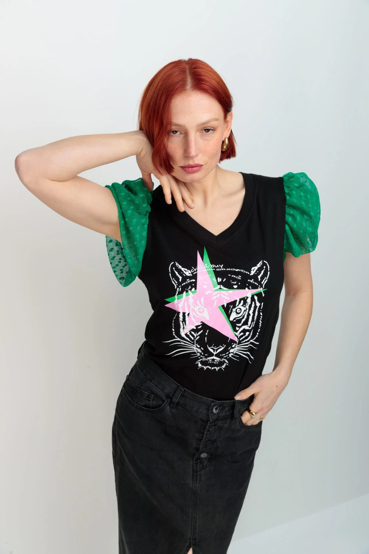 Camiseta Blow Tigre Star de corte evasé y bajo asimétrico, confeccionada en algodón negro. Destaca por sus mangas con maxi lazos en tul verde con lunares y tira de tachuelas metálicas en forma de estrella. El diseño se completa con un estampado frontal de un tigre y una estrella en tonos rosa y verde. Confeccionada en Vigo.