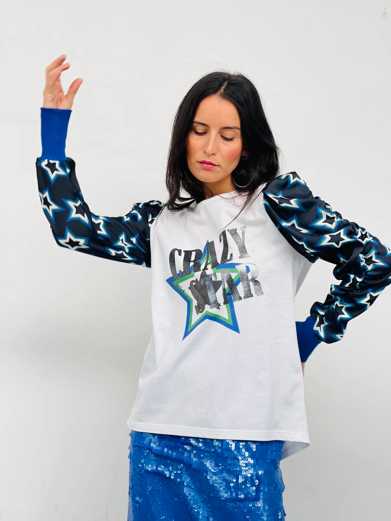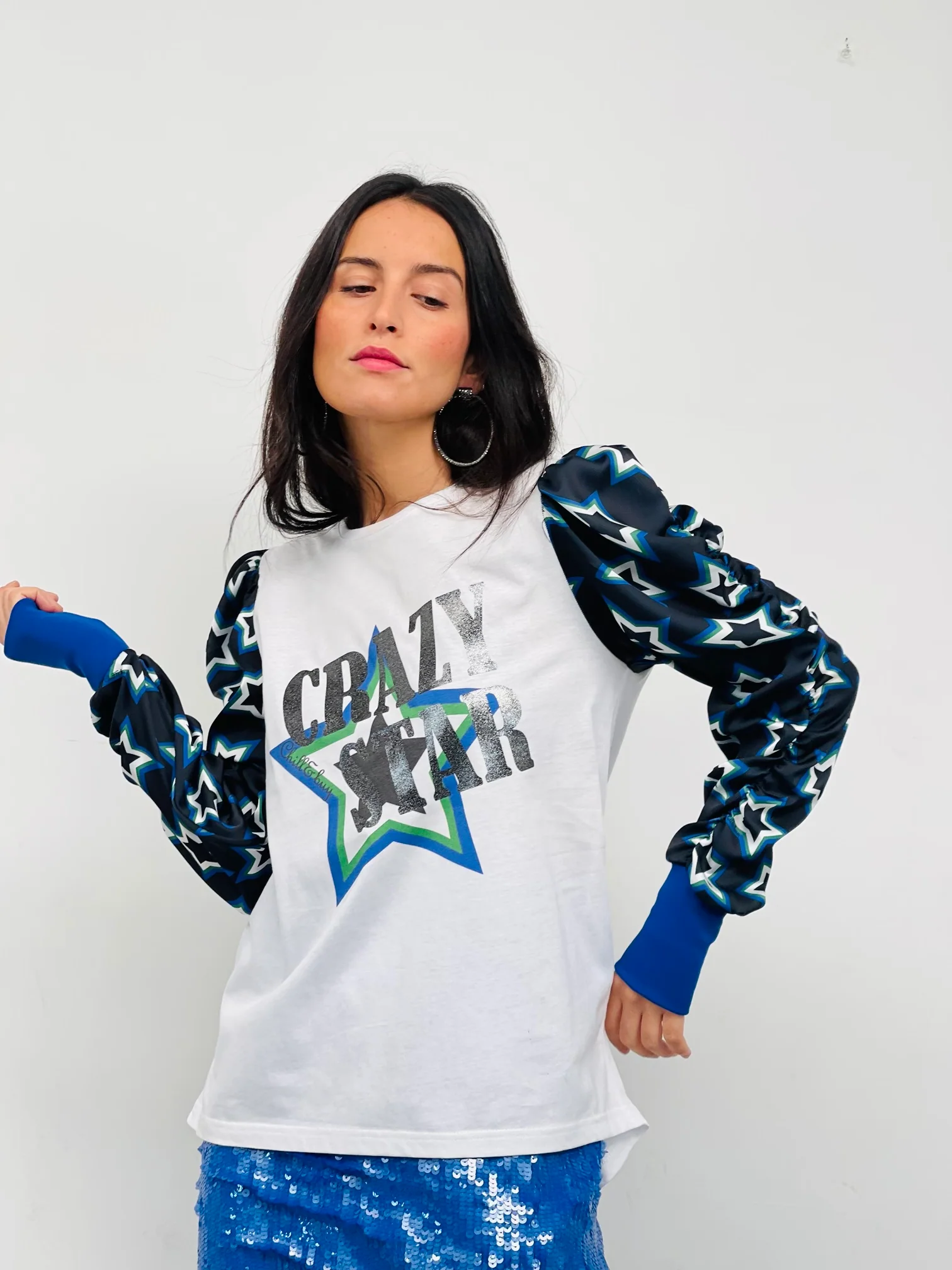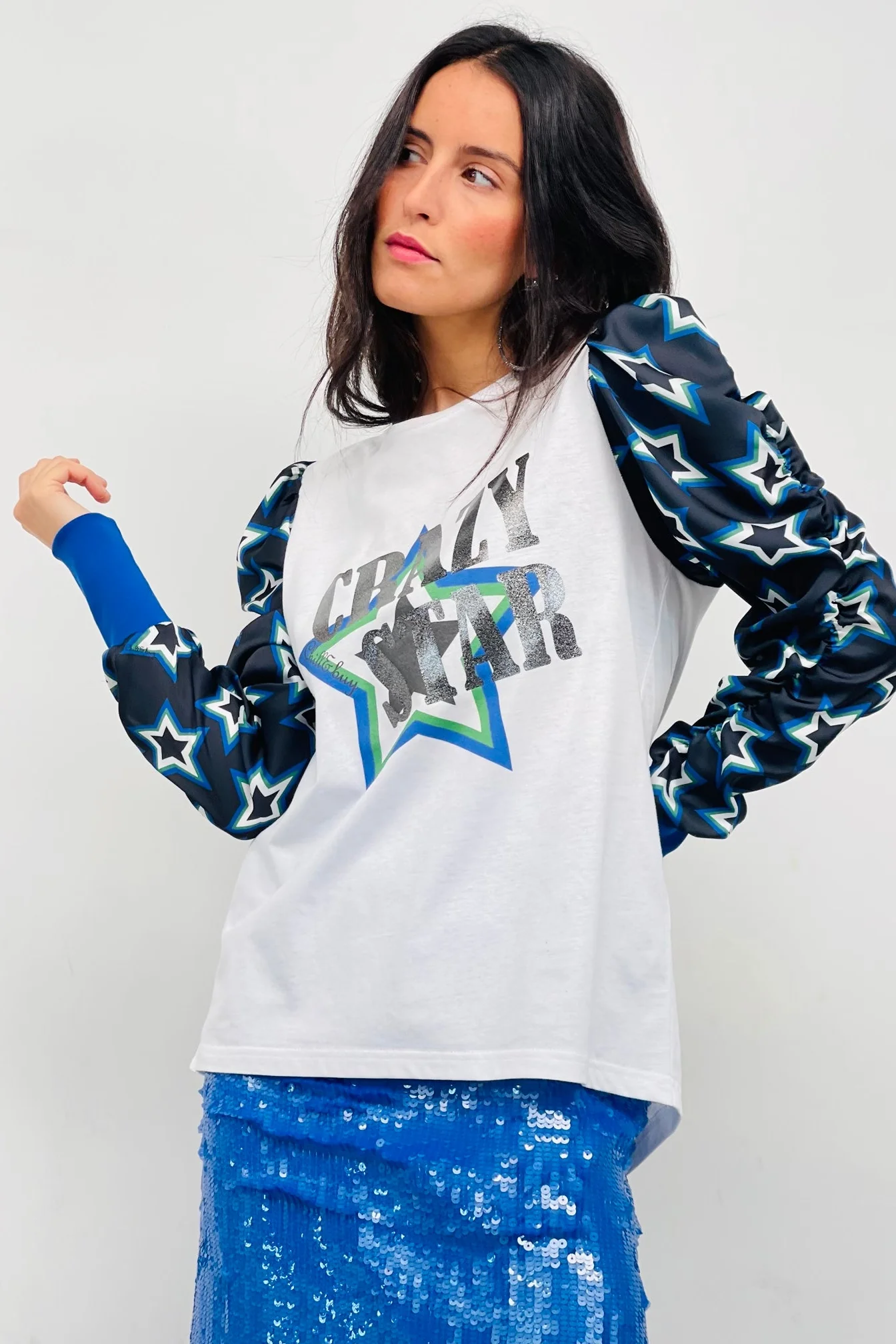 Camiseta de algodón en color blanco, con cuello redondo, corte evasé y bajo asimétrico. Detalle de manga larga abullonada con frunces y puño de rib en color azulón. Estampación frontal a contraste.