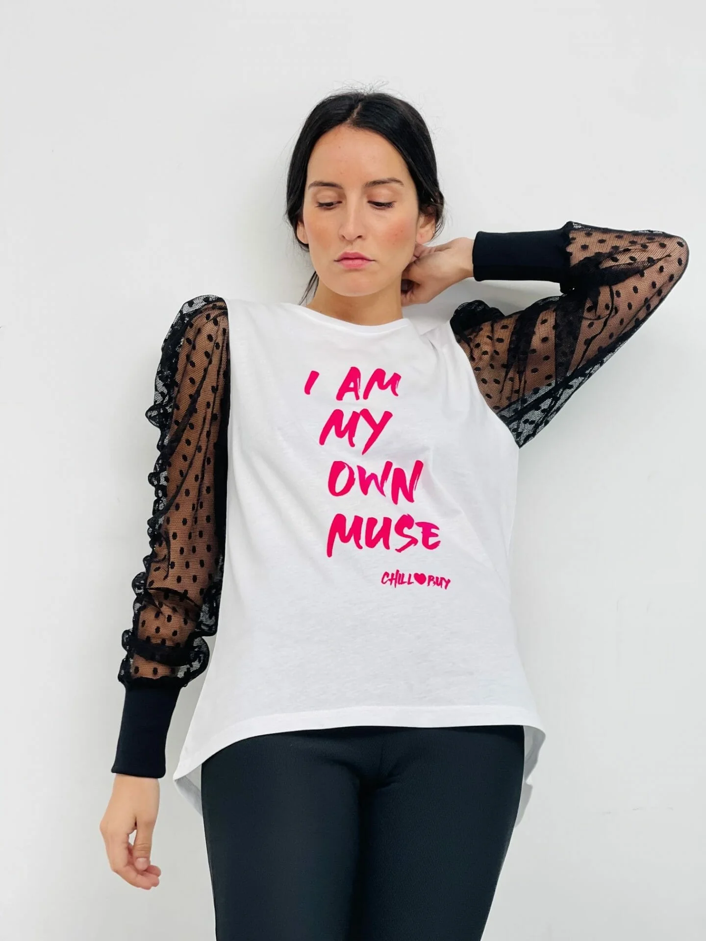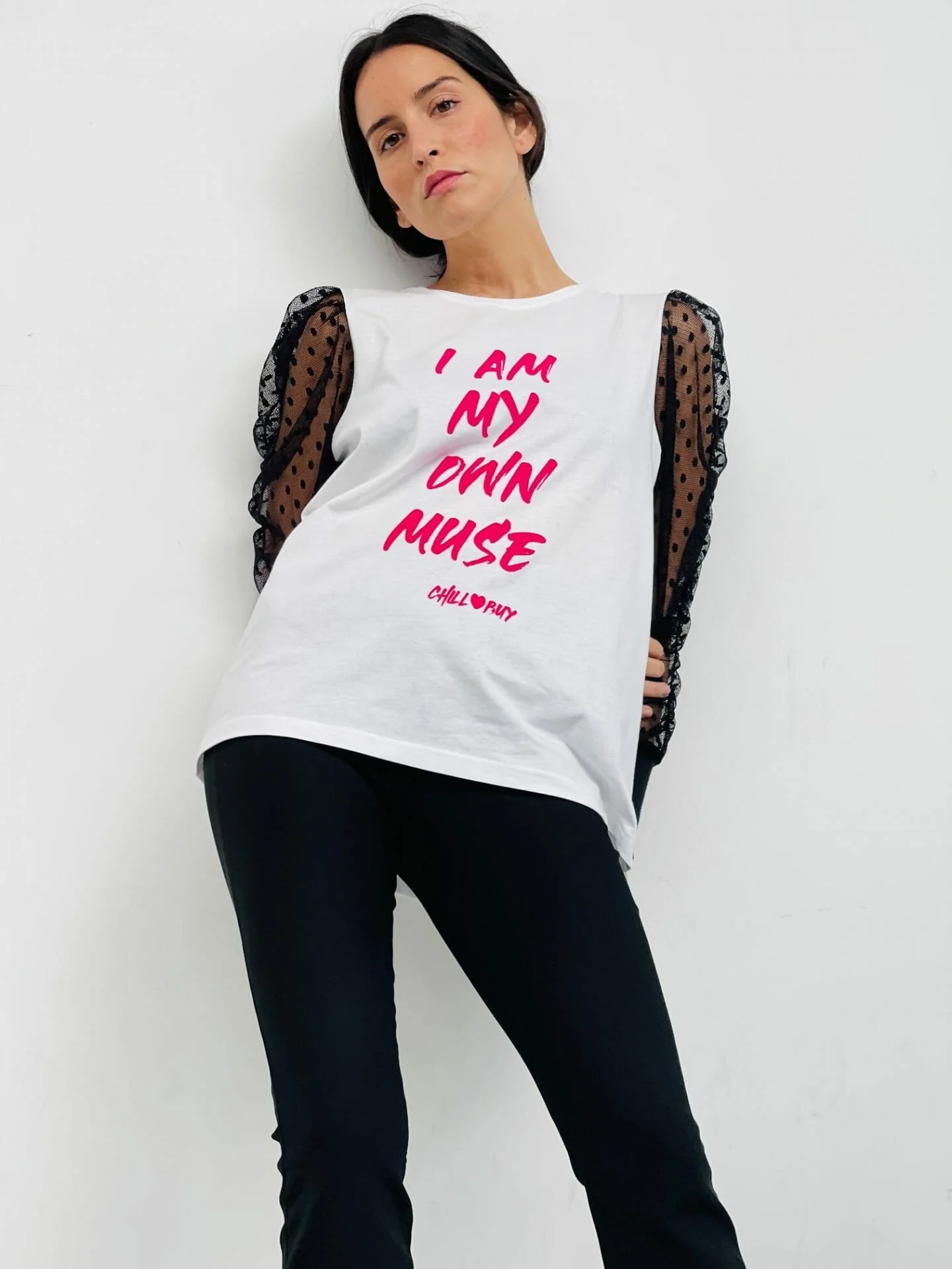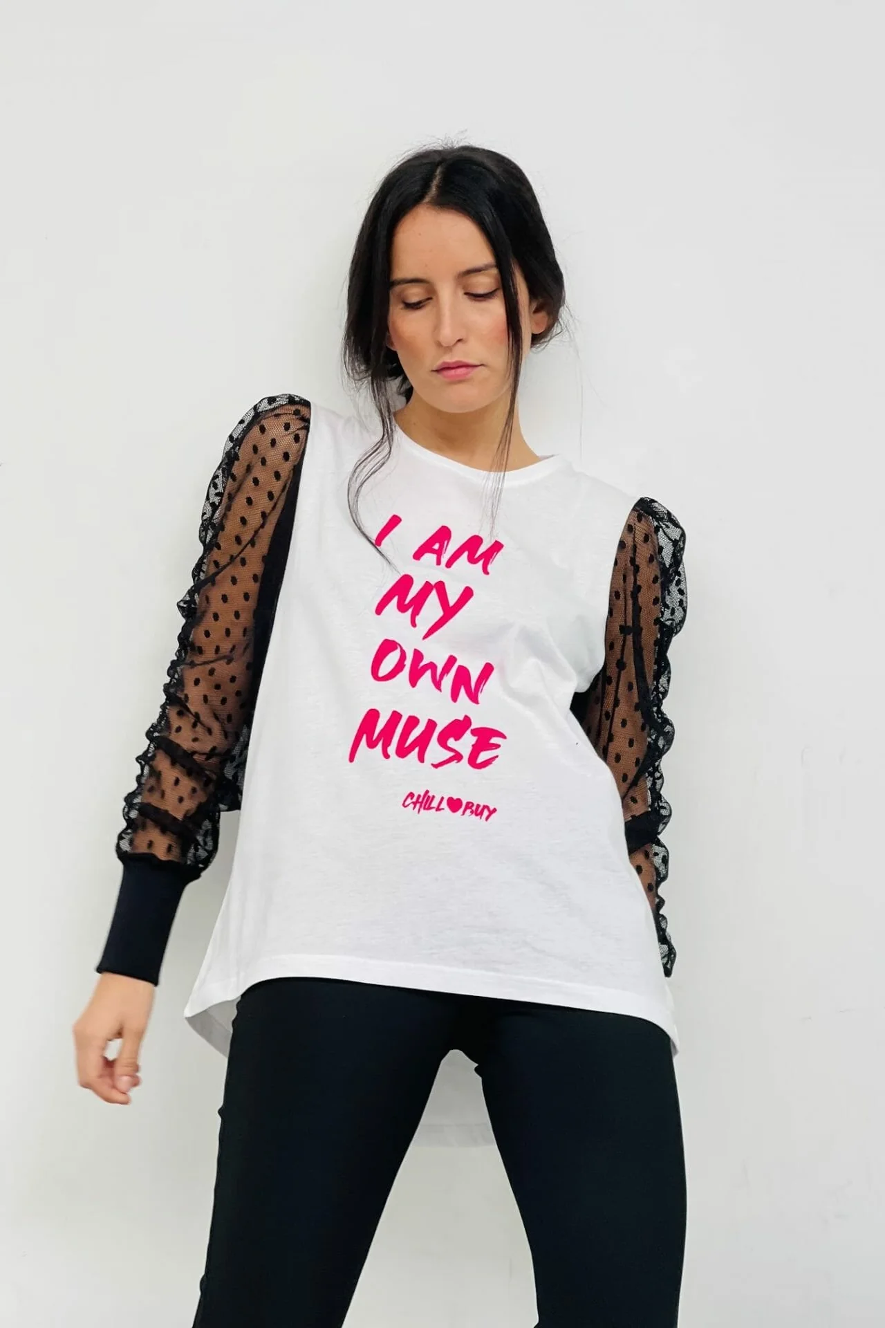 Camiseta de algodón, con cuello redondo, corte evasé y bajo asimétrico. Mangas abullonadas en tejido de tul con topitos y puño de rib en color negro. Estampación frontal en color rosa intenso.