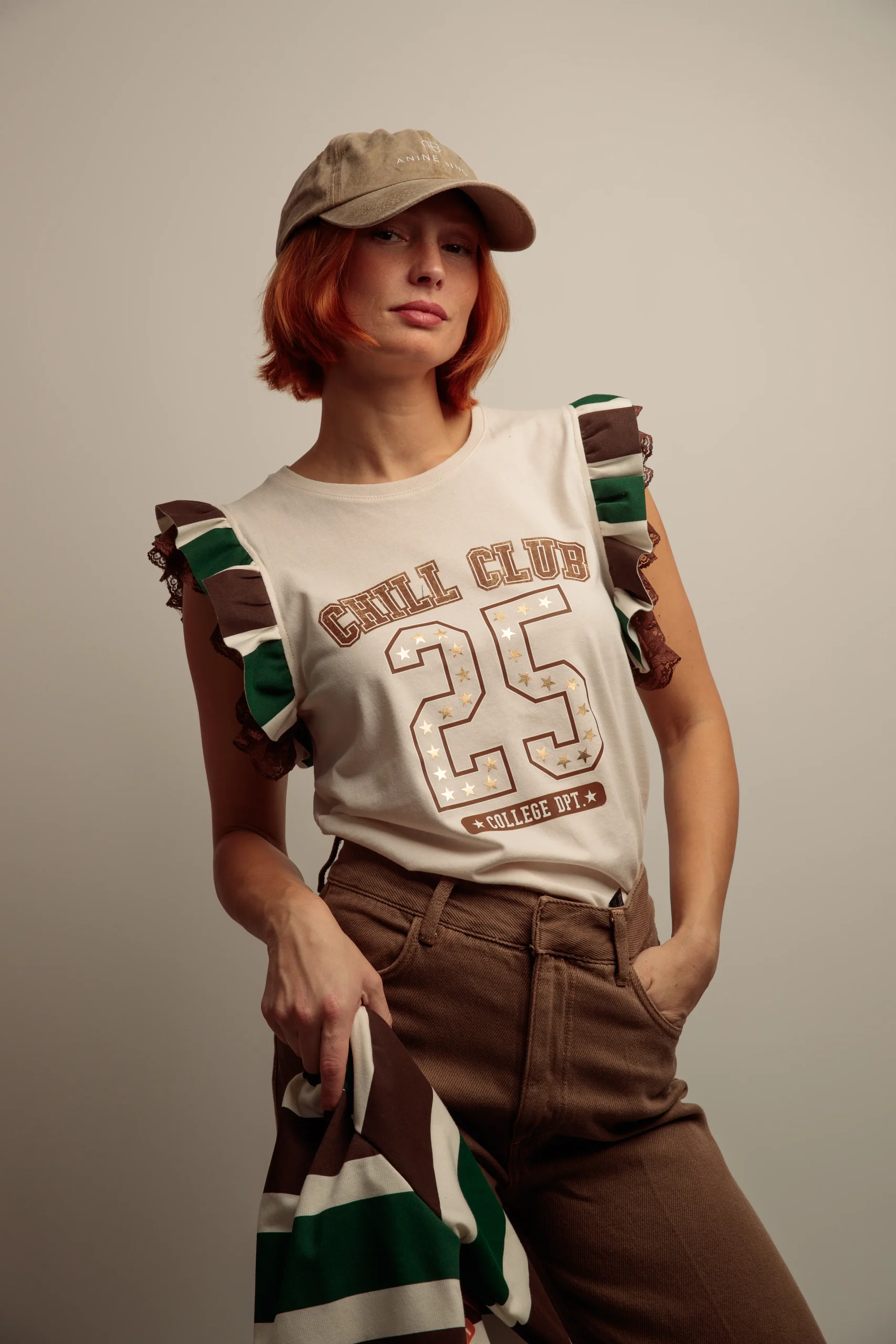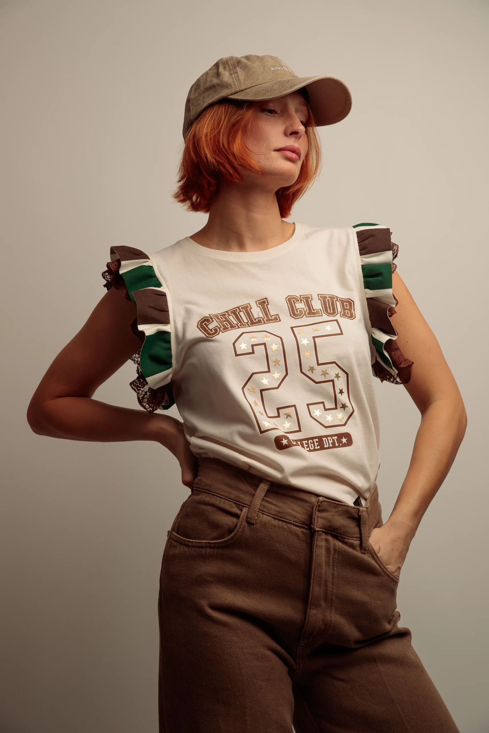 Camiseta de algodón en color beige, con cuello redondo, corte entallado y bajo recto. Detalle de volantes combinados en el hombro. Volante de punto en rayas y blonda de encaje en color marrón a contraste. Estampación frontal. Confeccionado en Vigo.