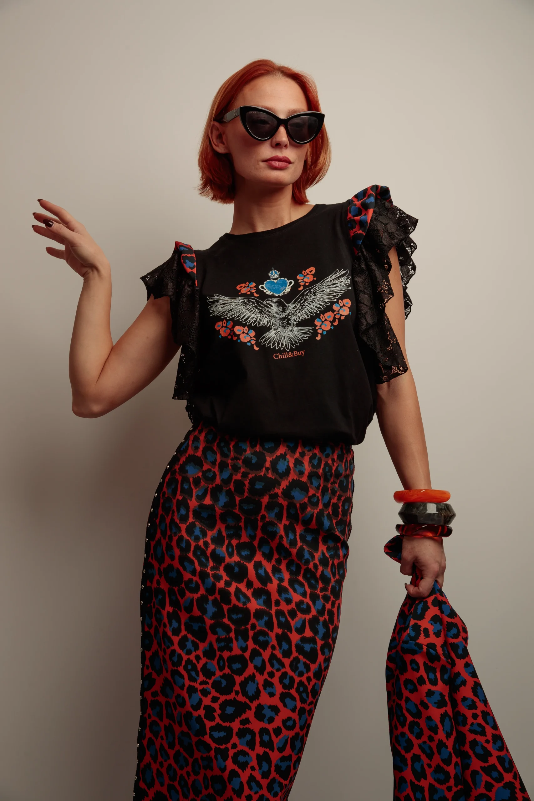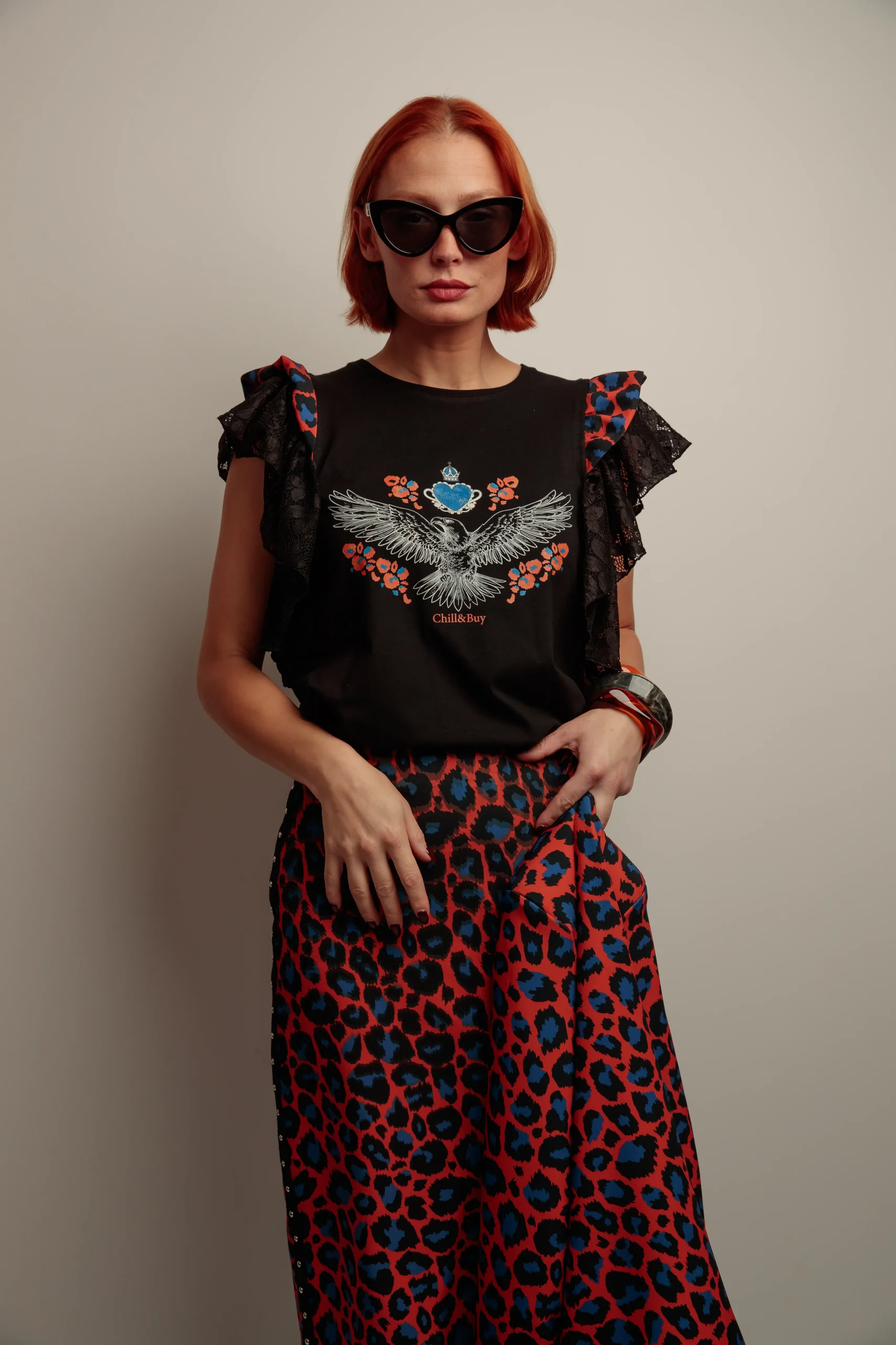 Camiseta de algodón en color negro, con cuello redondo, corte evasé y bajo asimétrico. Detalle de volantes en el hombro, uno de los volantes de encaje en color negro y un mini volante en tejido estampado animal print. Estampación frontal.