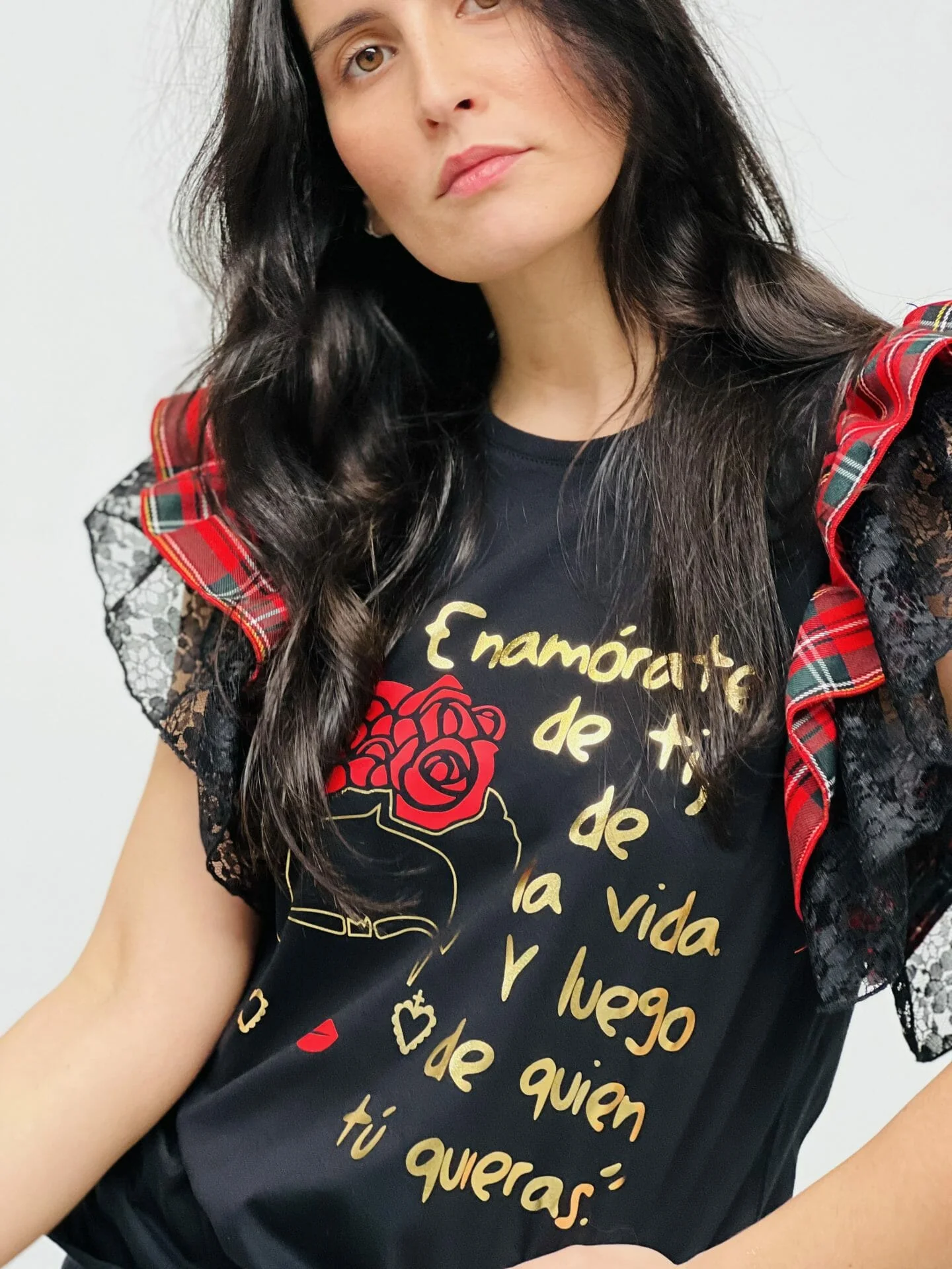 Camiseta de algodón con cuello redondo, corte evasé y bajo asimétrico, detalle de volantes de tejido de encaje y escoces rojo a contraste en la sisa. Estampación delantera.