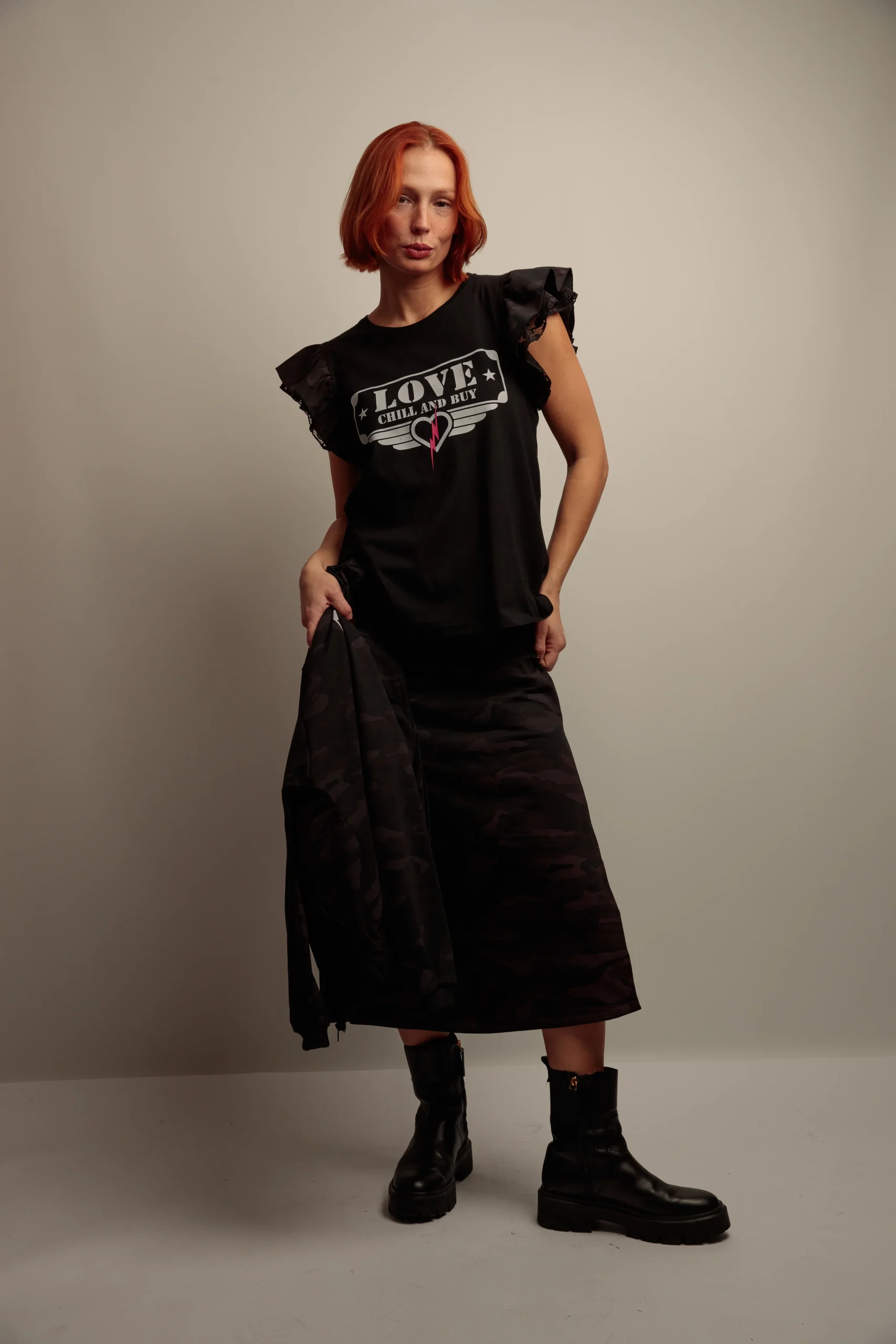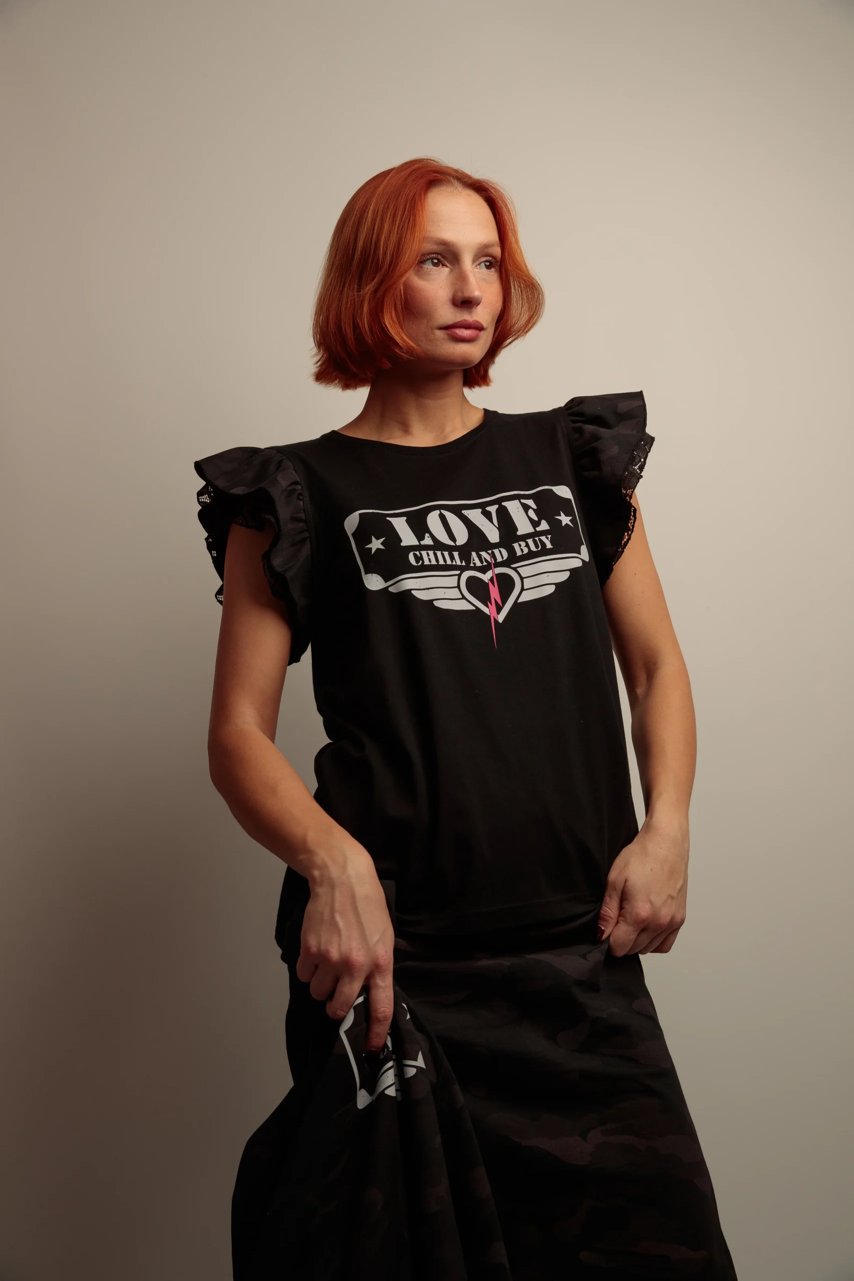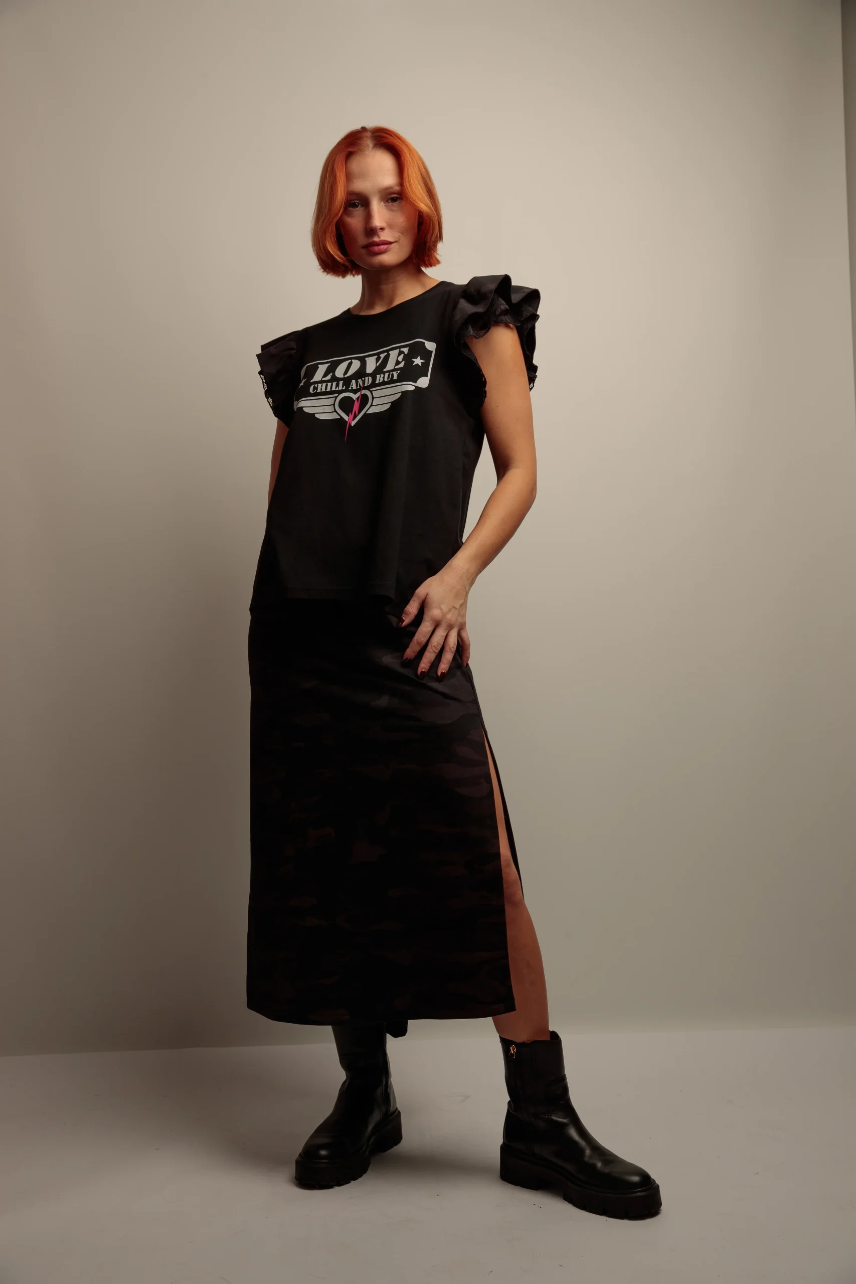Camiseta de algodón con cuello redondo, corte evasé y bajo asimétrico. Detalle de dos volantes combinados en el hombro, encaje y camuflaje negro. Estampación frontal a contraste.