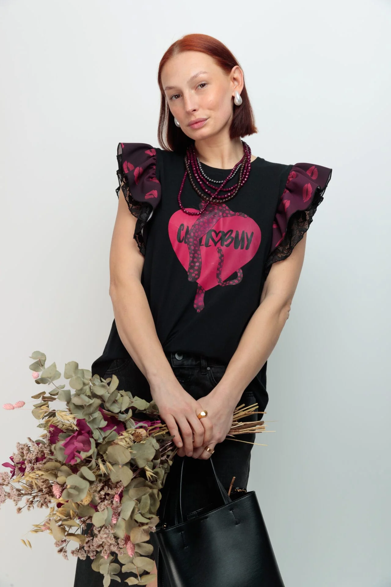 Camiseta de algodón en color negro con cuello redondo, corte evasé y bajo asimétrico. Detalle de manga corta con dos volantes en tejidos combinados, confeccionado en tejido encaje negro y otro estampado. Estampación frontal.