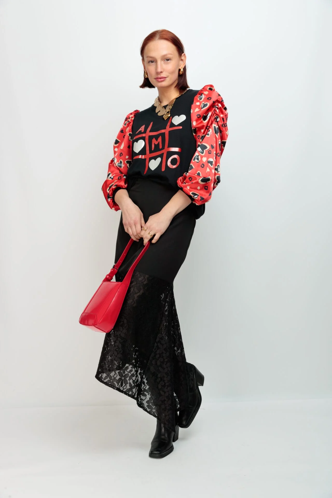 Camiseta de algodón en color negro, con cuello redondo, corte evasé y bajo asimétrico. Detalle de mangas abullonadas con frunces y acabadas con puño de terciopelo en color negro. Estampación frontal.