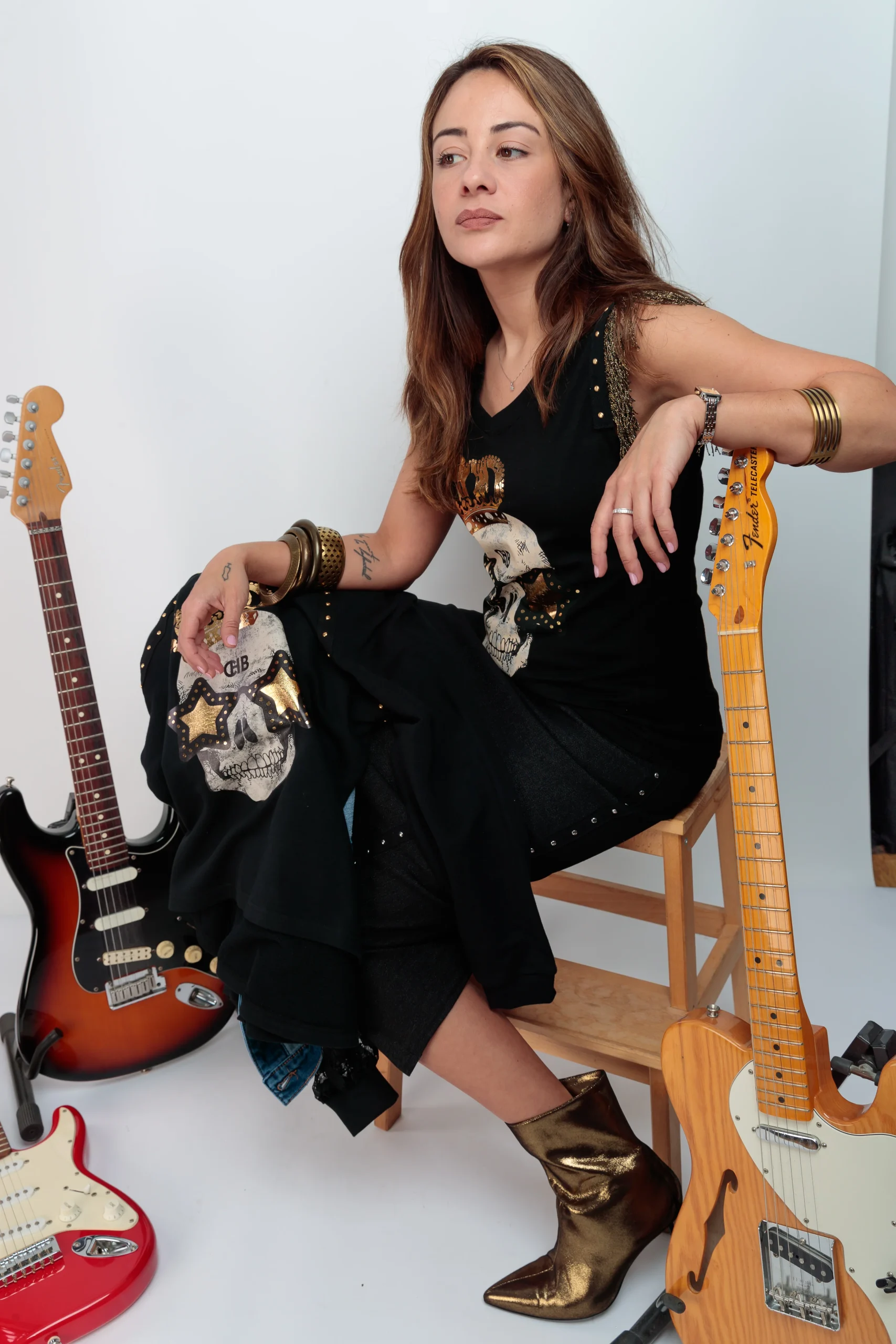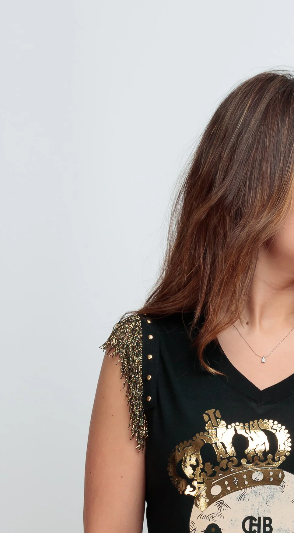 Camiseta de algodón, cuello pico, corte recto. Detalle de flecos con tachuelas en las sisas. Estampación frontal.
