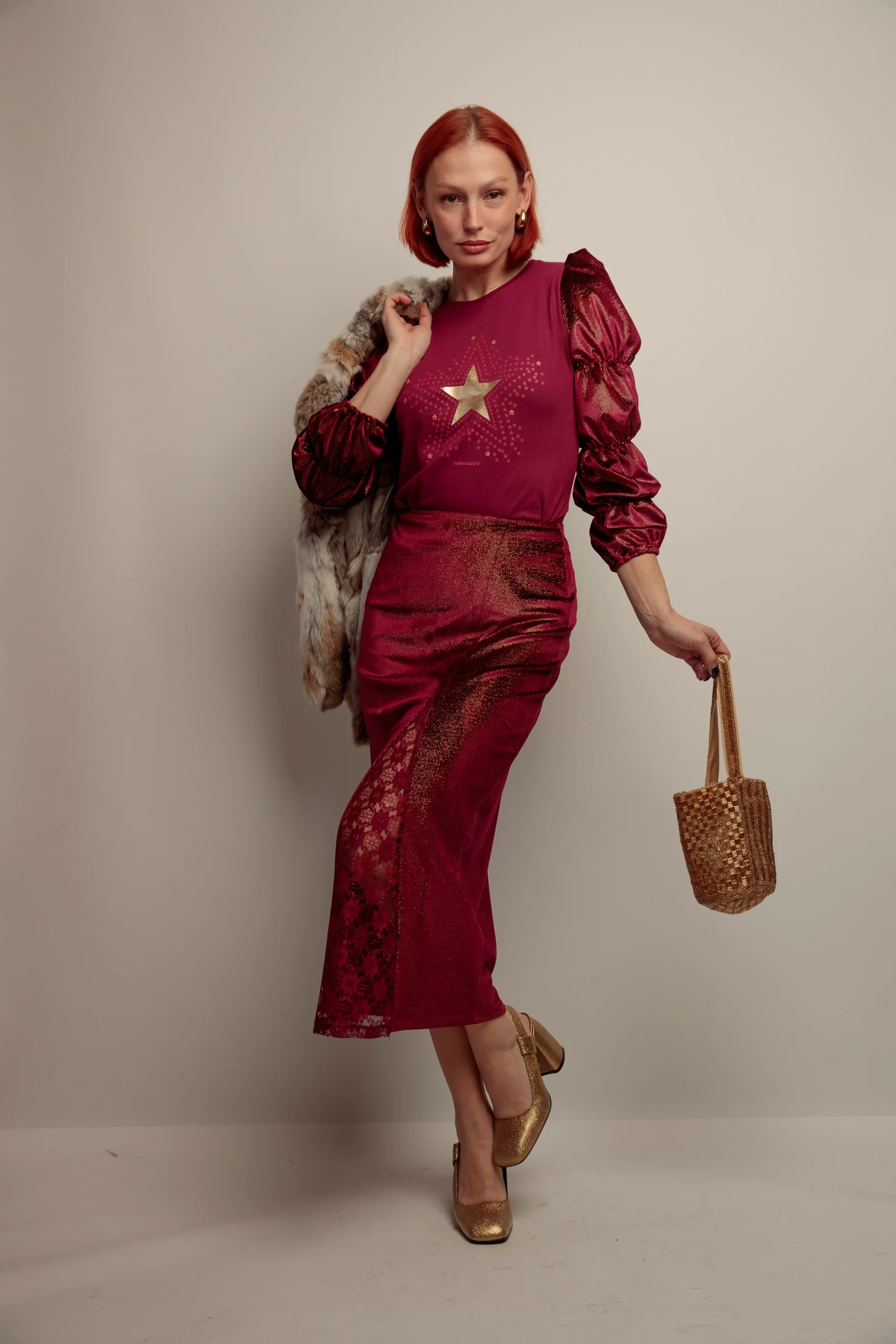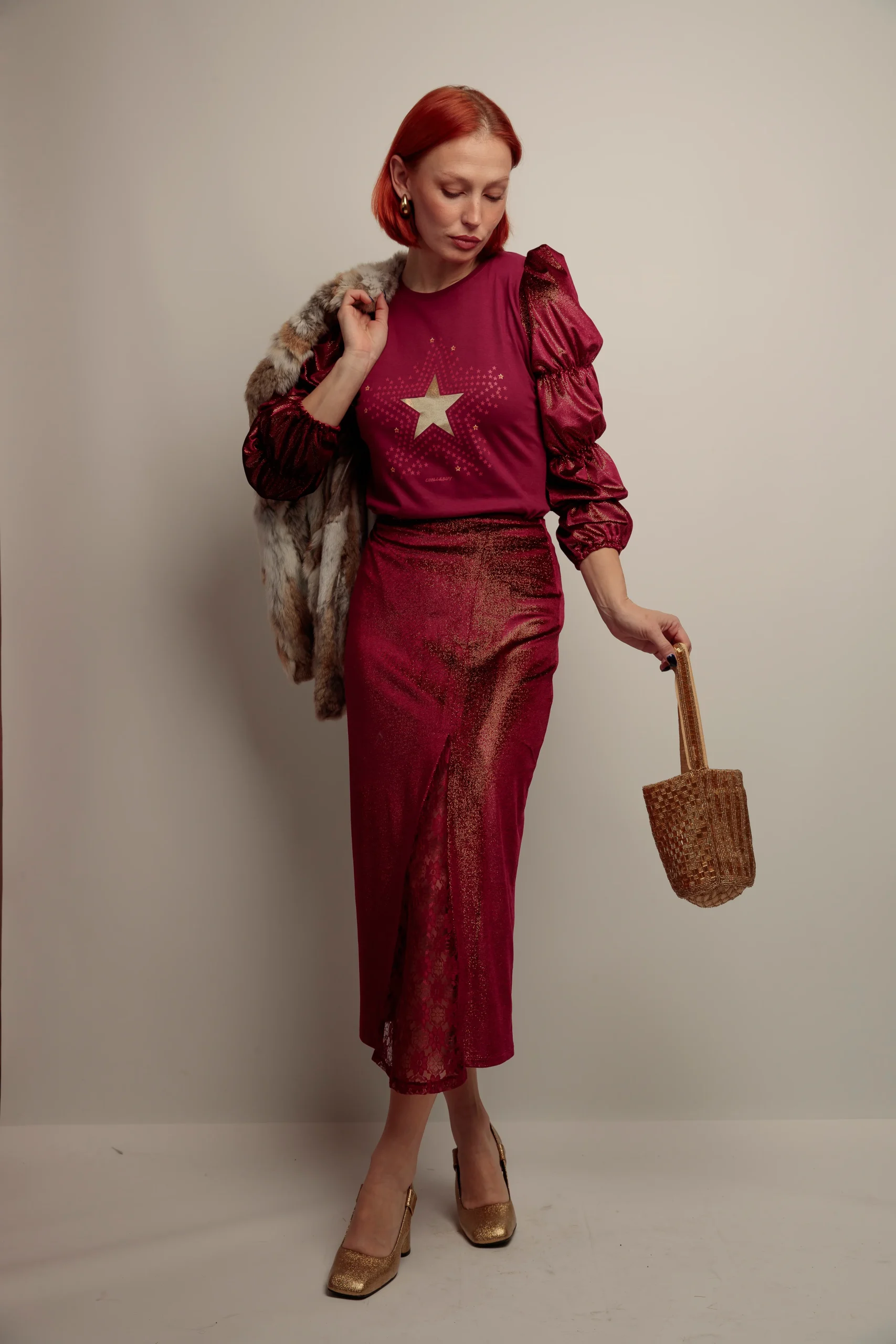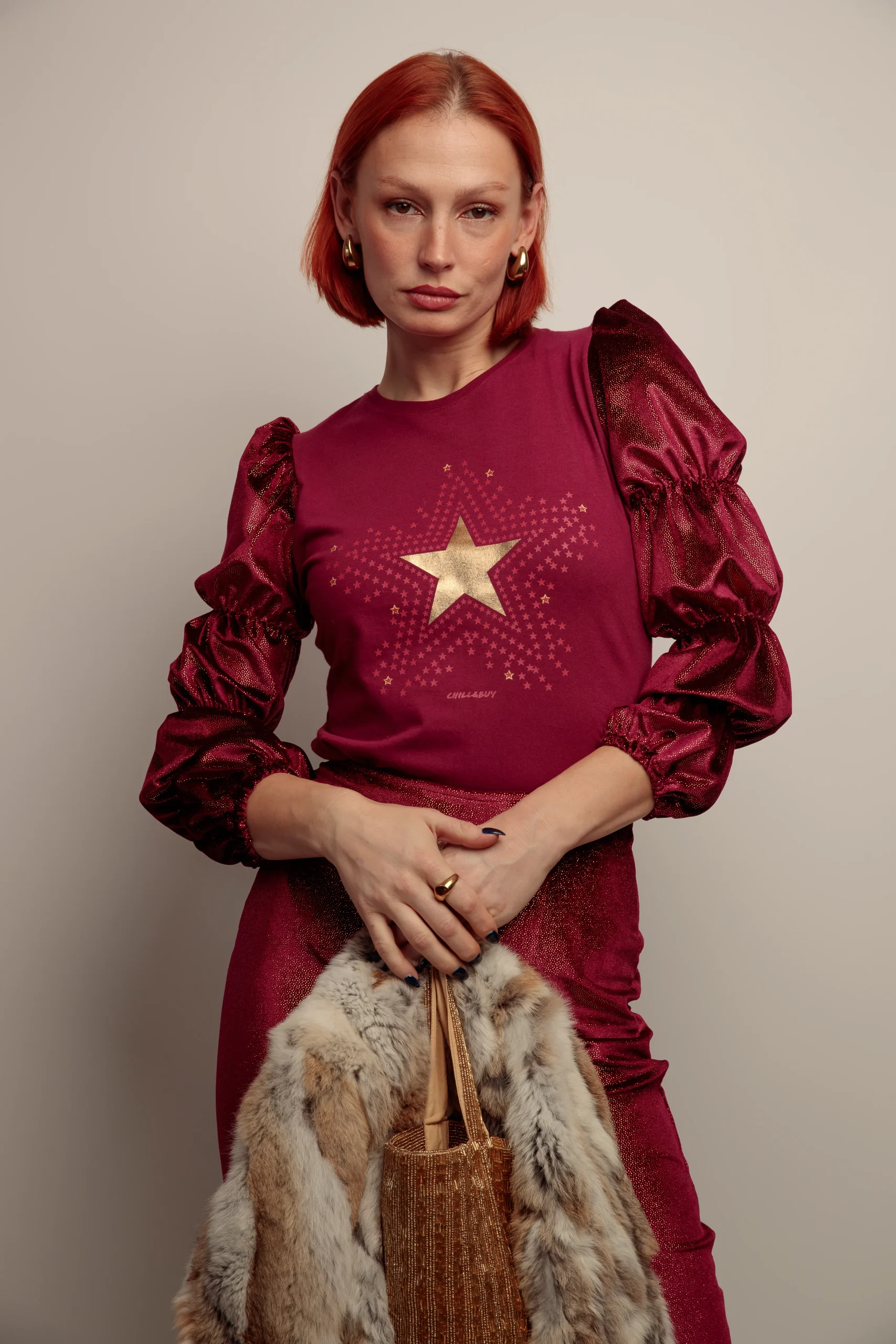 Camiseta de algodón en color granate, con cuello redondo, corte entallado y bajo recto. Detalle de manga larga abullonada con frunces, confeccionadas en tejido terciopelo granate. Estampación frontal a contraste.