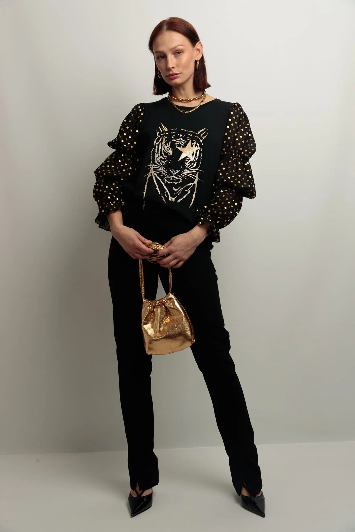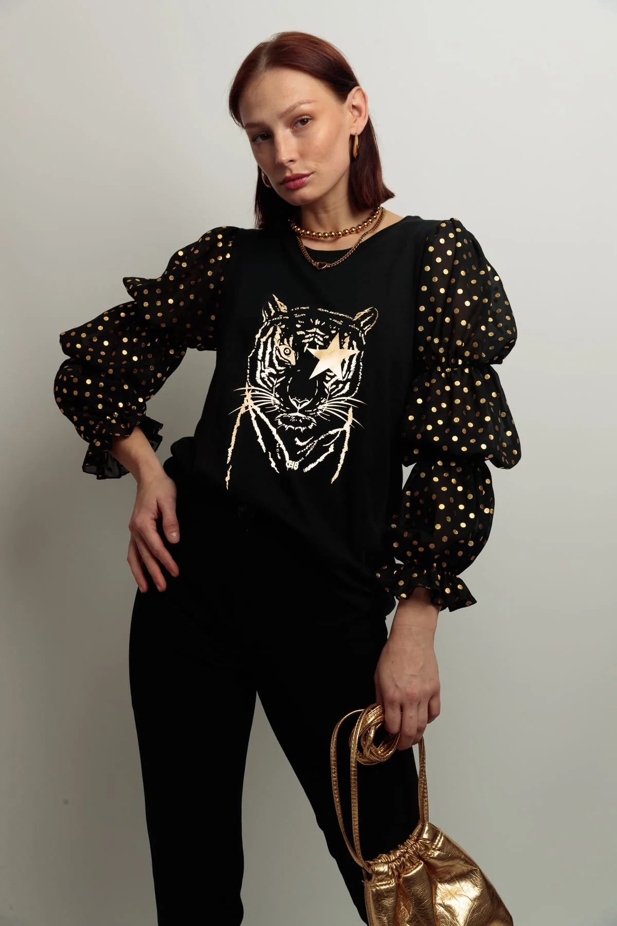 Camiseta de algodón, con cuello redondo, corte evase y bajo asimétrico. Detalle de mangas abullonadas con frunces en base negra con topitos dorados. Estampación frontal a contraste.