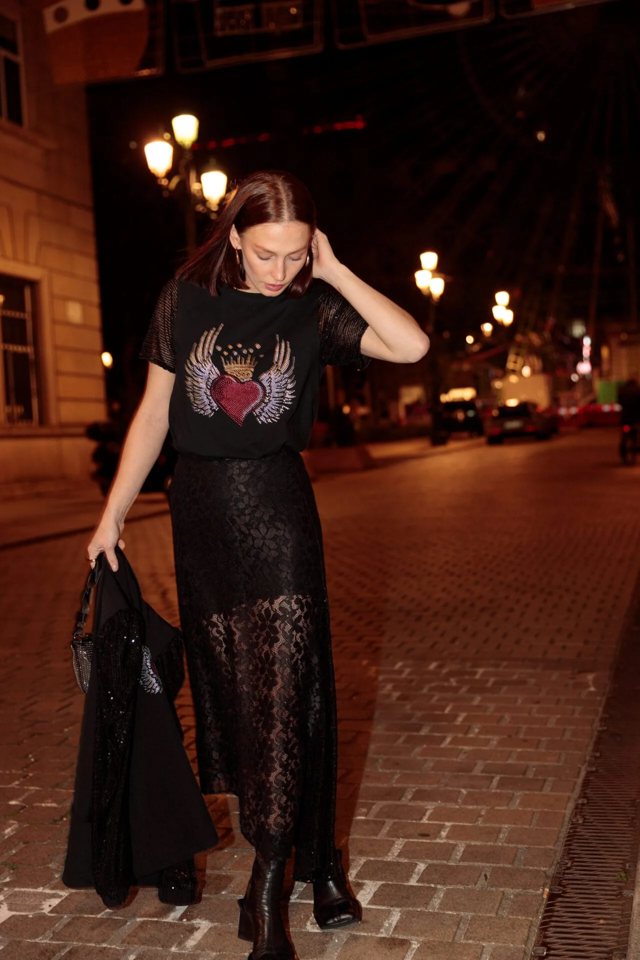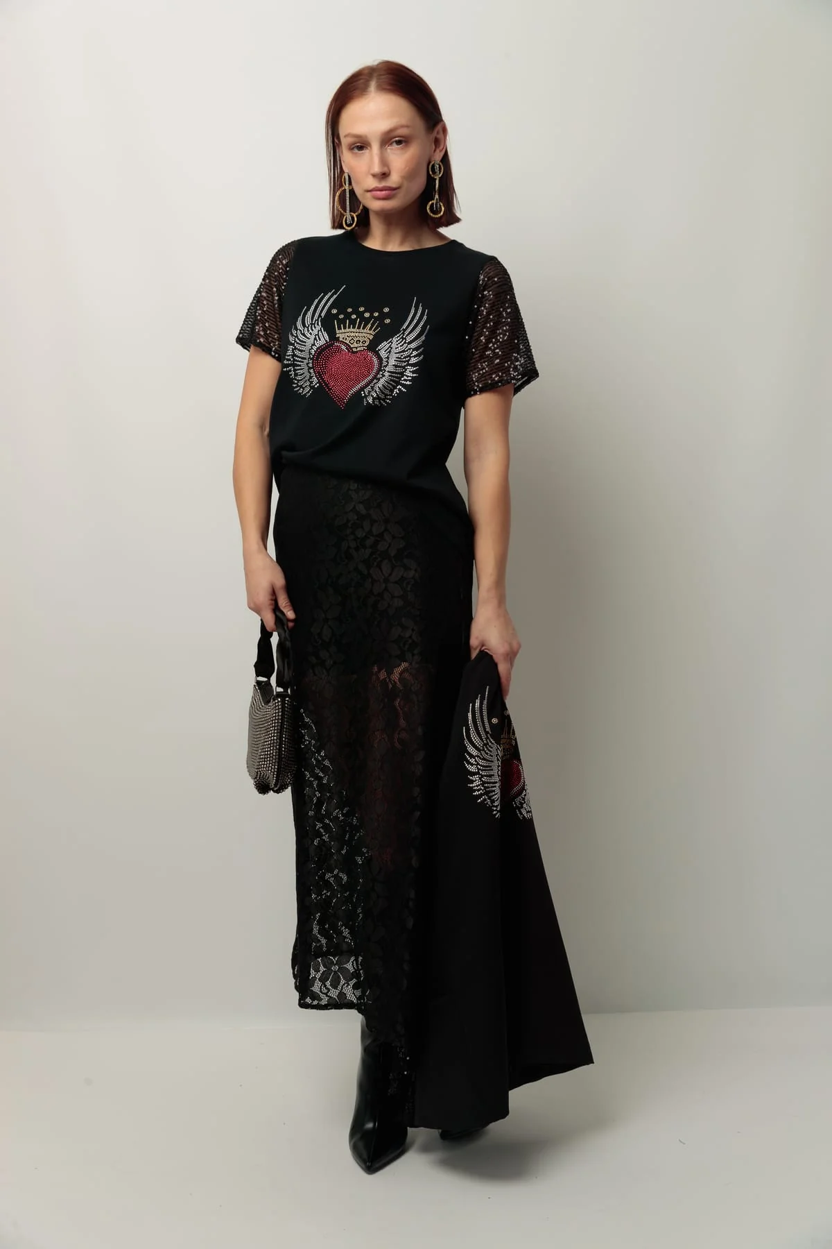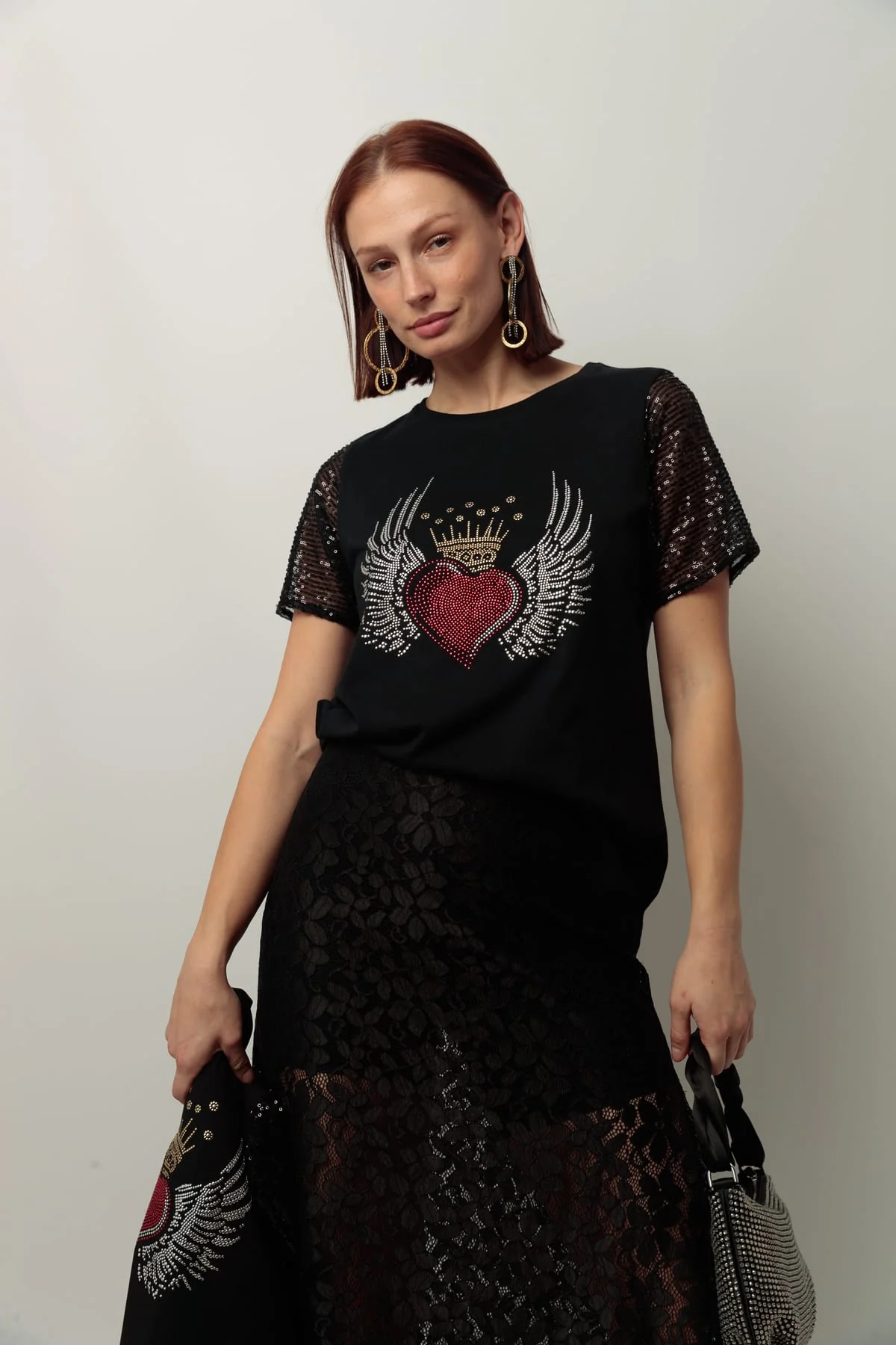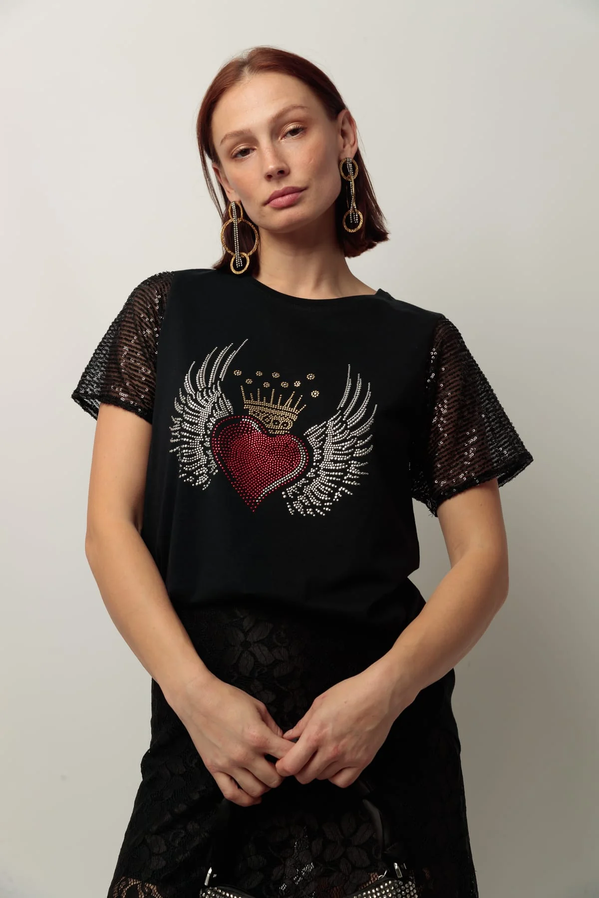 Camiseta de algodón, con cuello redondo, corte evasé y bajo asimétrico. Detalle de mangas de lentejuelas en color negro. Estampación frontal en strass.