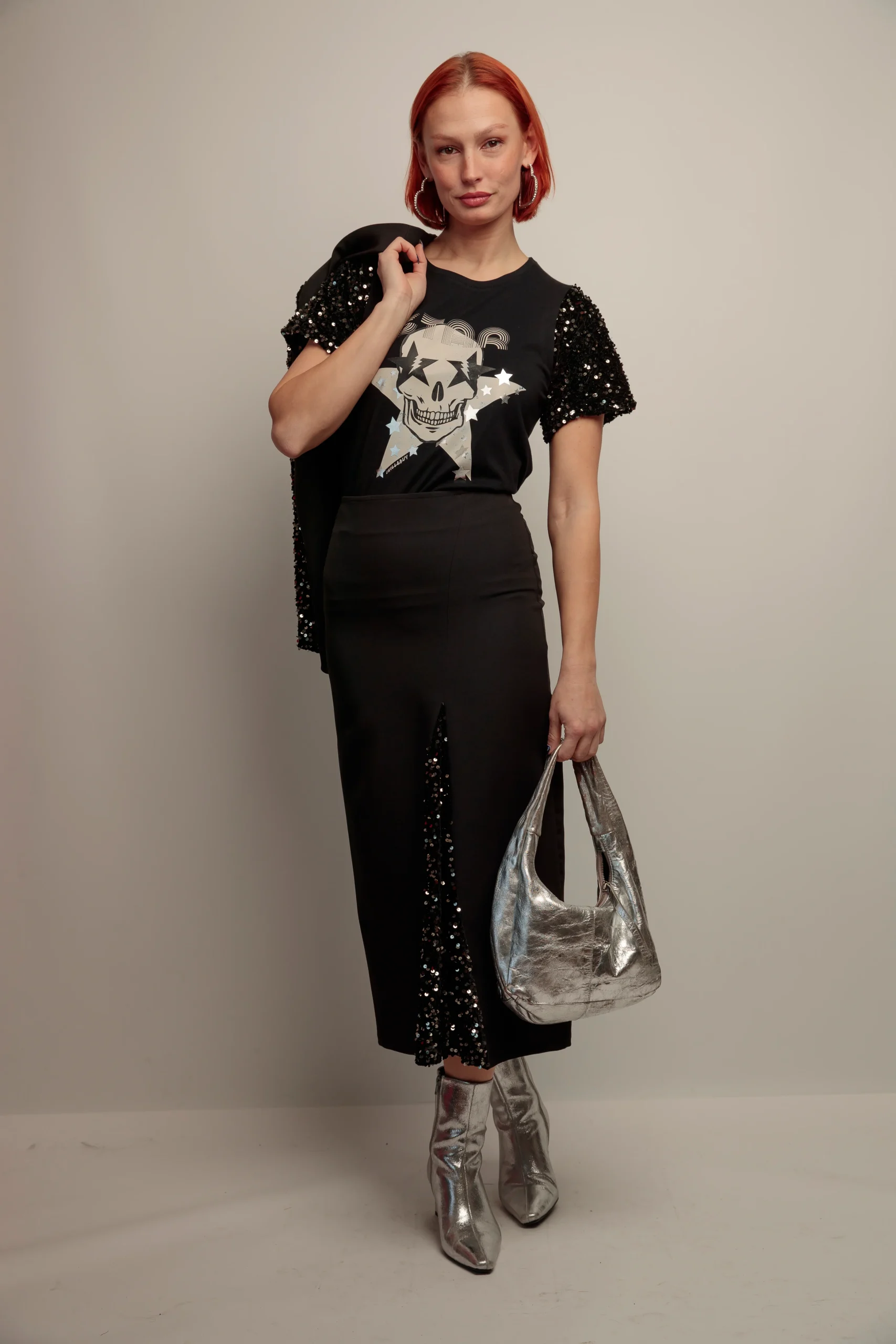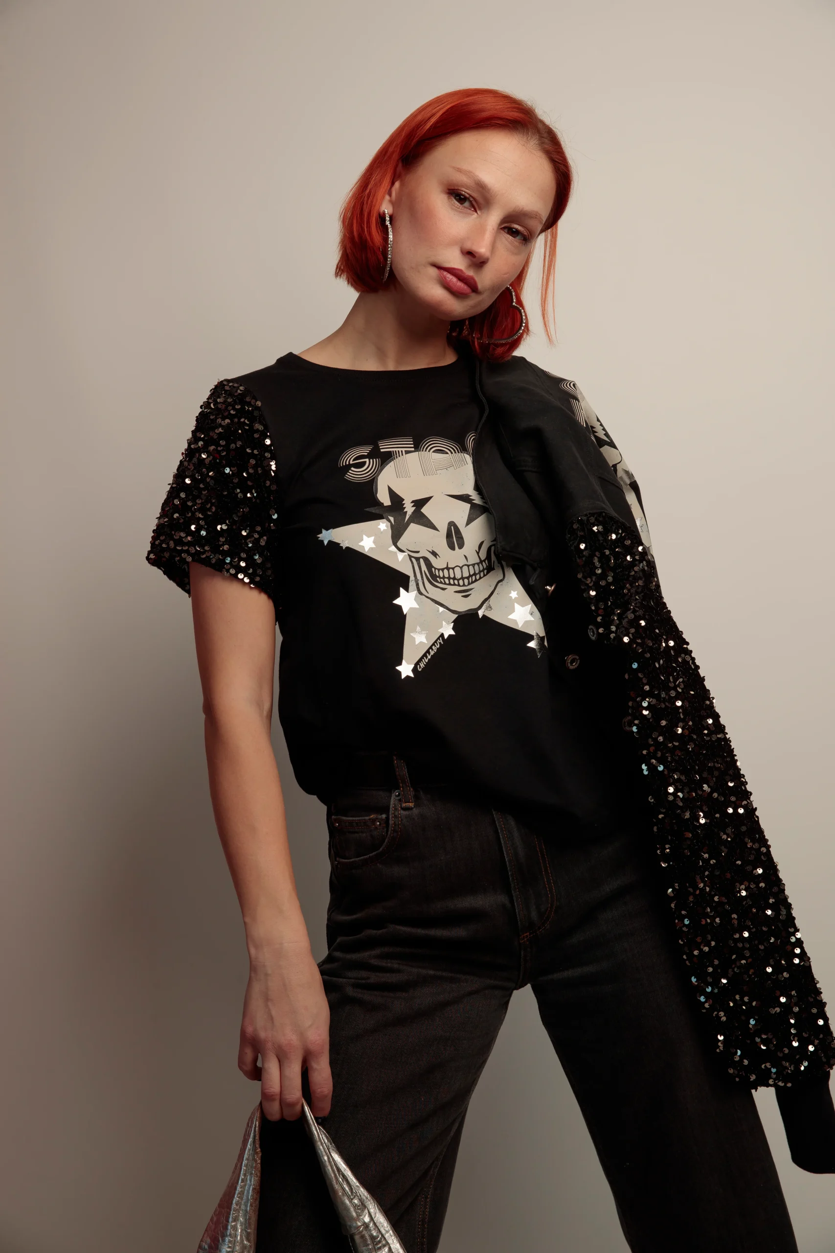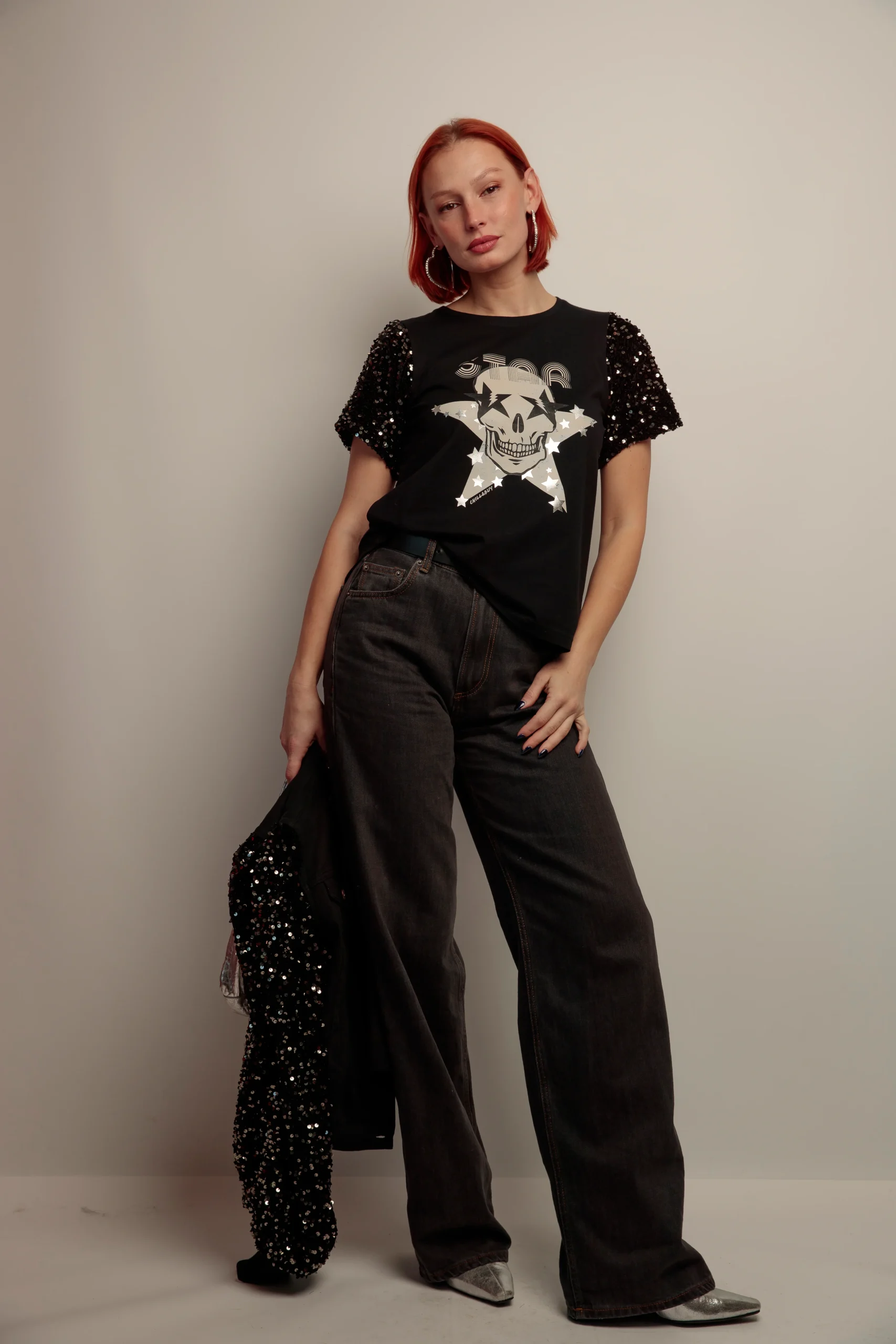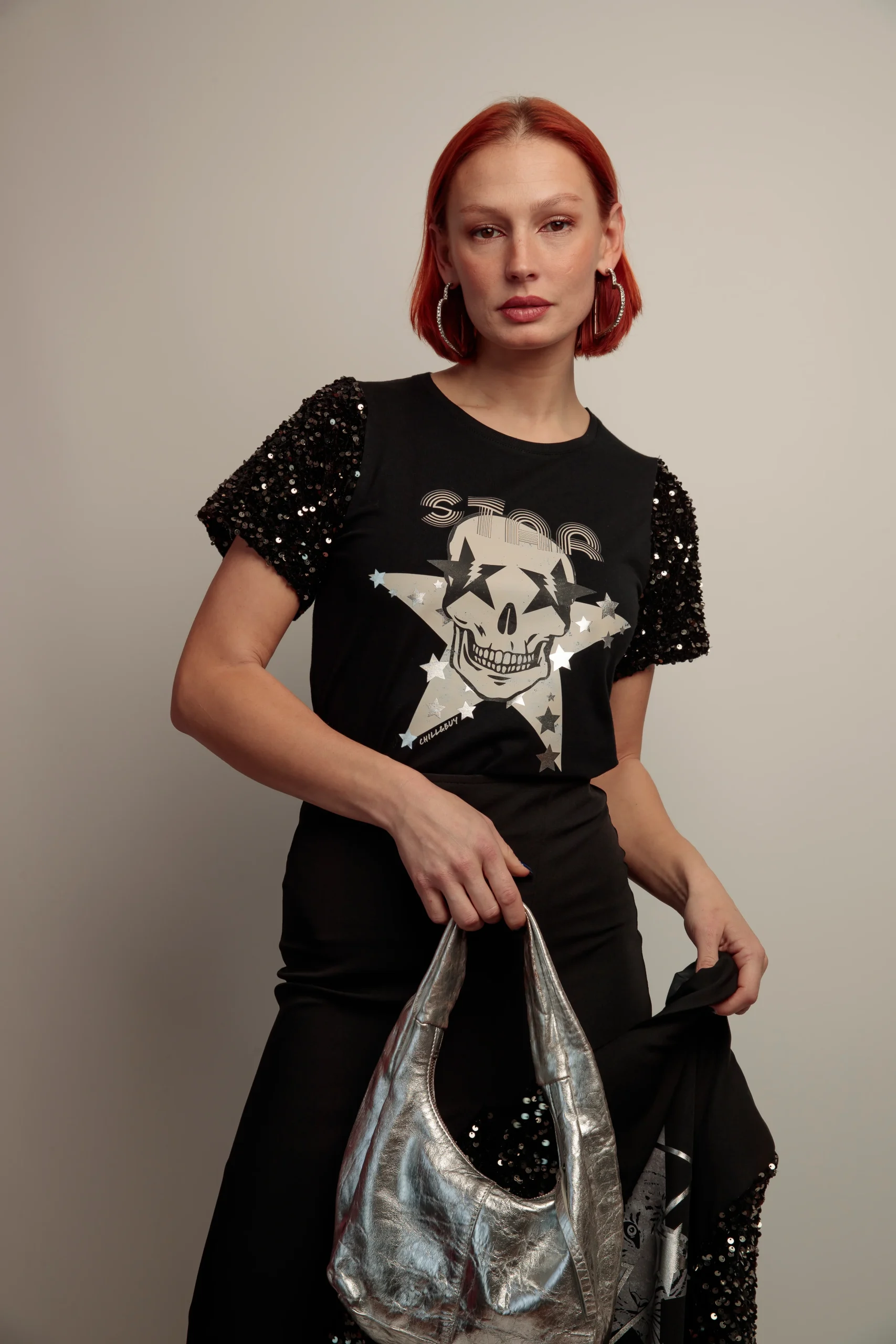 Camiseta de algodón, con cuello redondo, corte evasé y bajo asimétrico. Detalle de mangas de lentejuelas en color negro. Estampación frontal con detalles plateados.