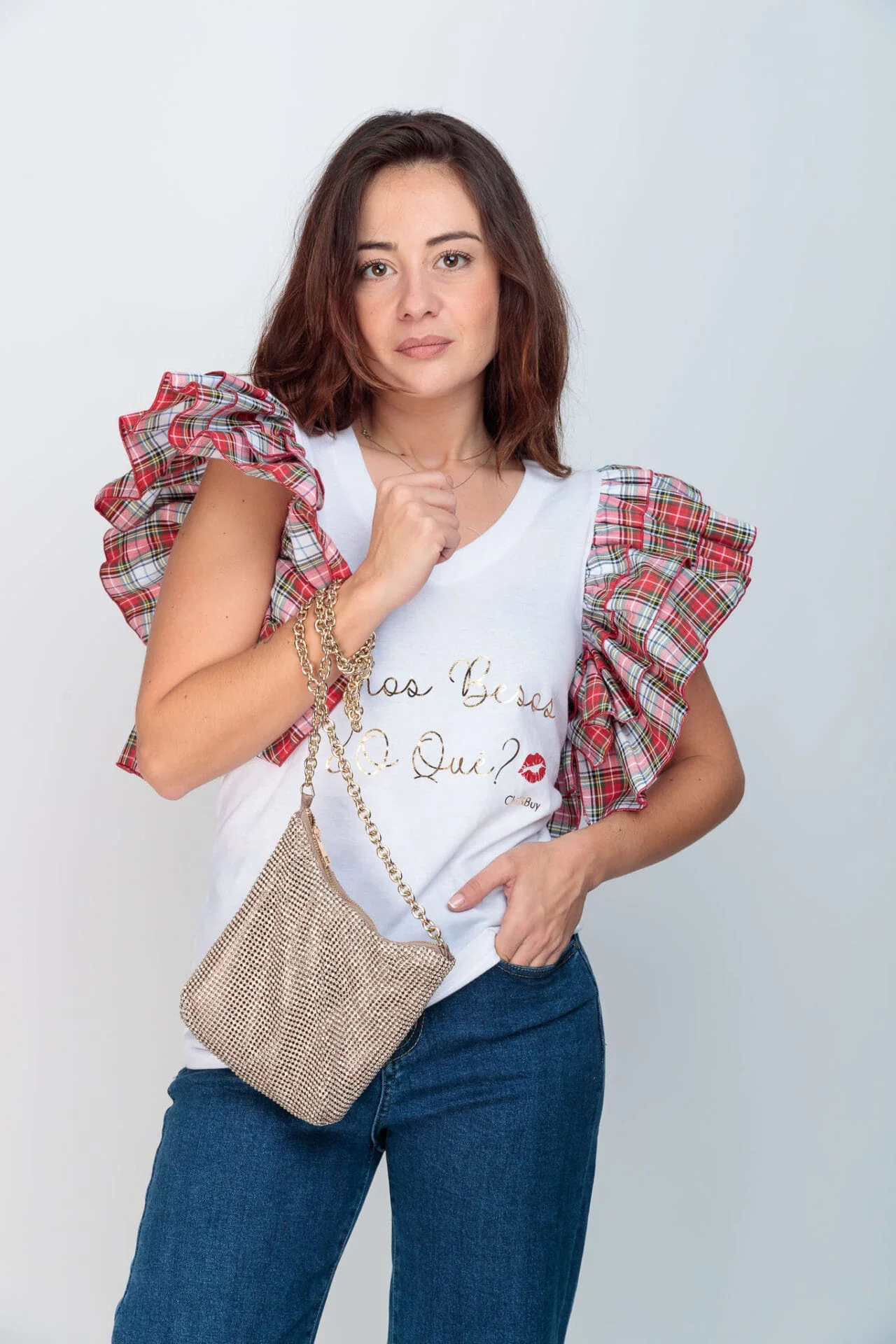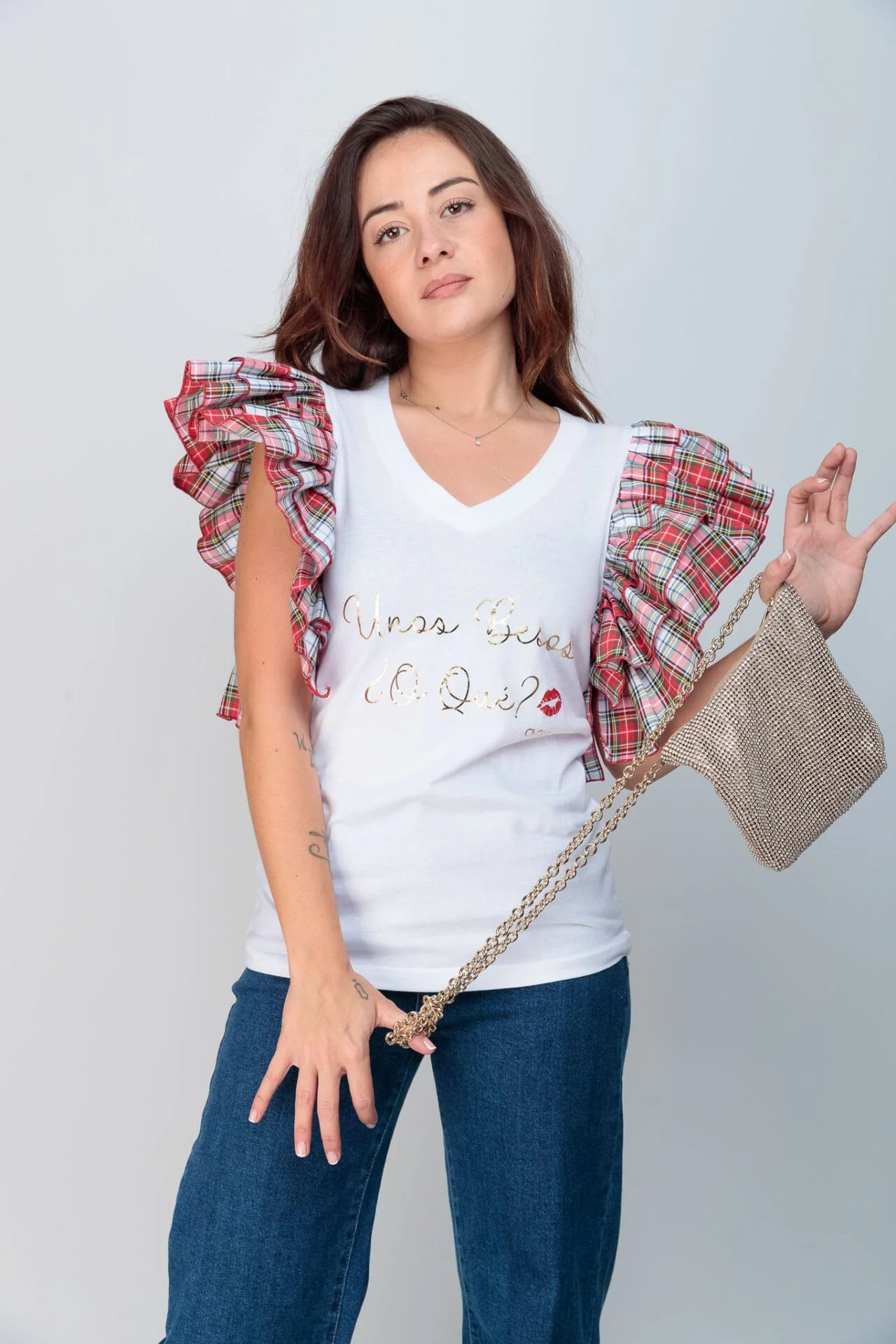 Camiseta blanca de algodón, con cuello pico y corte recto. Detalla de volantes de cuadros en la manga. Estampación frontal en color dorado.