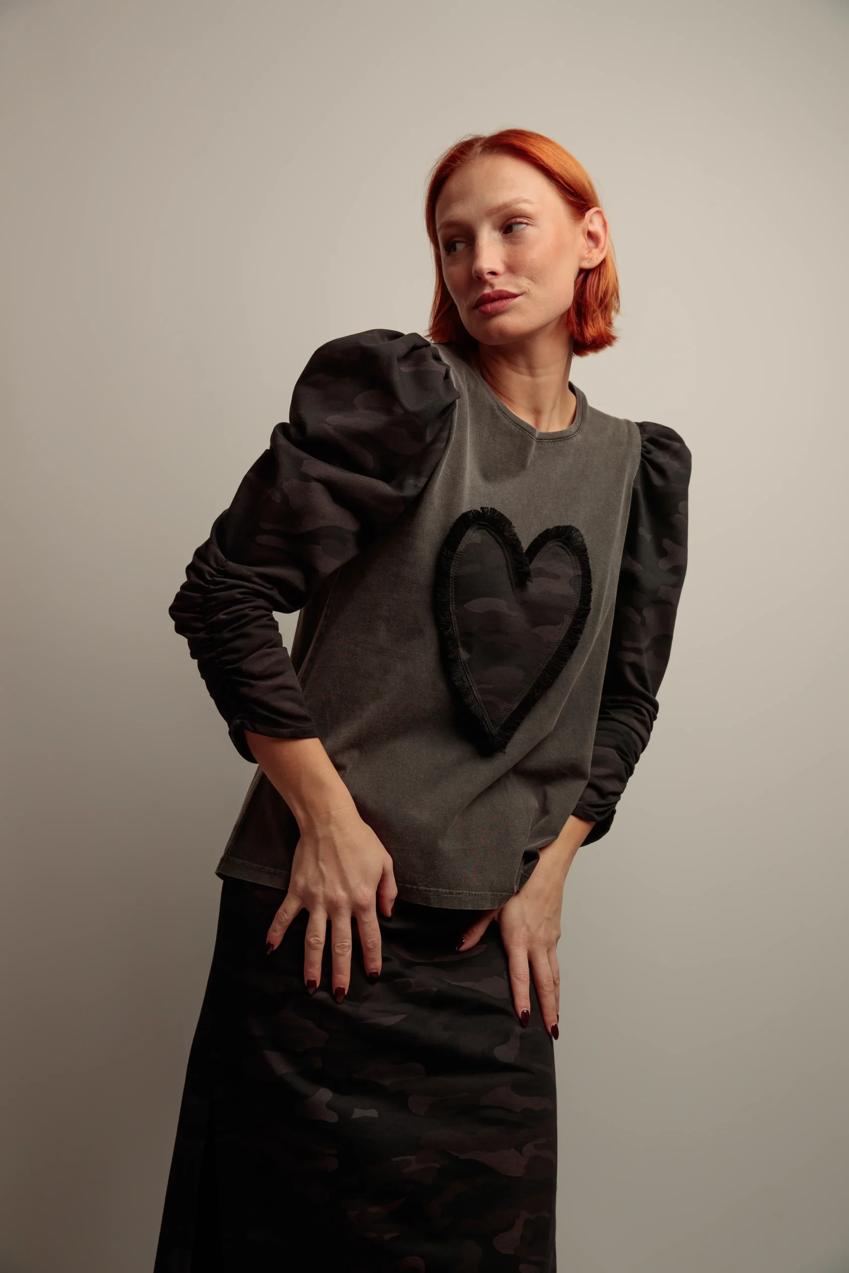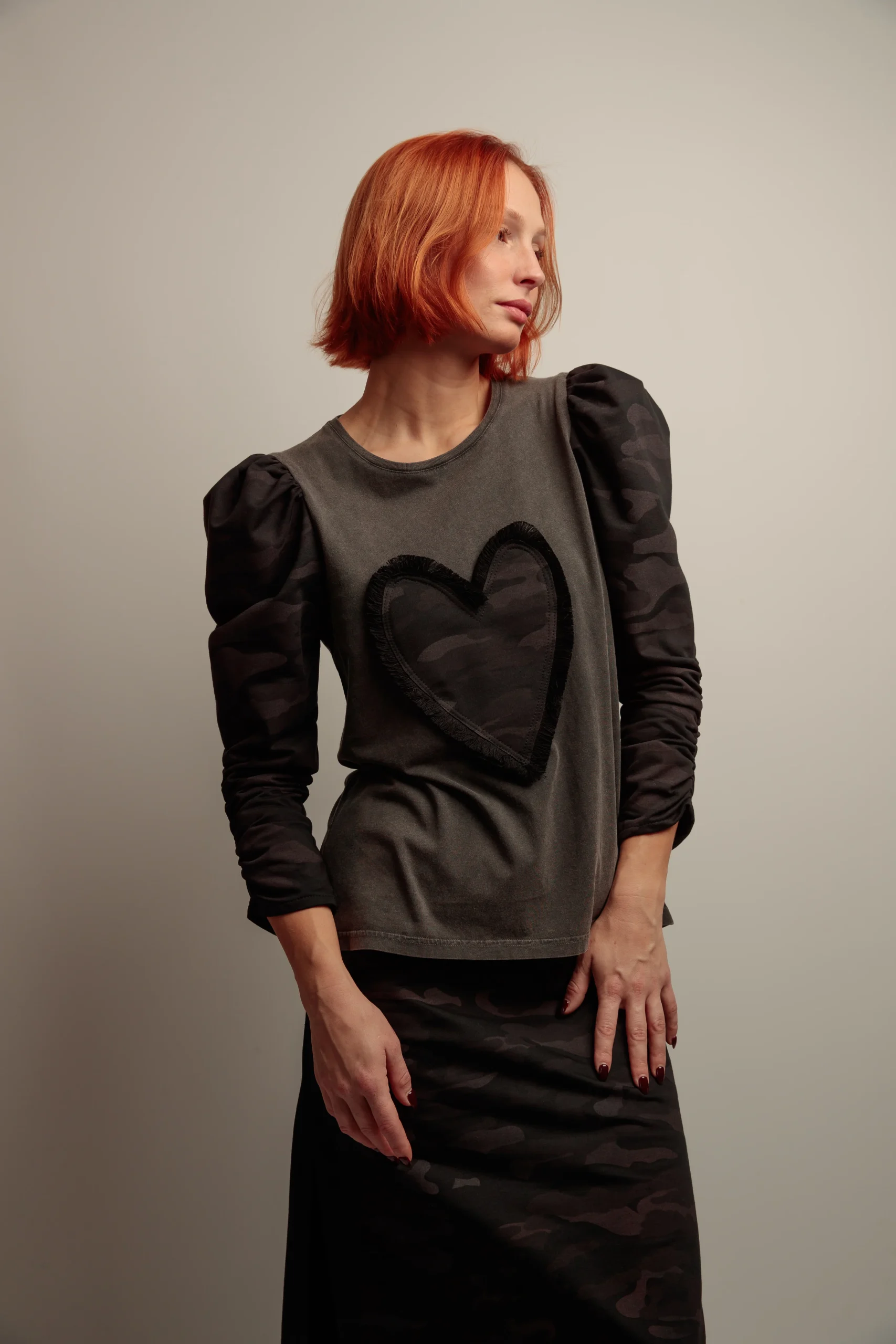 Camiseta cuello redondo lavada en color negro, con corte evasé y bajo asimétrico. Detalle de manga larga abullonada en tejido estampado camuflaje negro con tonos grises. Diseño de corazón de tejido camuflaje rematada con flecos negros en el frontal. Confeccionada en Vigo.