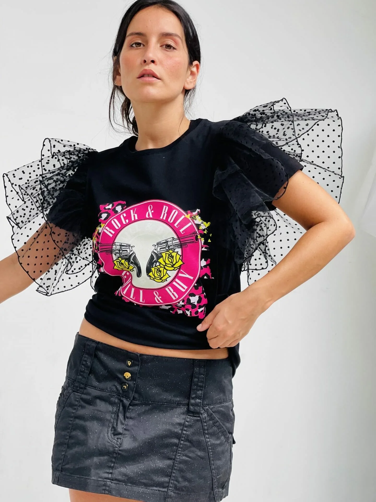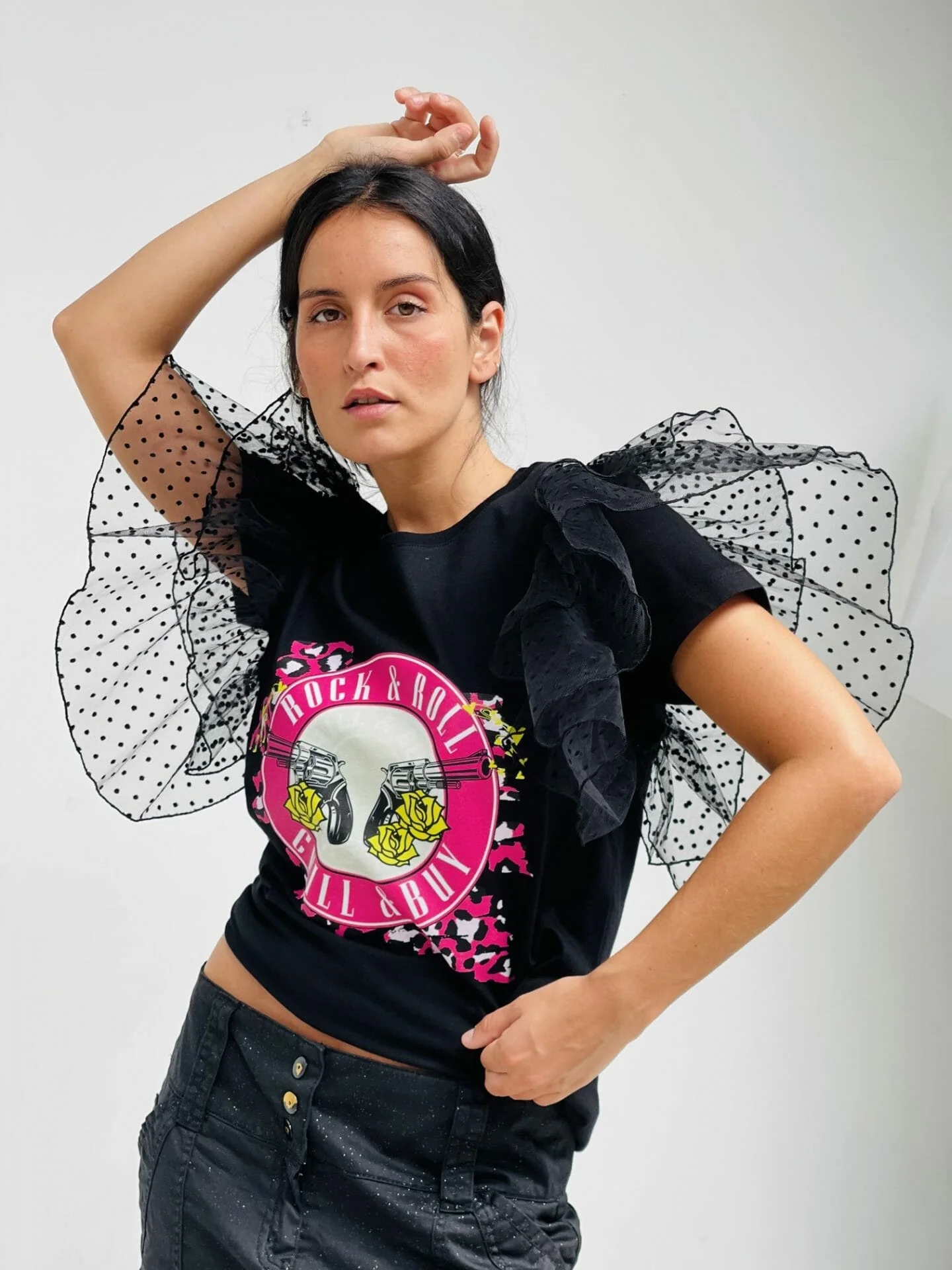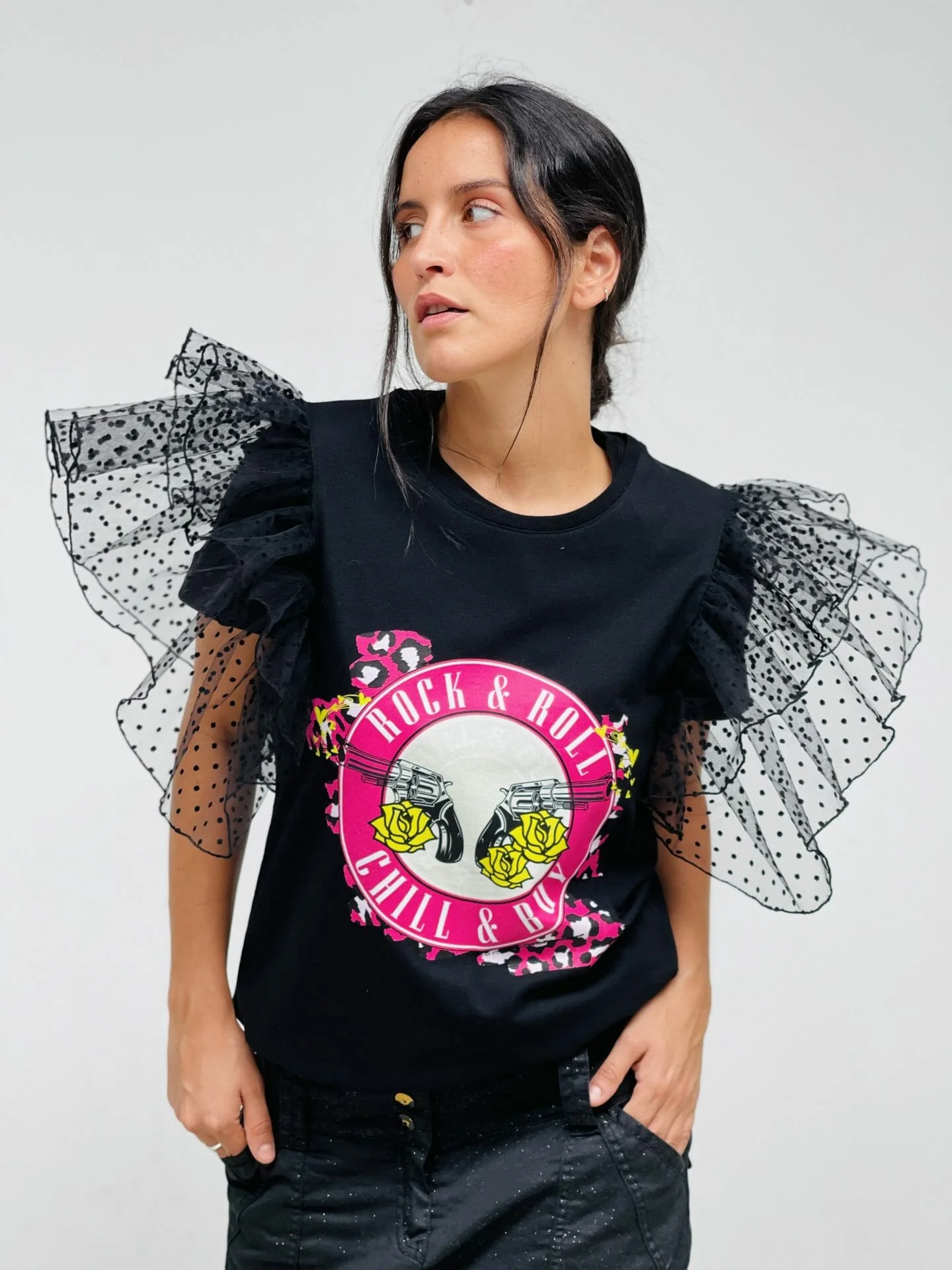 Camiseta de algodón cuello redondo, manga corta con volantes de tejido de tul con lunares en sisa. Estampación delantera.