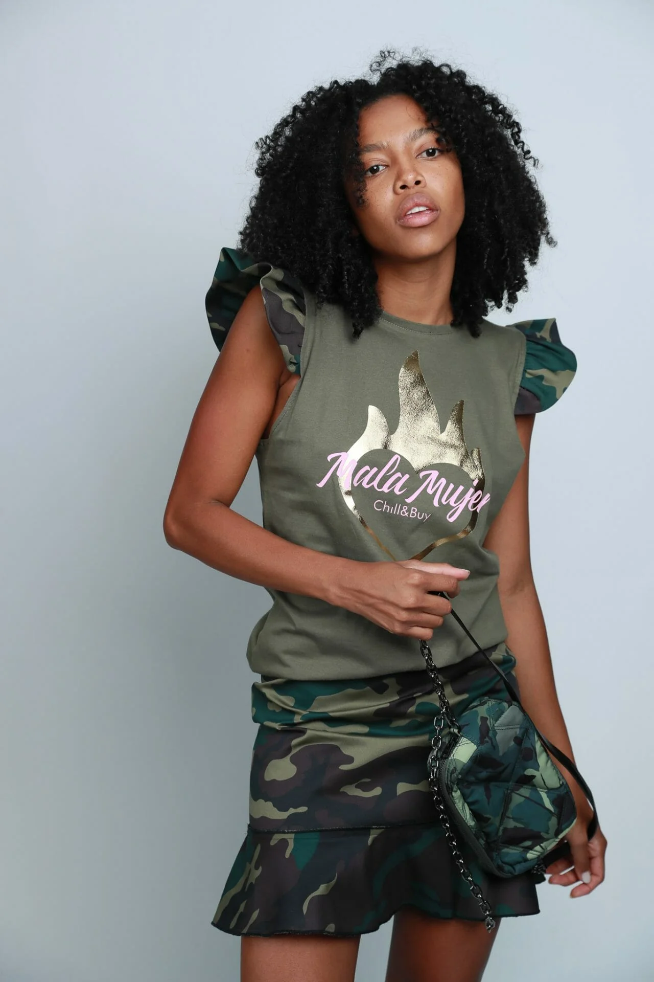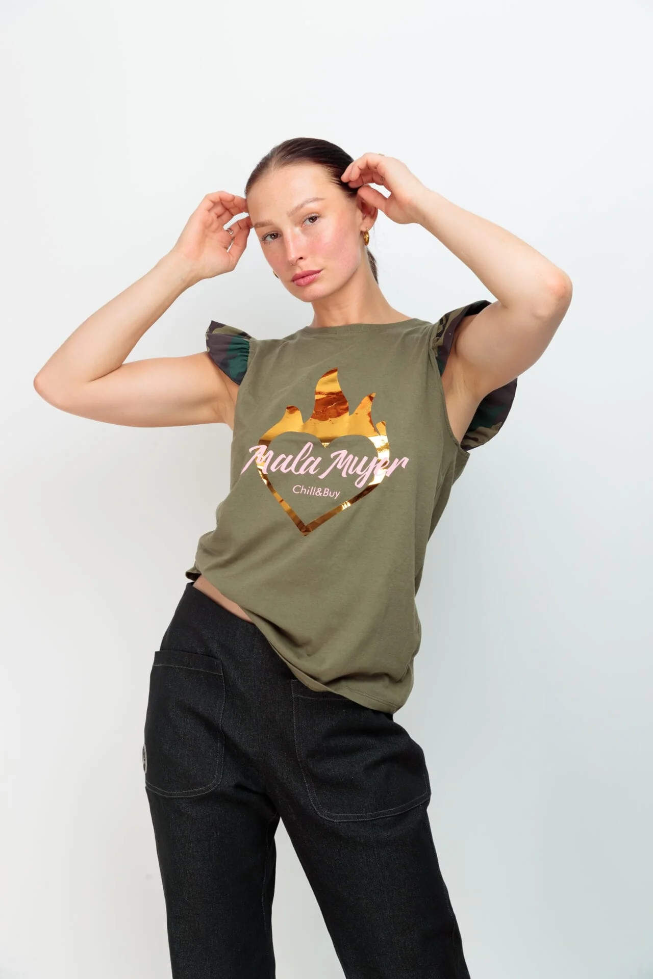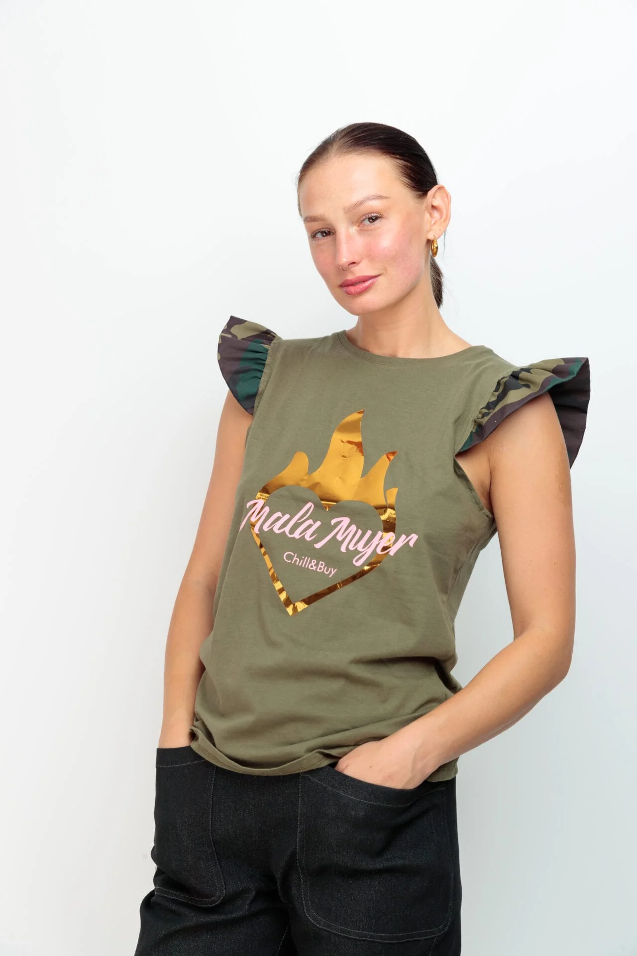 Camiseta cuello redondo, corte recto y detalle de mini volante en manga estampado camuflaje. Estampación frontal