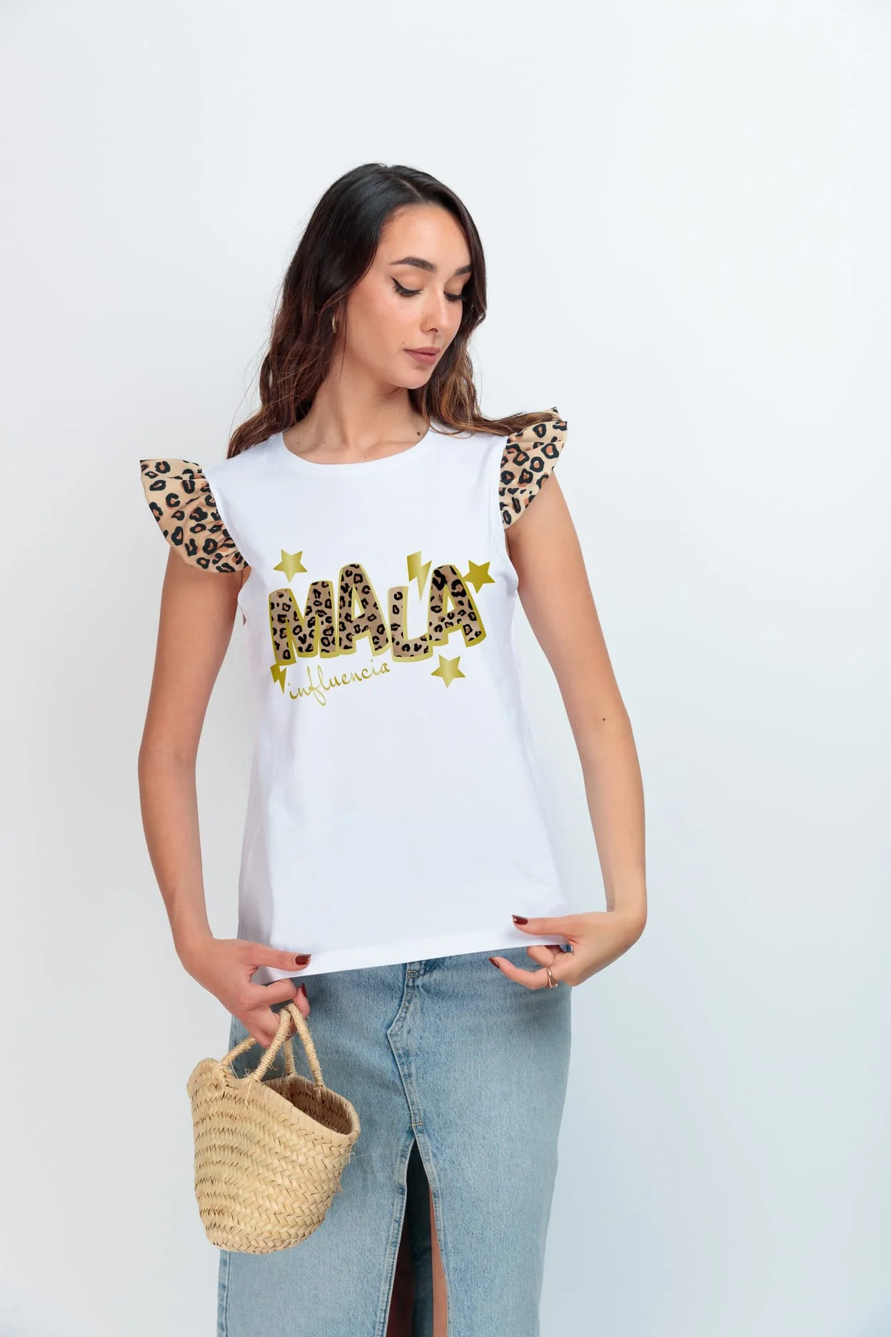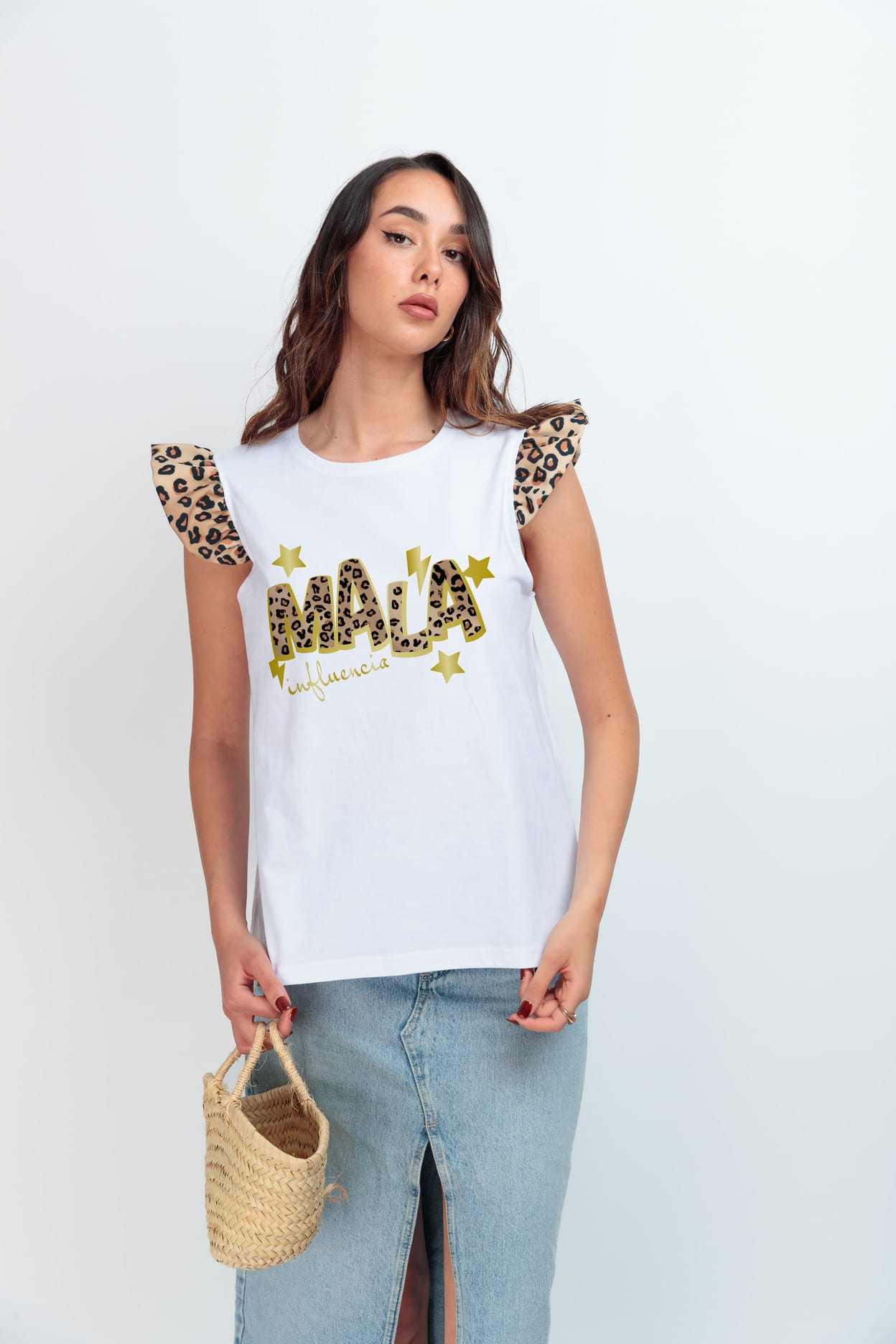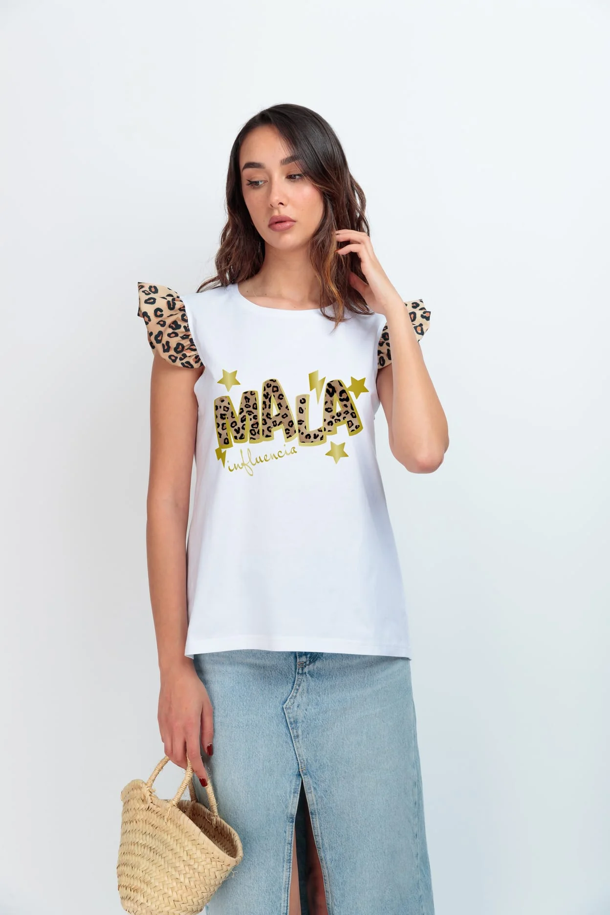 Camiseta de algodón , cuello redondo, corte evasé y bajo asimétrico. Detalle de mini volante en la sisa en estampado animal print y diseño frontal a tono.