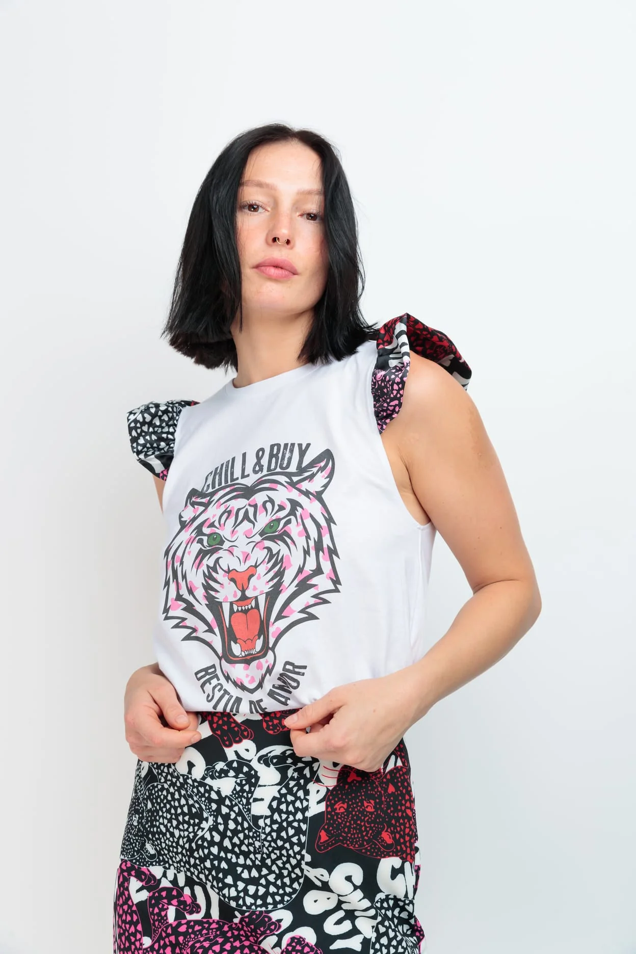 Camiseta de algodón , cuello redondo, corte evasé y bajo asimétrico. Detalle de mini volante en la sisa. Estampación frontal.