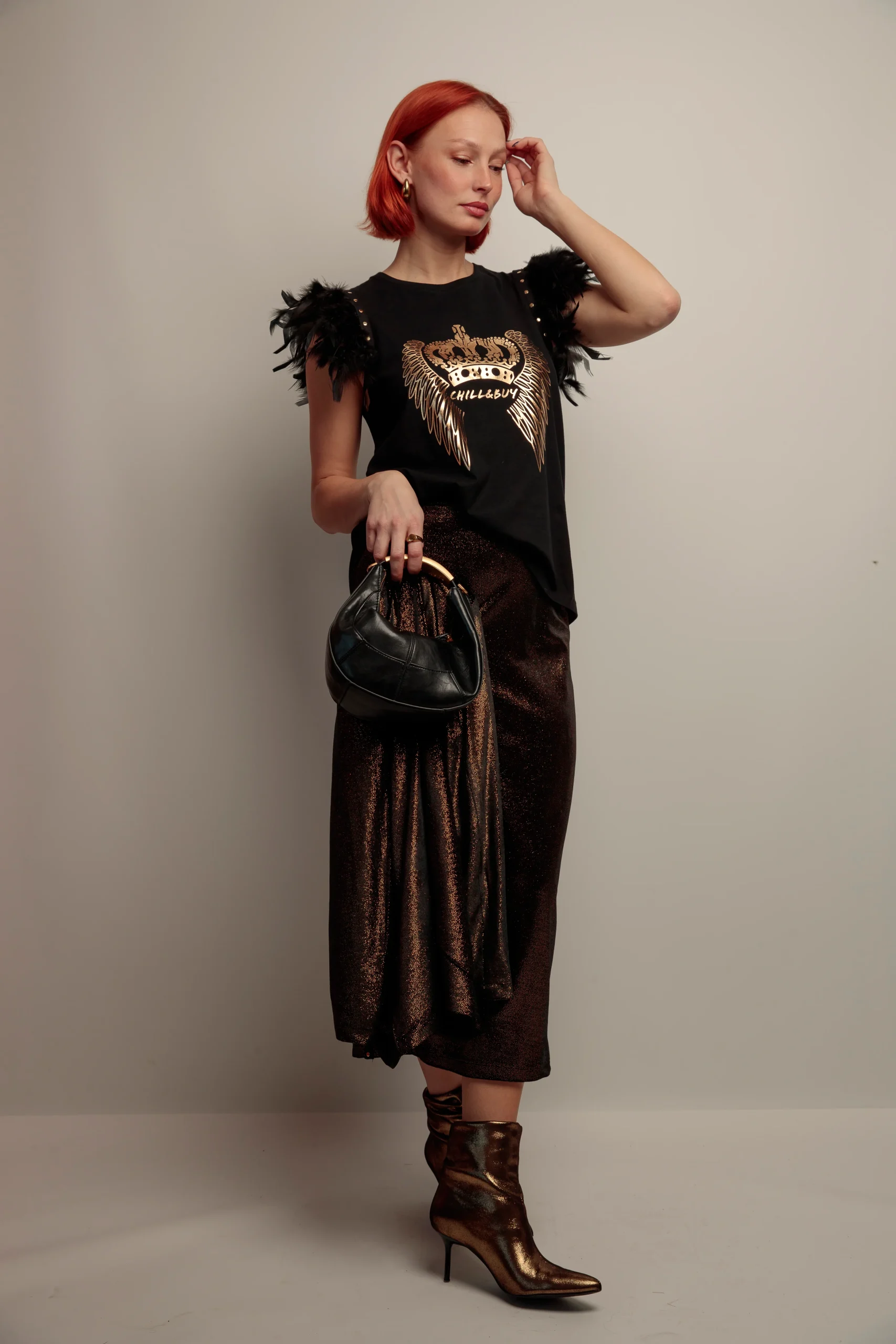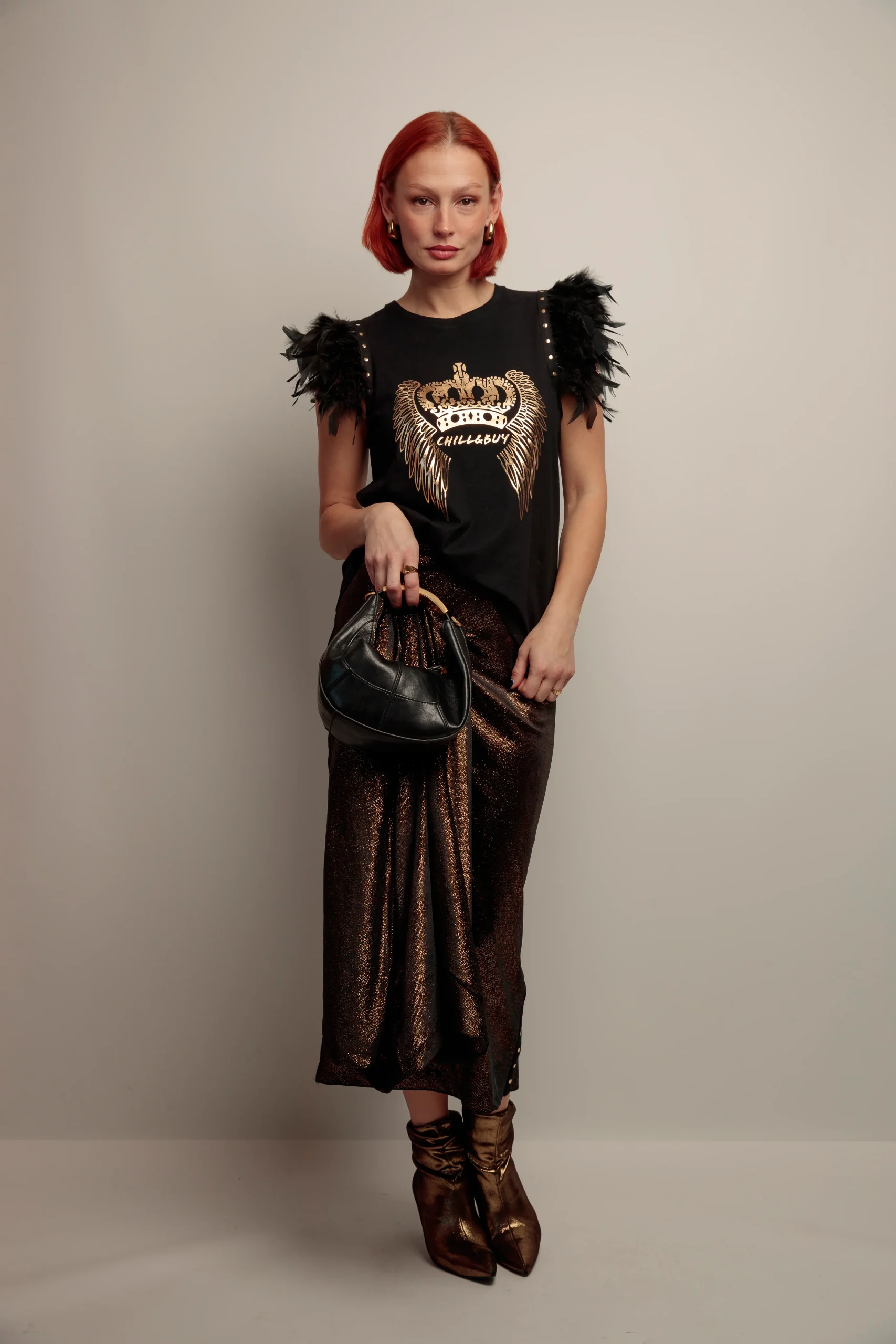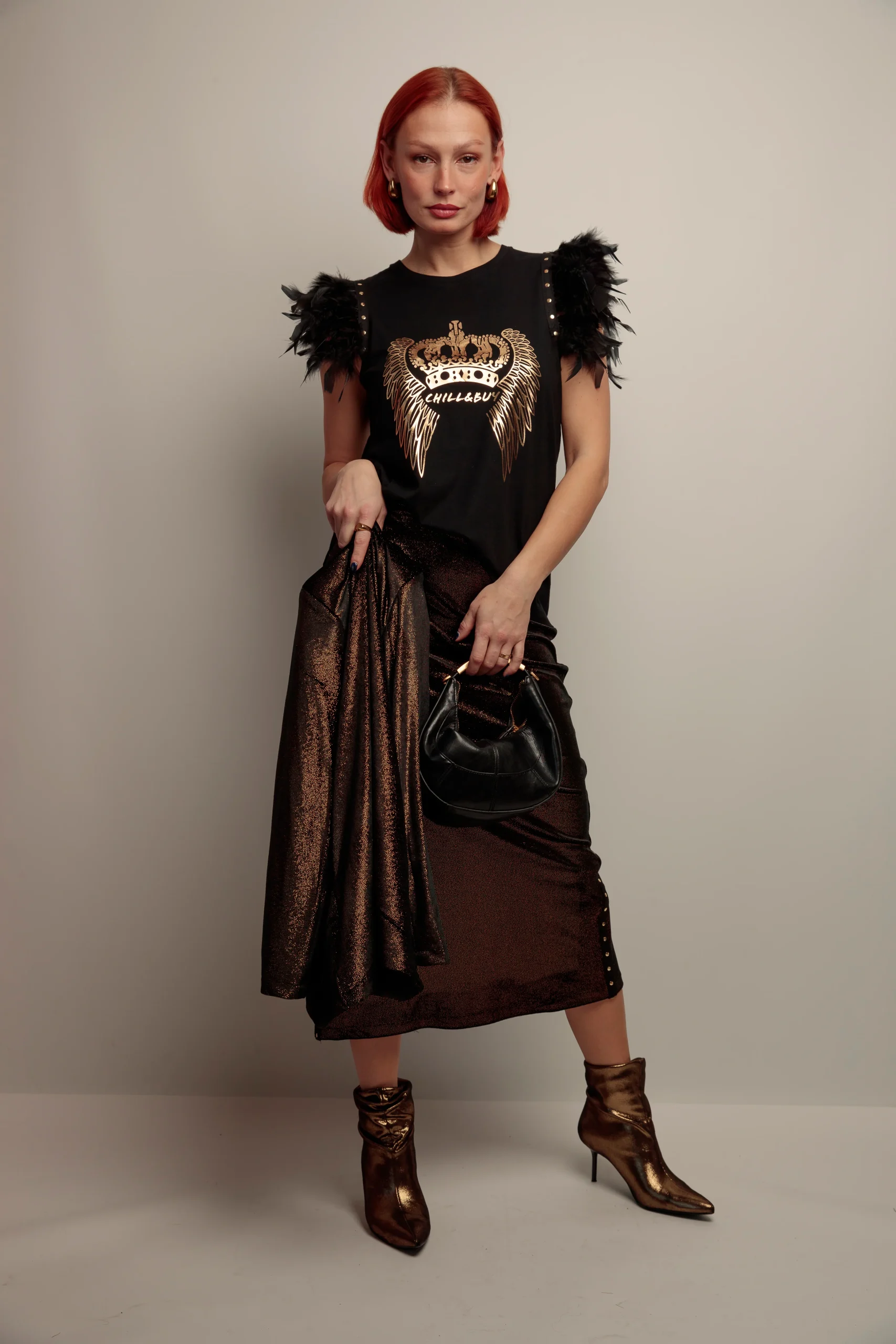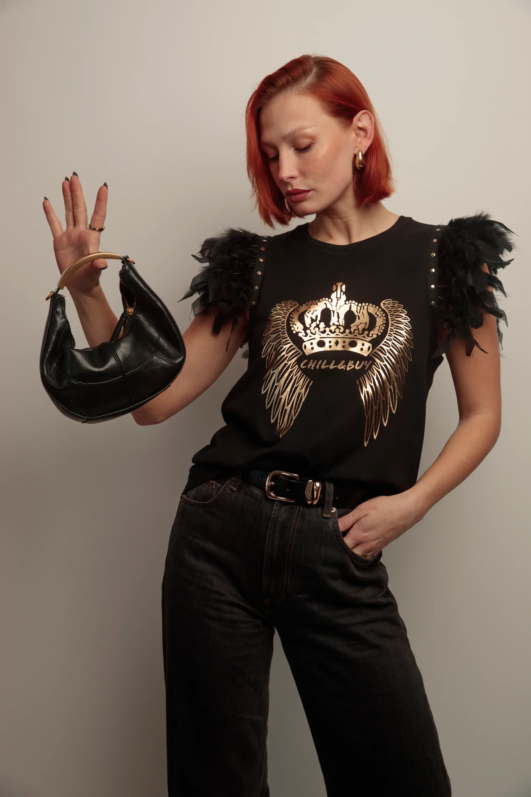 Camiseta de algodón con cuello redondo, corte evasé y bajo asimétrico. Detalle de plumas en color negro el hombro rematadas con tira de tachuelas metálicas en color dorado. Estampación frontal con detalles en dorado.