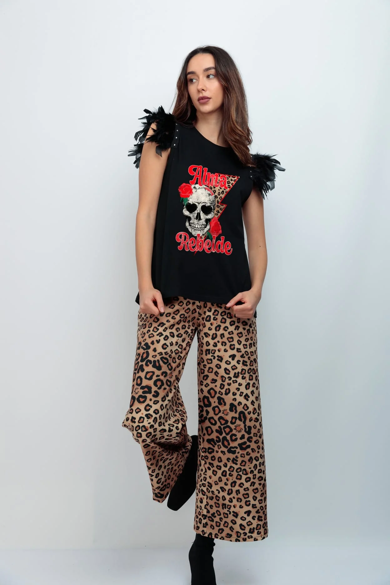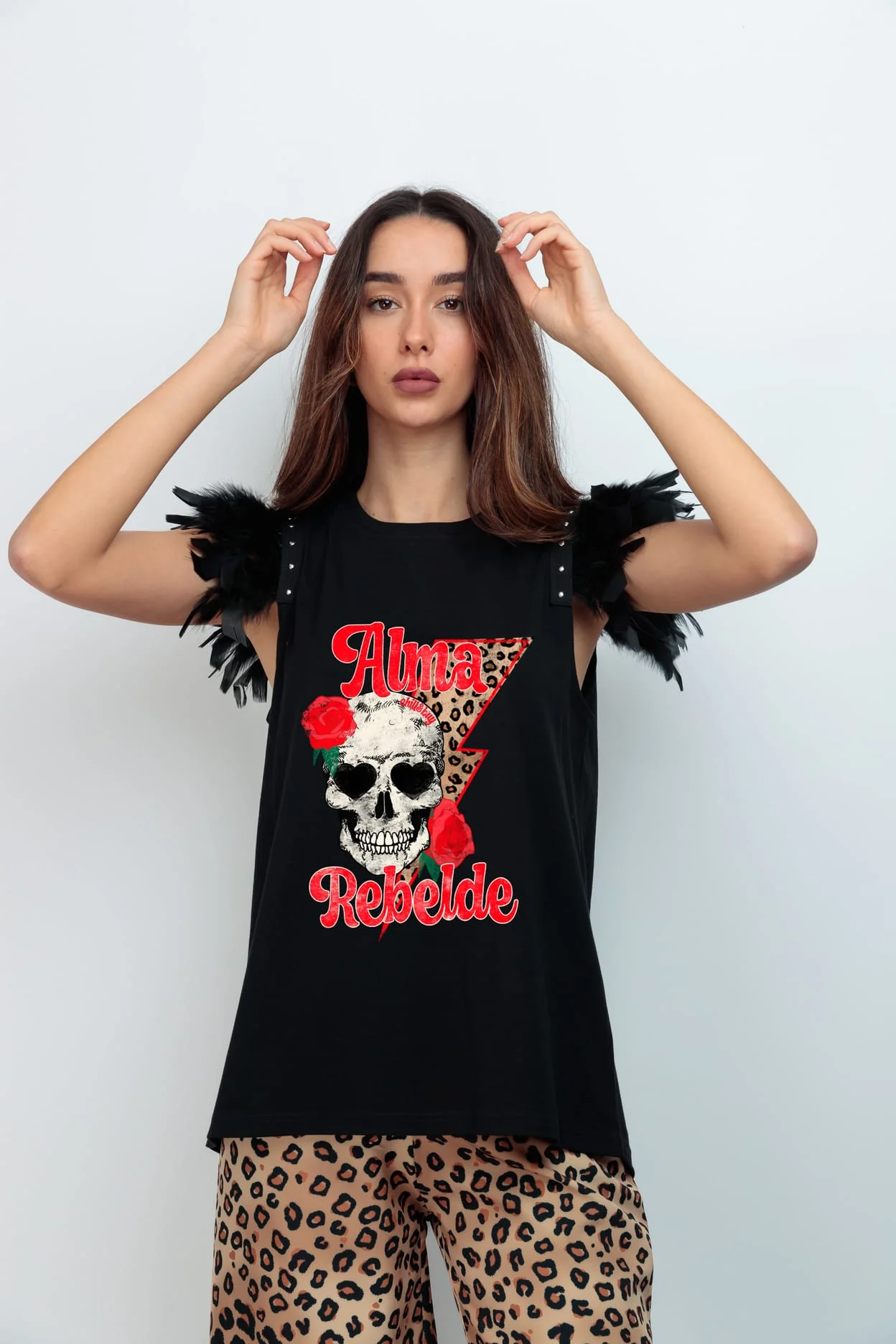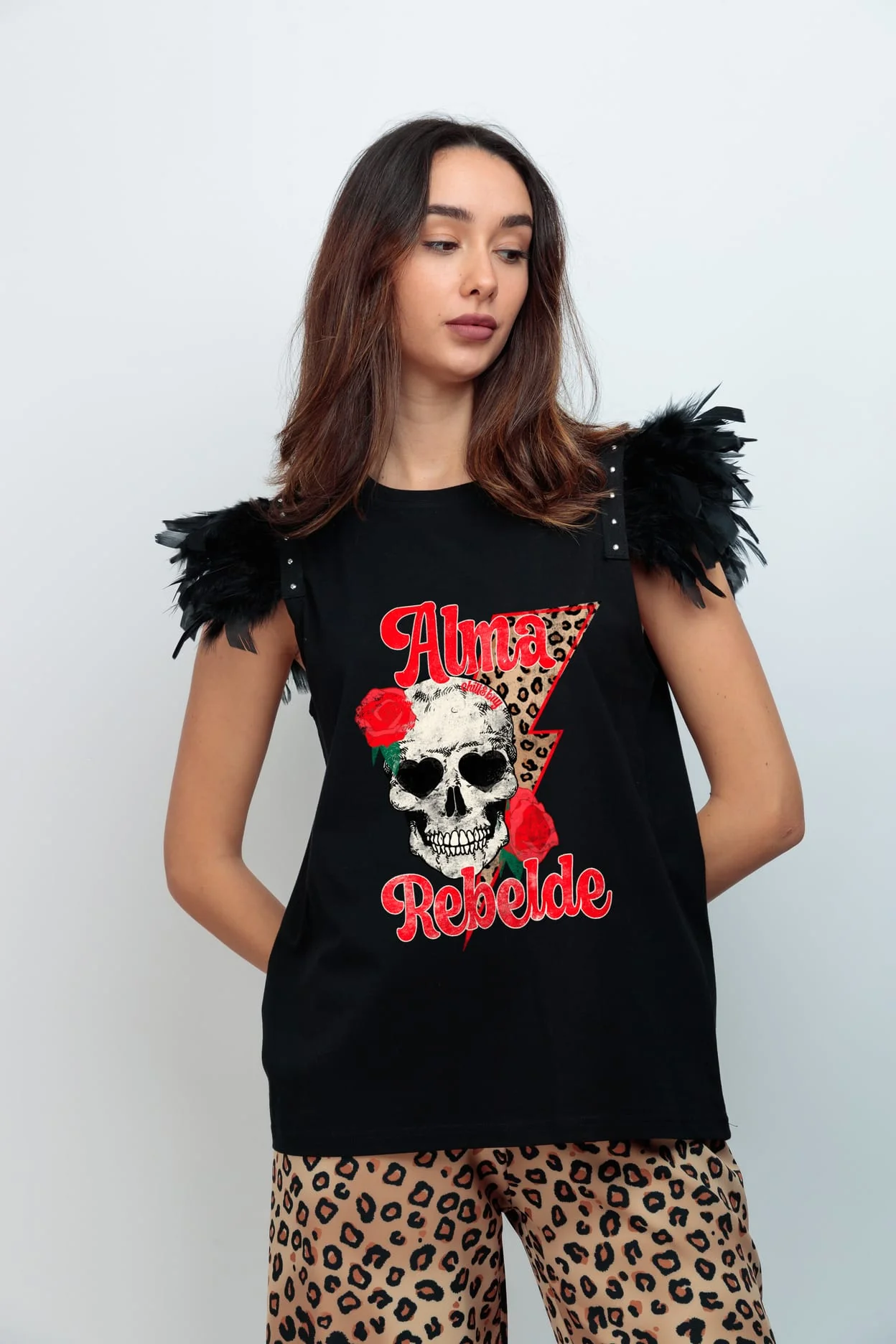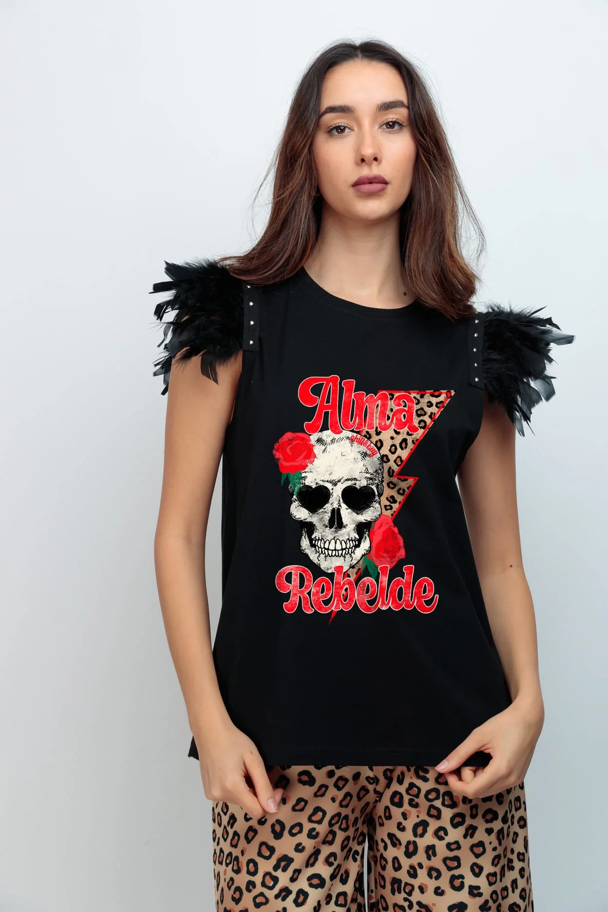 Camiseta de algodón , cuello redondo, corte evasé y bajo asimétrico. Detalle de plumas con tachuelas en las sisas. Estampación frontal.