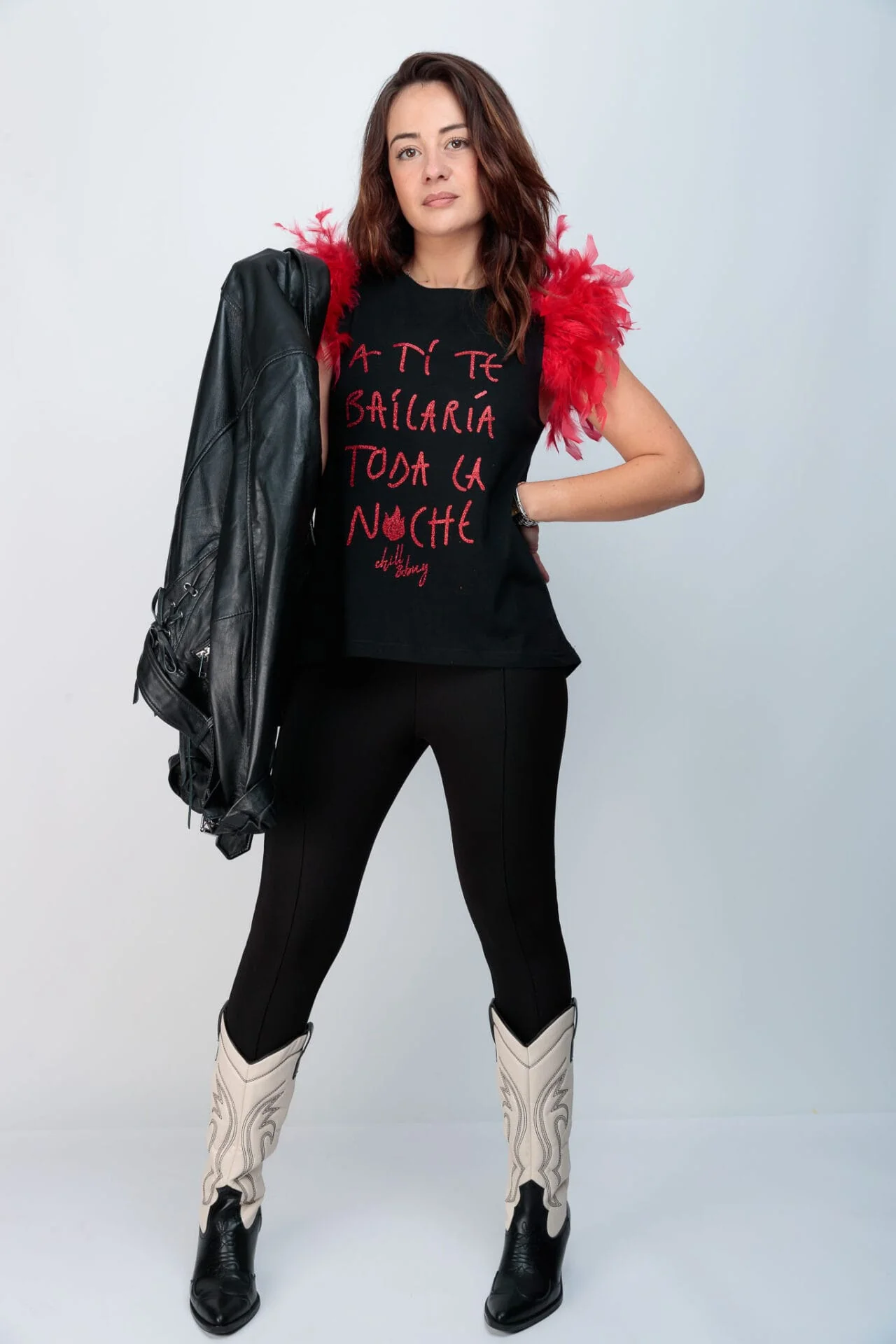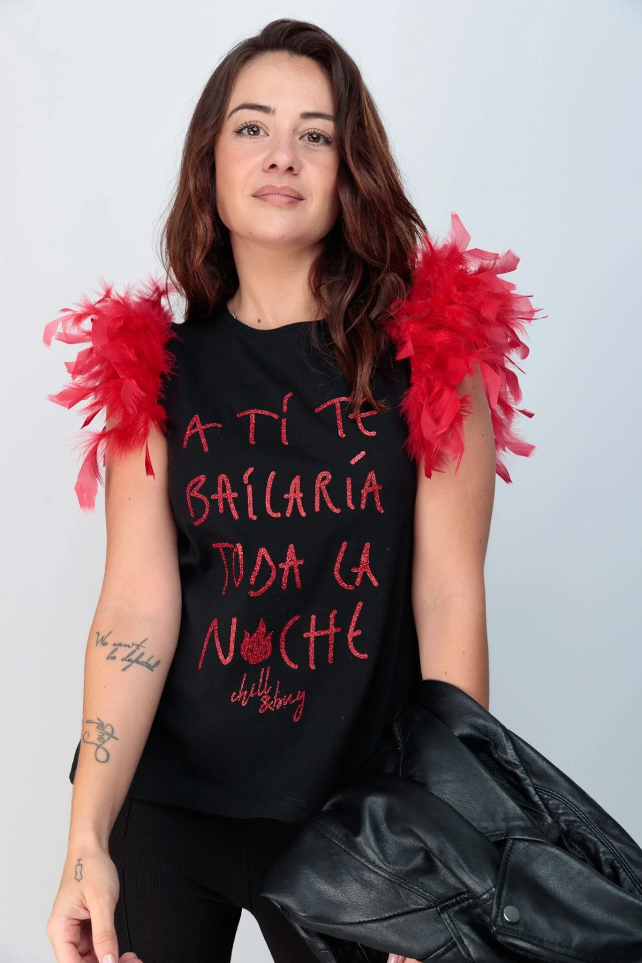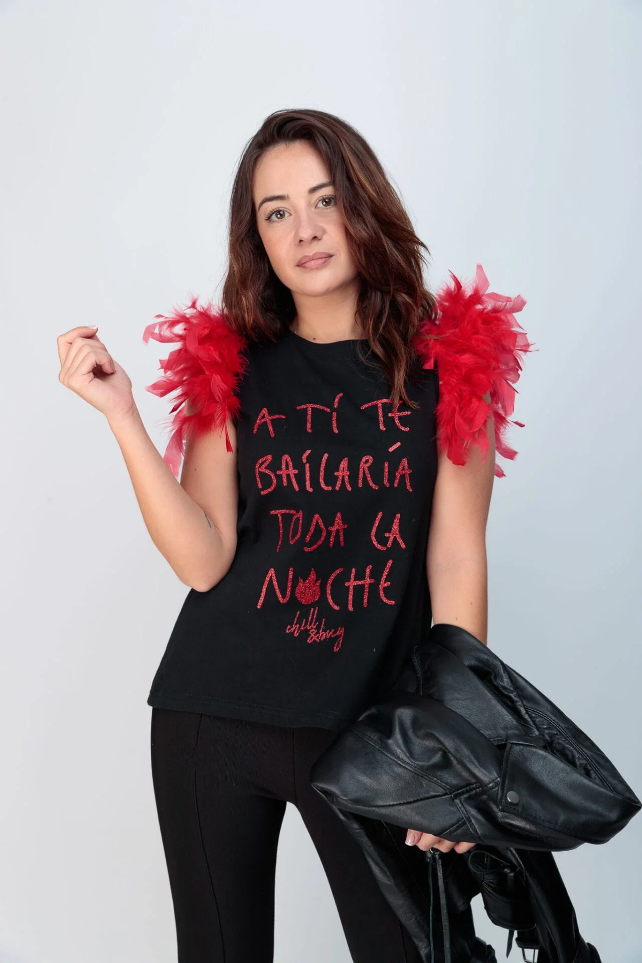 Camiseta de algodón, con cuello redondo, corte evasé y bajo asimétrico. Detalle de plumas en color rojo en la sisa. Estampación frontal en glitter rojo.