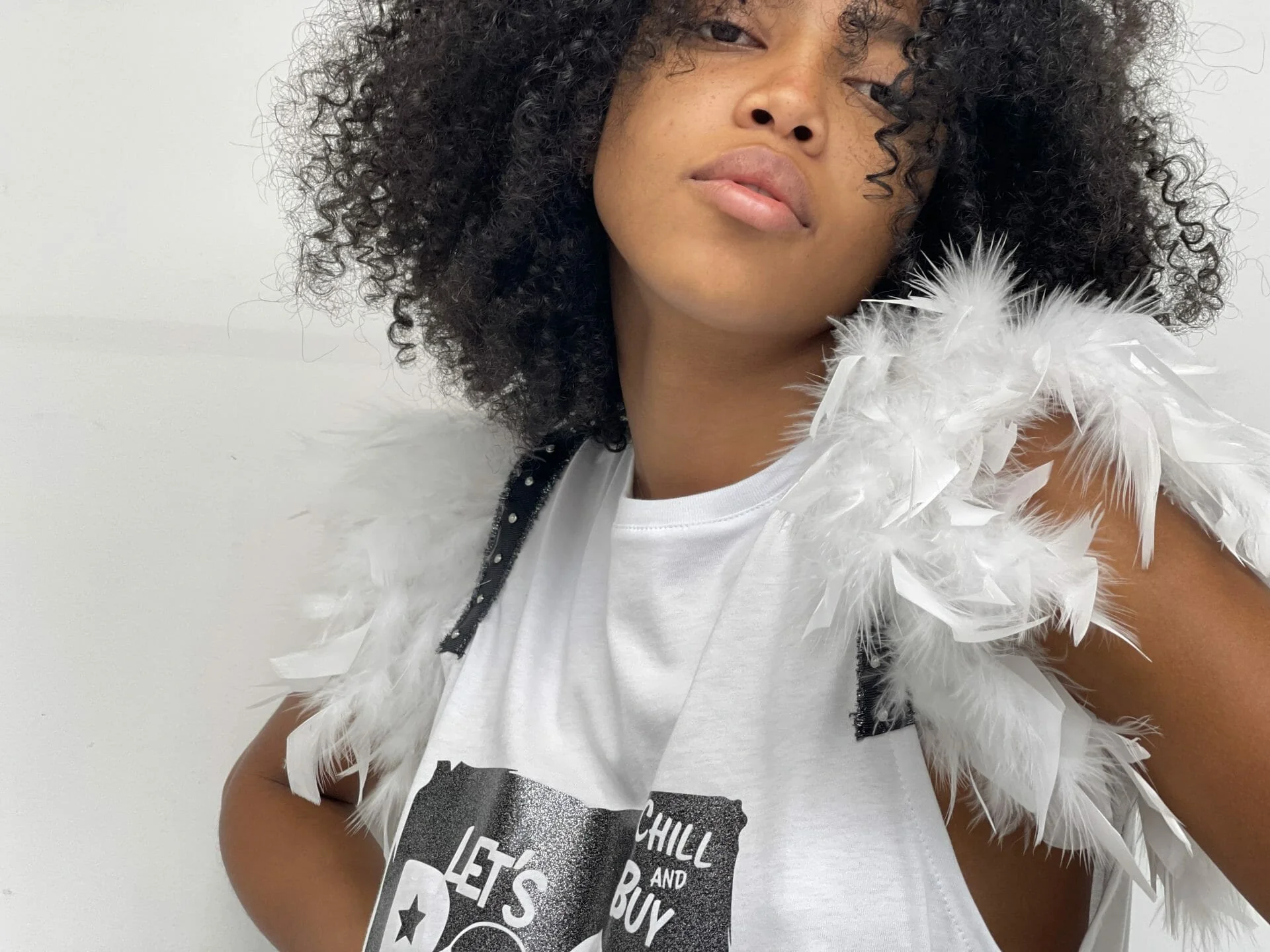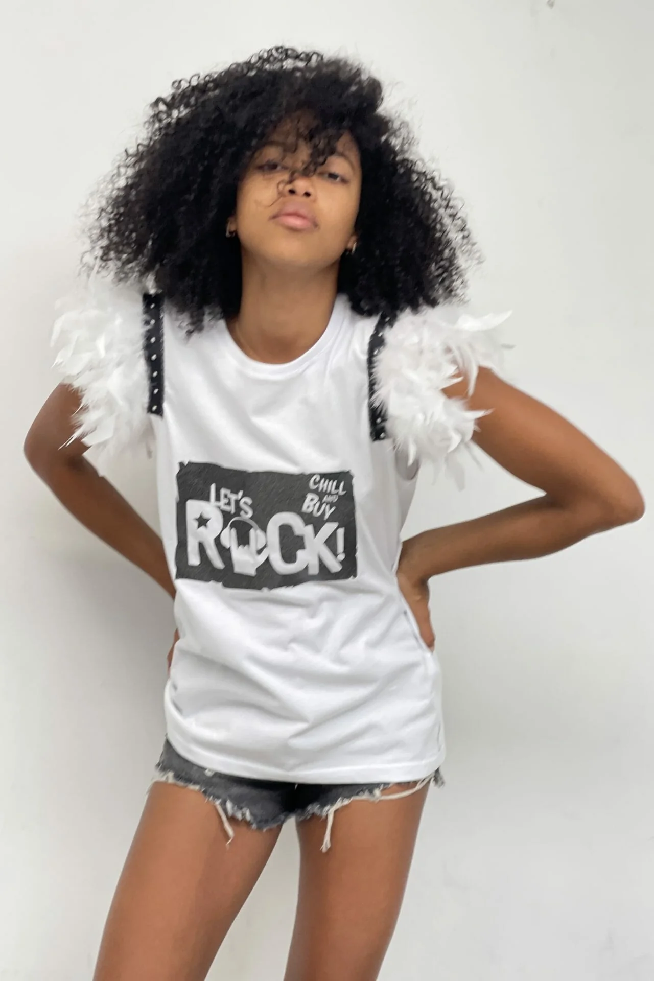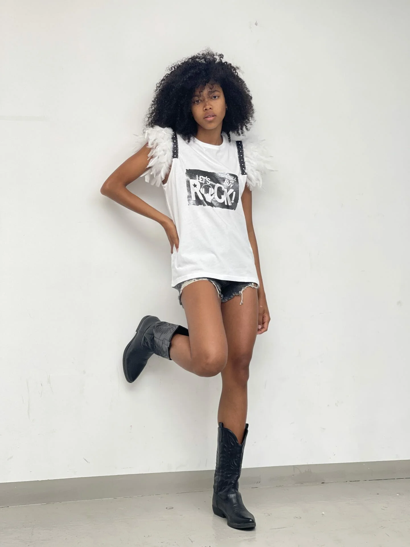 Camiseta de corte recto, cuello redondo y manga con plumas blancas rematadas con cinta de tachuelas. Estampación delantera.