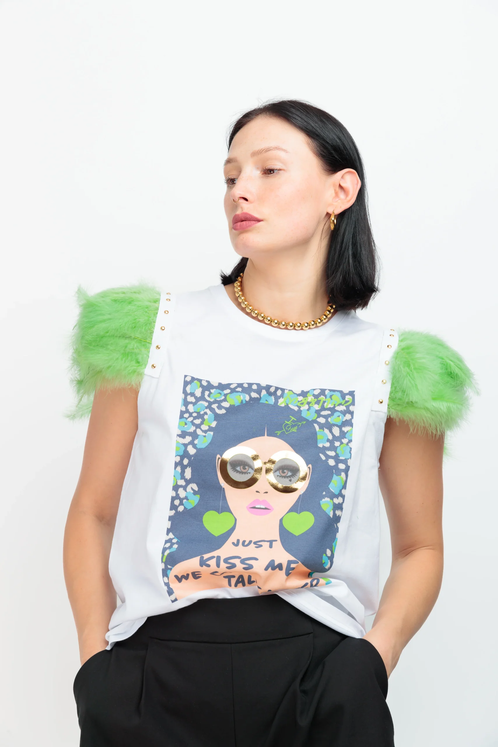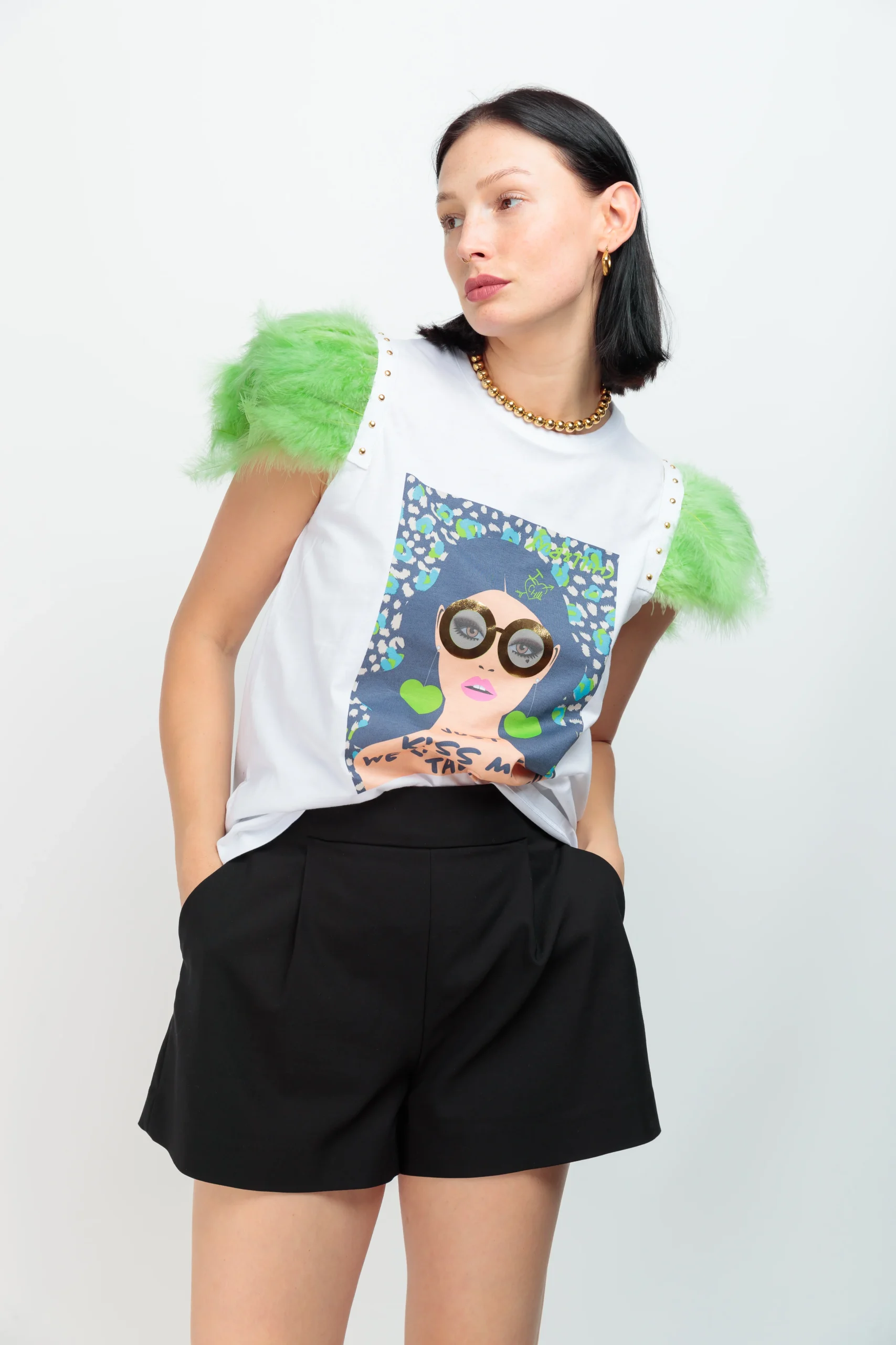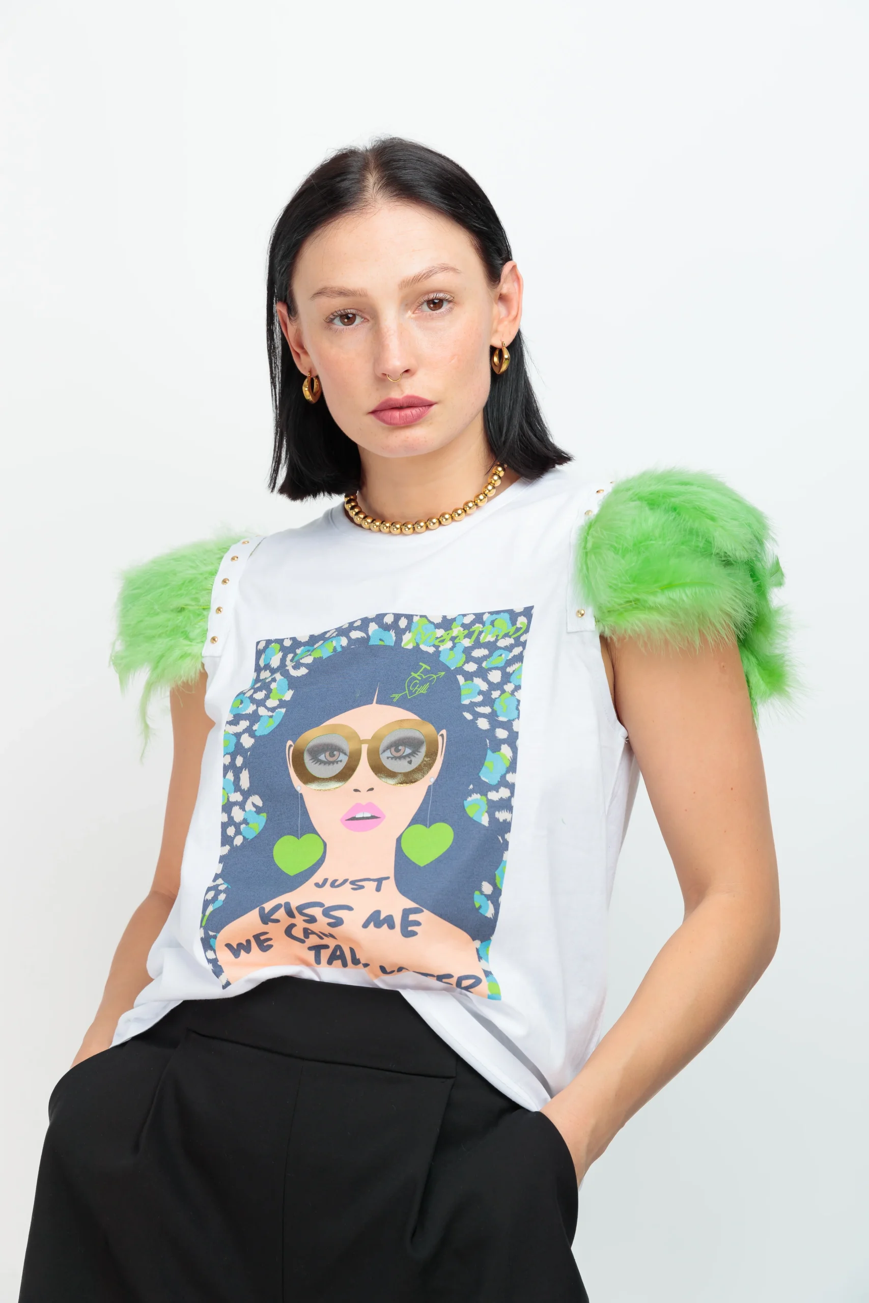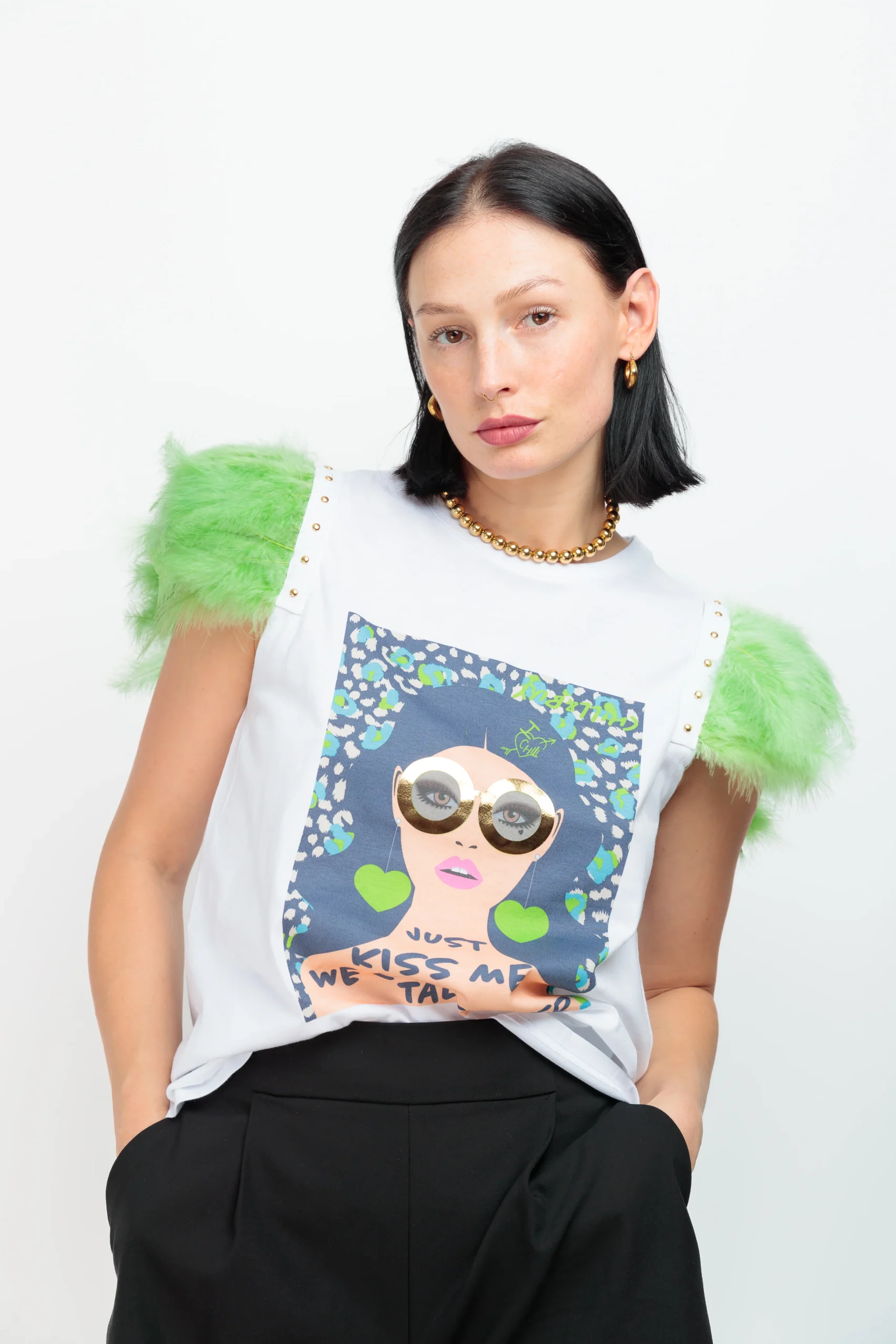 El diseño se distingue por un detalle de plumas en color verde vivo en ambas sisas, que añade textura y un punto llamativo al conjunto. En el centro del pecho, incluye una estampación frontal con ilustración gráfica y tipografía decorativa.