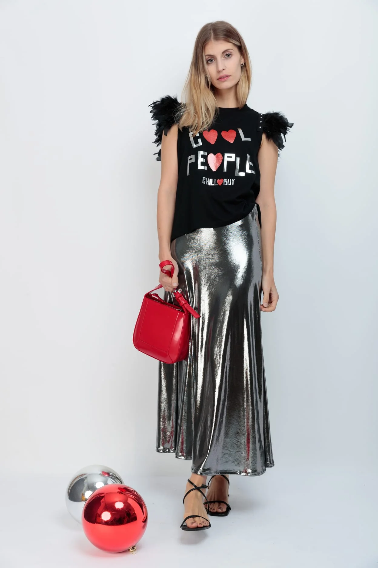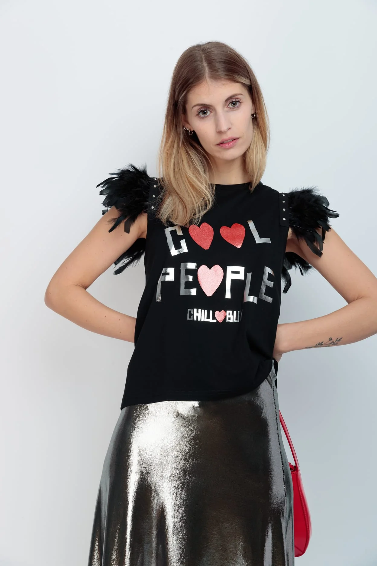 Camiseta de algodón , con detalle de plumas color negro y cinta de tachuelas metálicas en color plateado en las sisa. Estampación frontal.