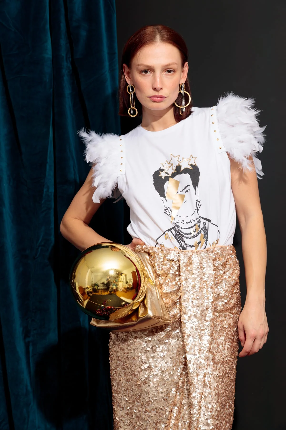 Camiseta de algodón en color blanco , cuello redondo, corte recto. Detalle de plumas en color blanco en la sisa, rematadas con tira de tachuelas en color dorado y estampación frontal a tono.