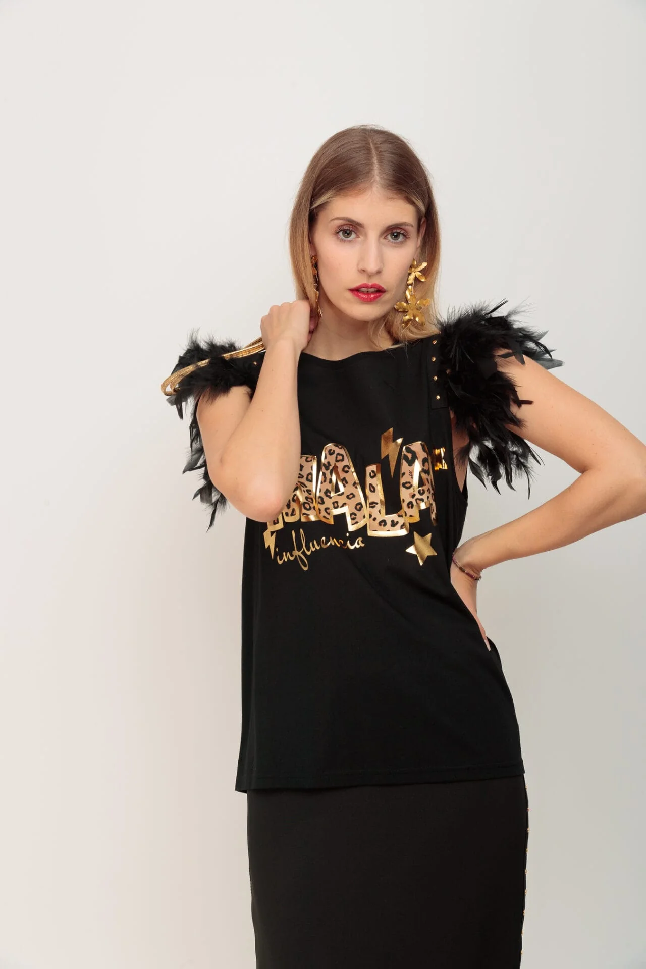 Camiseta de algodón, cuello redondo, corte evase y bajo asimétrico. Detalle de plumas y tachuelas doradas en las sisa. Estampación frontal.