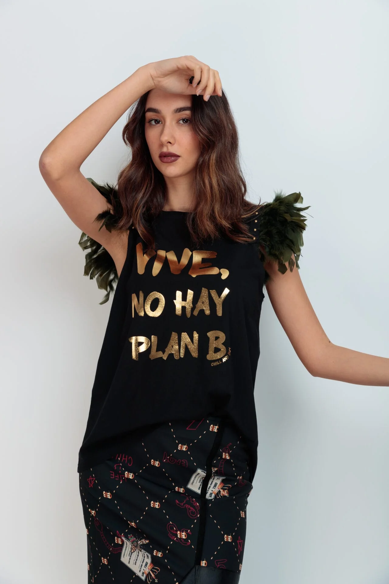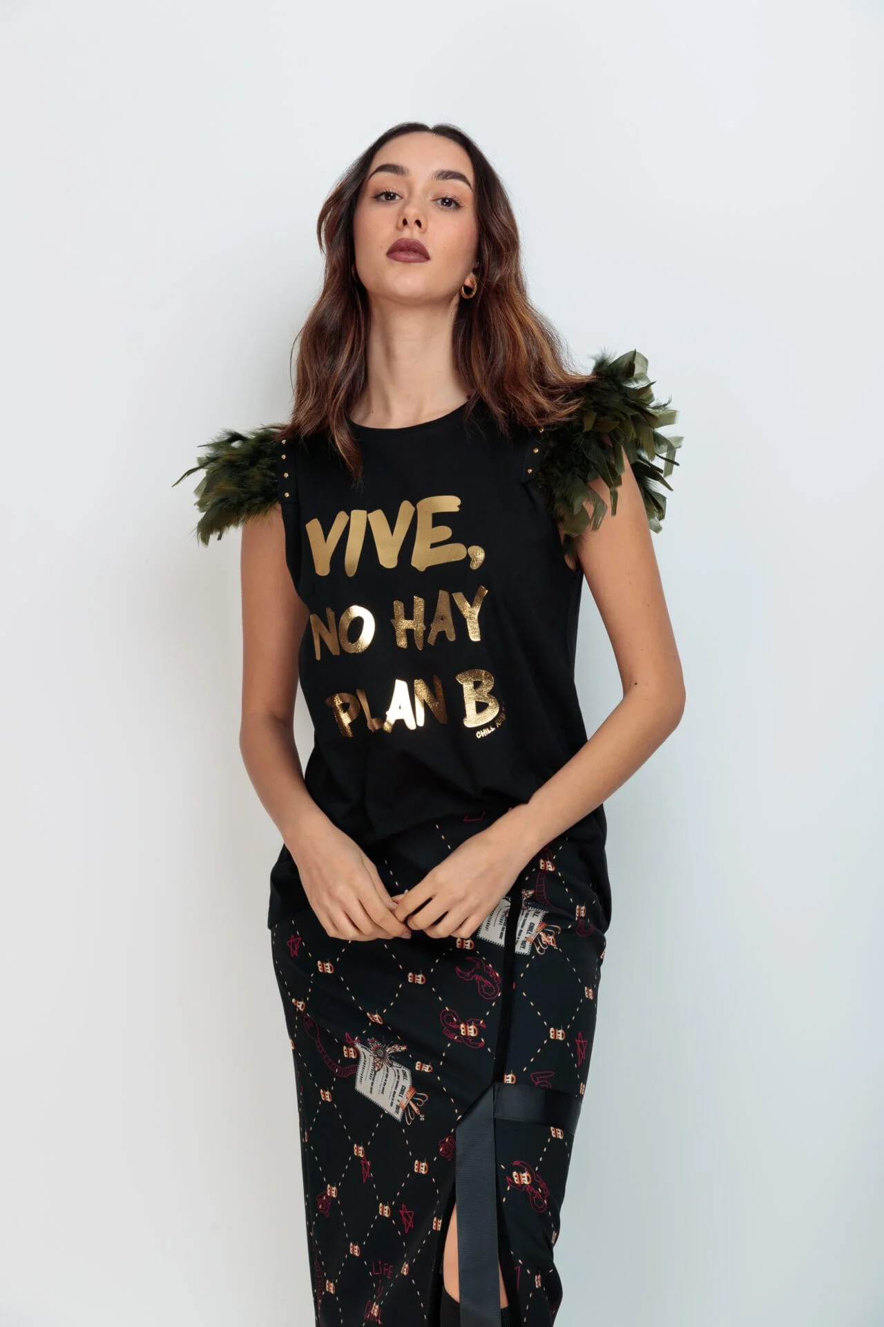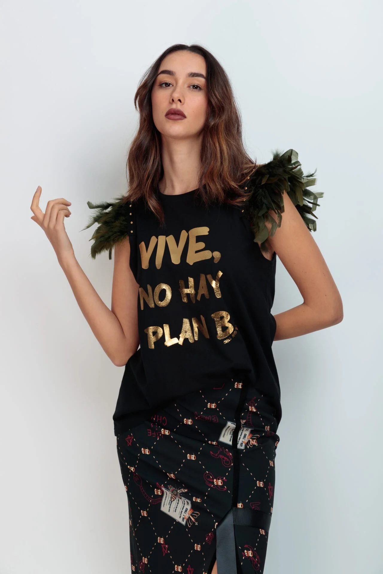 Camiseta de algodón, cuello redondo, y detalle de plumas en la sisa en color verde y rematadas con tira de tachuelas metalicas en color dorado. Estampación frontal.