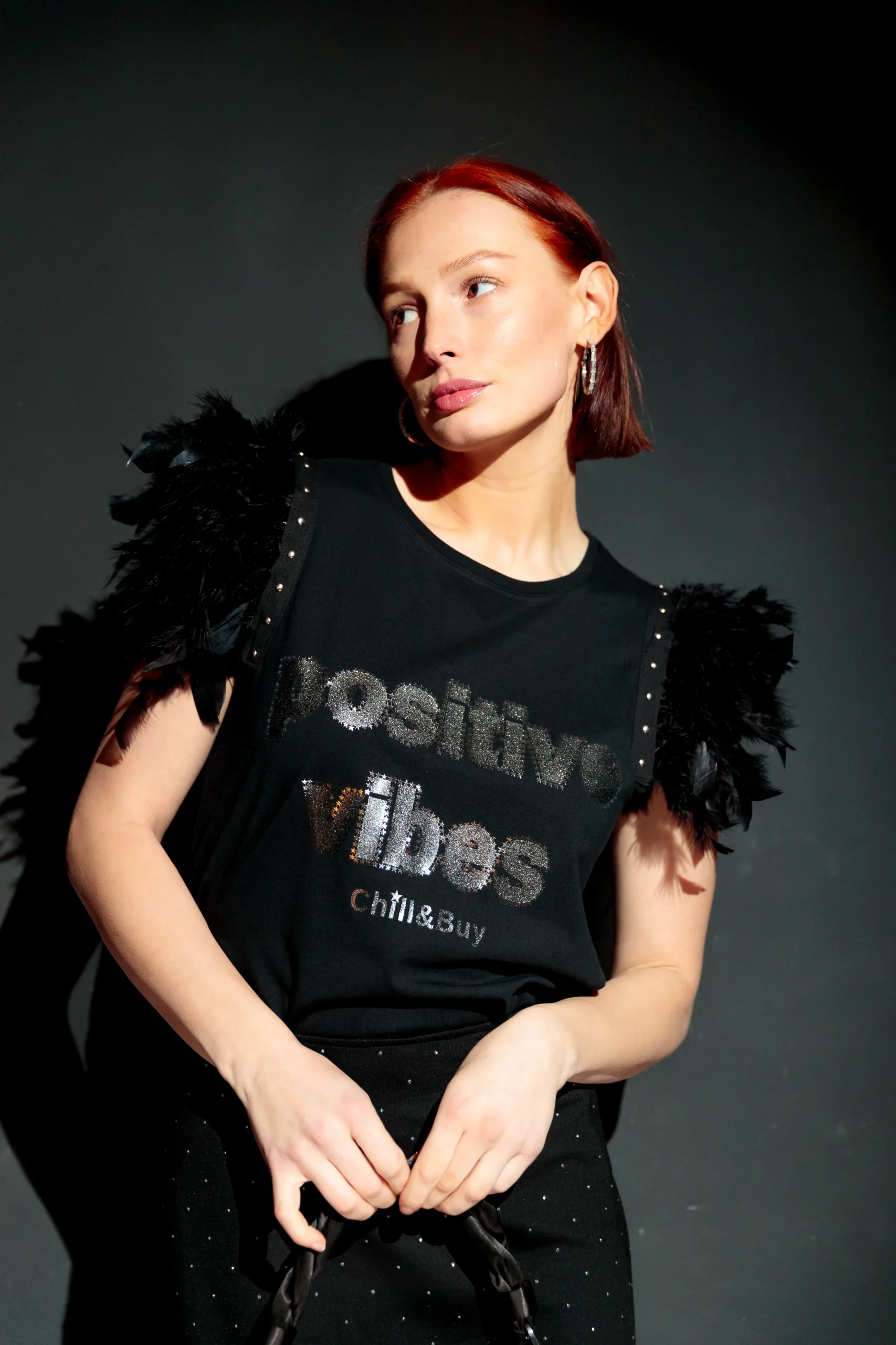 Camiseta de algodón, con cuello redondo, corte evasé y bajo asimétrico. Detalle plumas en color negro en la sisa con remate de tira de tachuelas metálicas en color plata.
