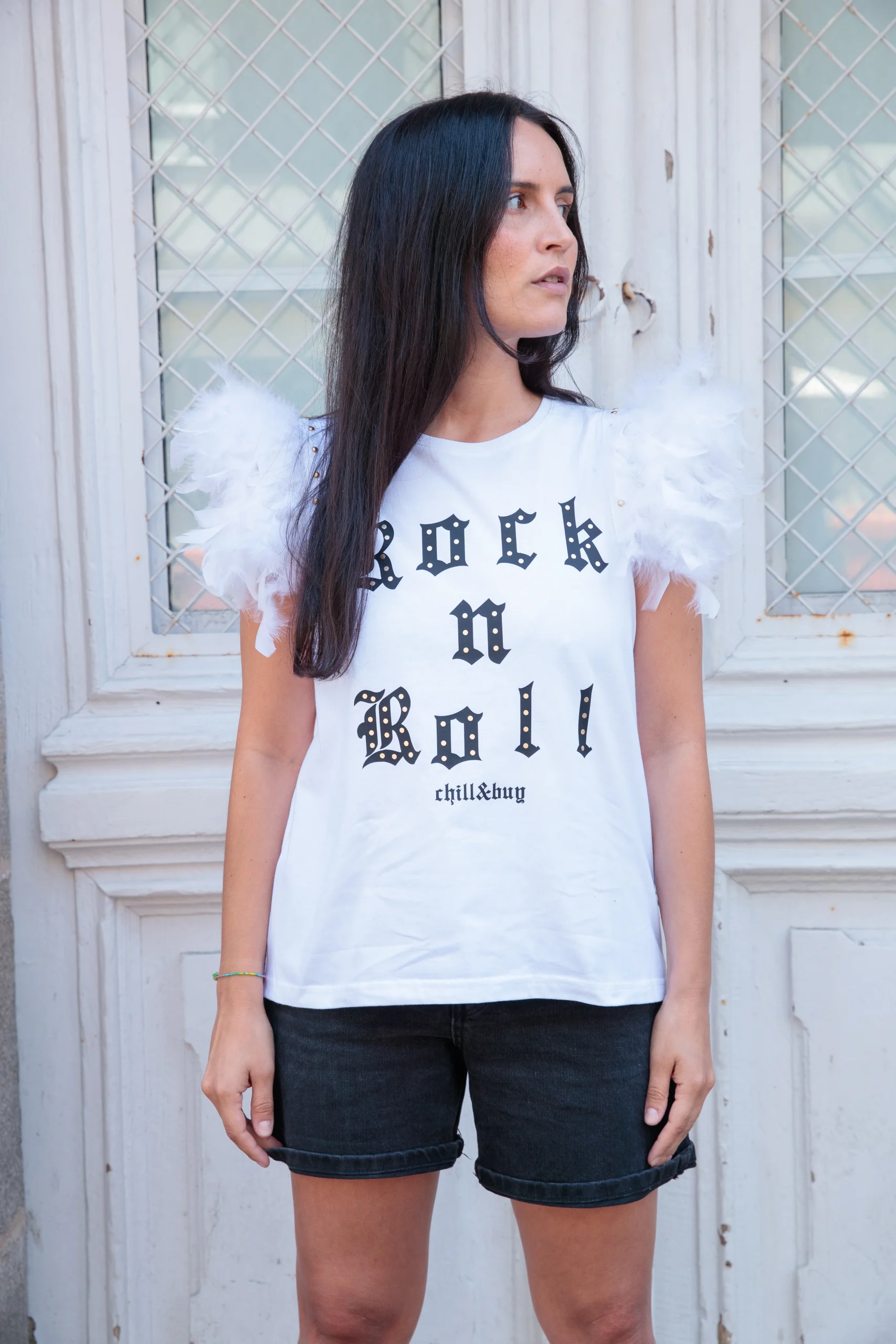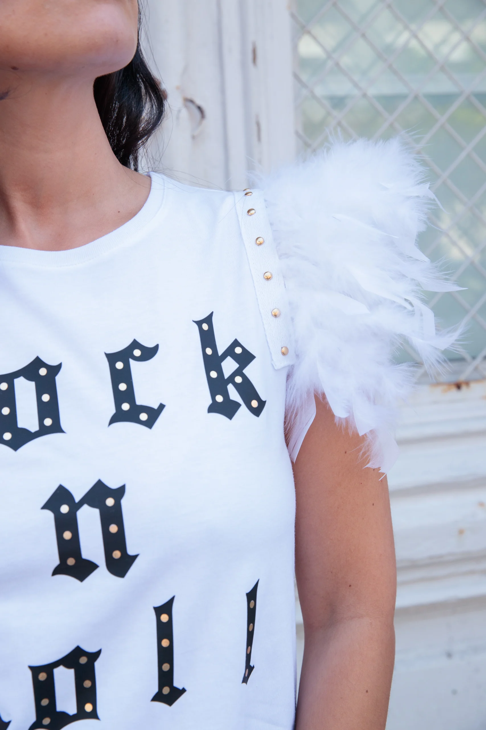 Camiseta de algodón en color blanco con cuello redondo, corte evasé y bajo asimétrico. Presenta un detalle de plumas blancas en la sisa, rematadas con una tira de tachuelas metálicas doradas que le aportan un aire rockero y sofisticado. Diseño frontal con texto «Rock n Roll» en tipografÃa gótica con apliques dorados. Un diseño atrevido y original para destacar.