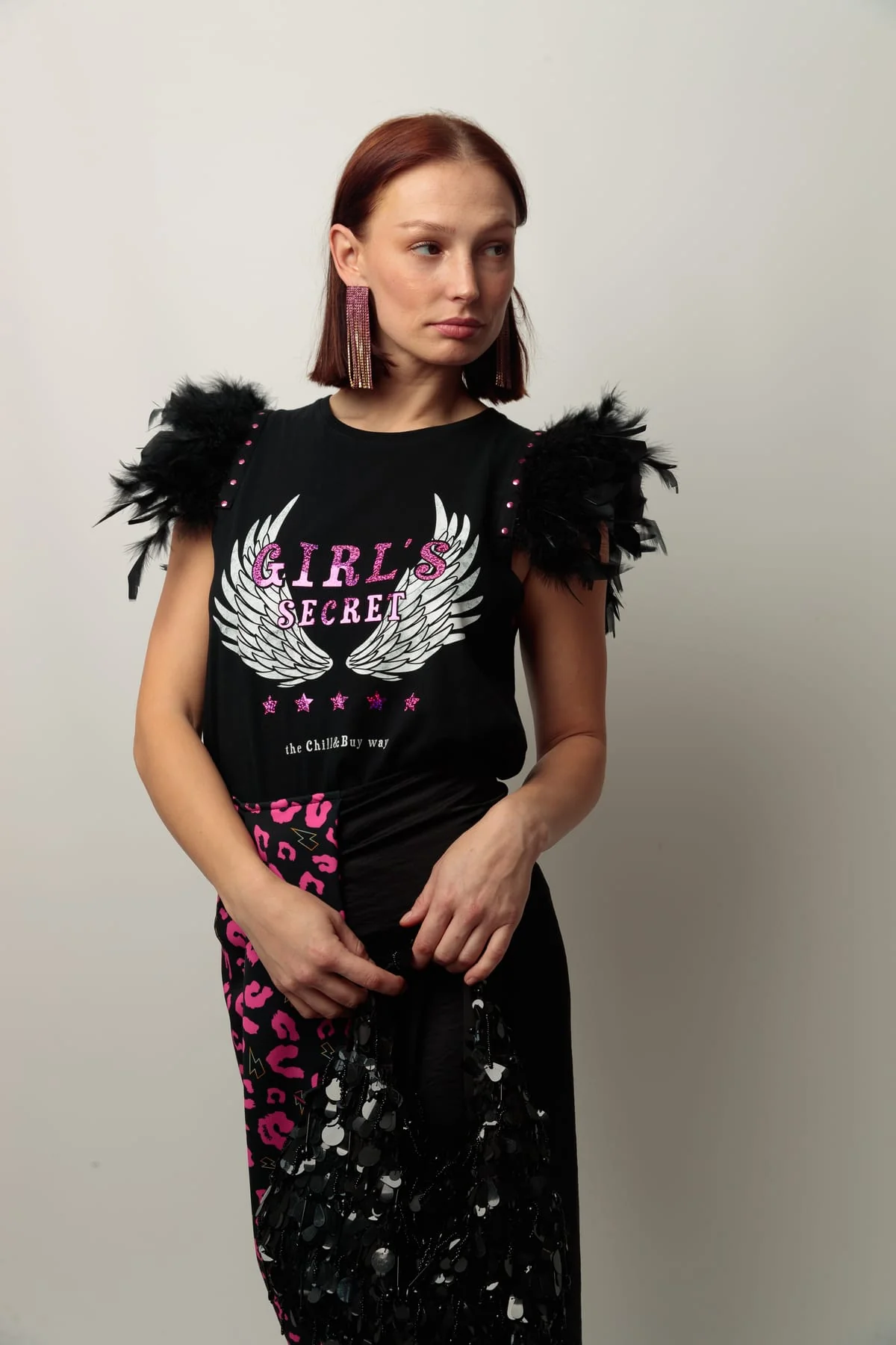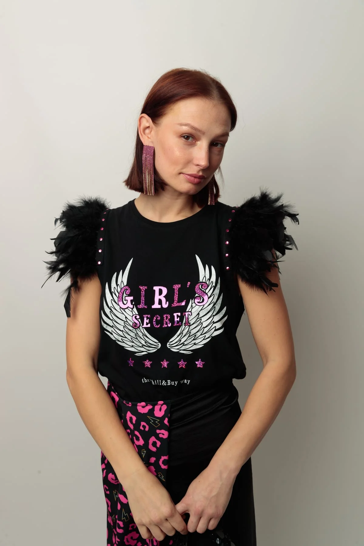 Camiseta de algodón, con cuello redondo, corte evase y bajo asimétrico. Detalle de plumas en color negro rematadas con tira de tachuelas en color fucsia a tono con el diseño frontal. Las plumas se pueden meter en la lavadora en un programa delicado y dejar secar al aire libre.