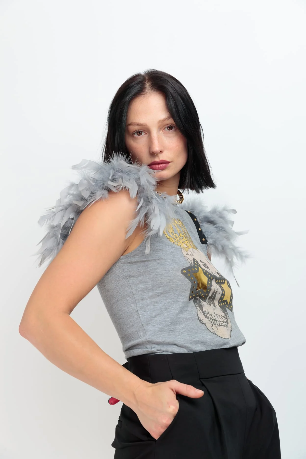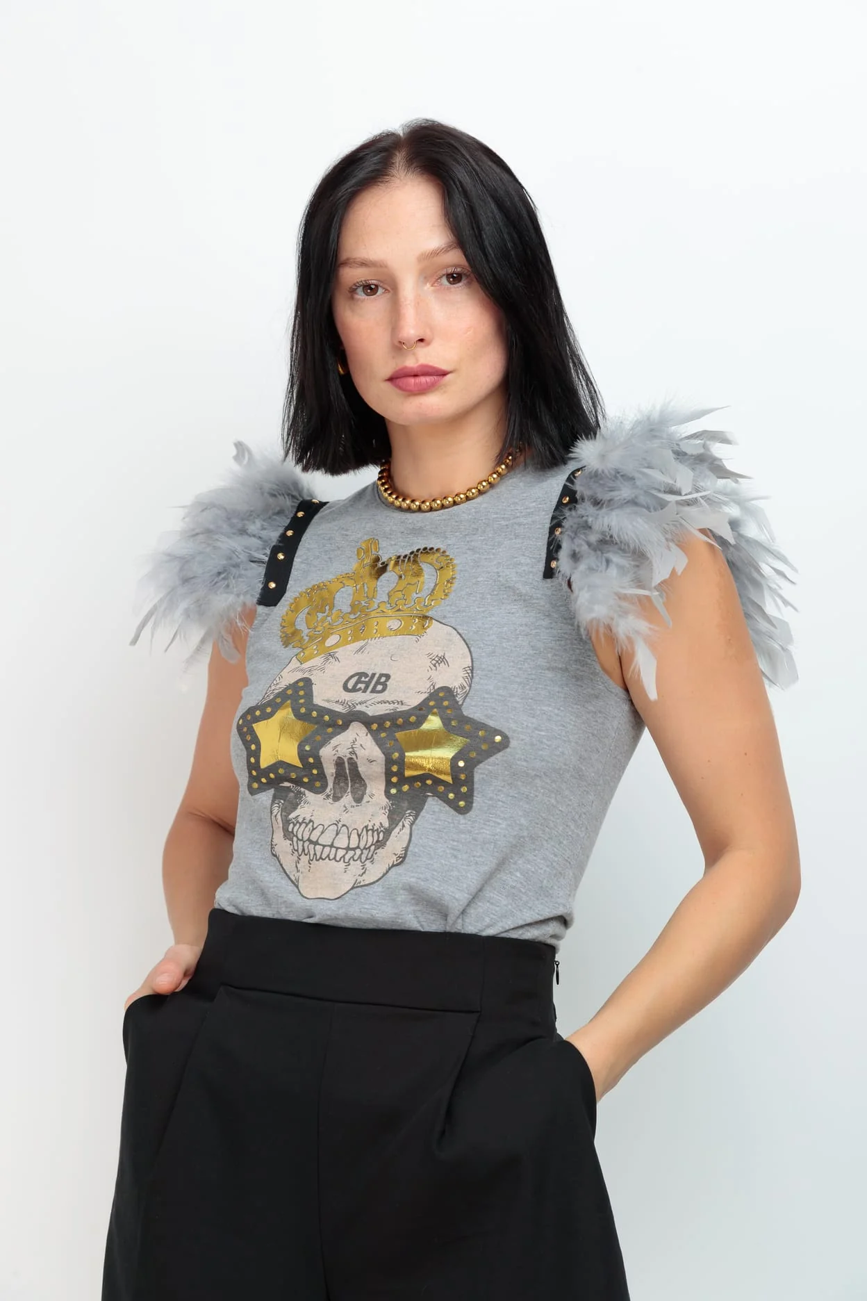 Camiseta de algodón en color gris, cuello redondo, corte recto. Detalle de plumas grises con tachuelas doradas en las sisa. Estampación frontal.