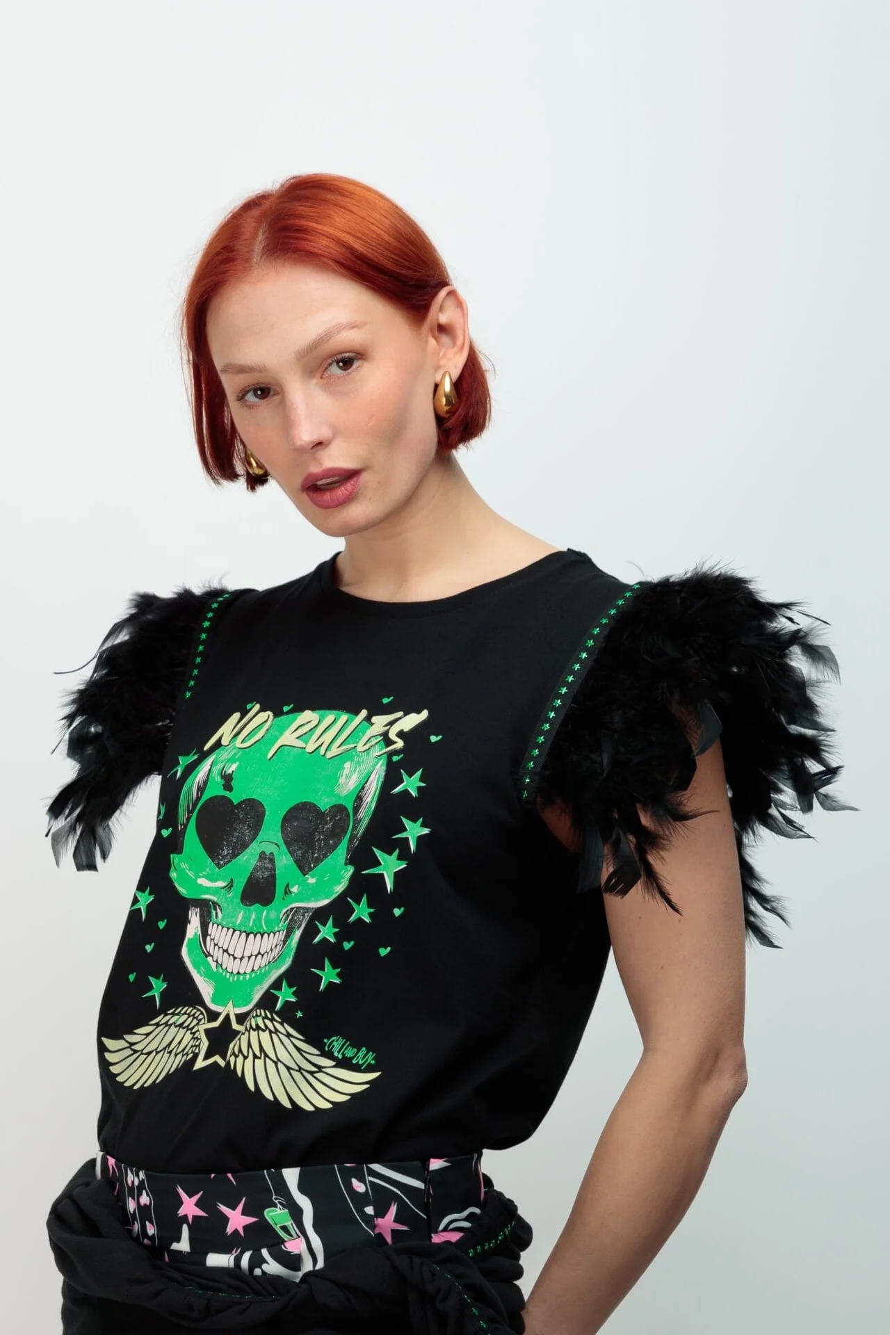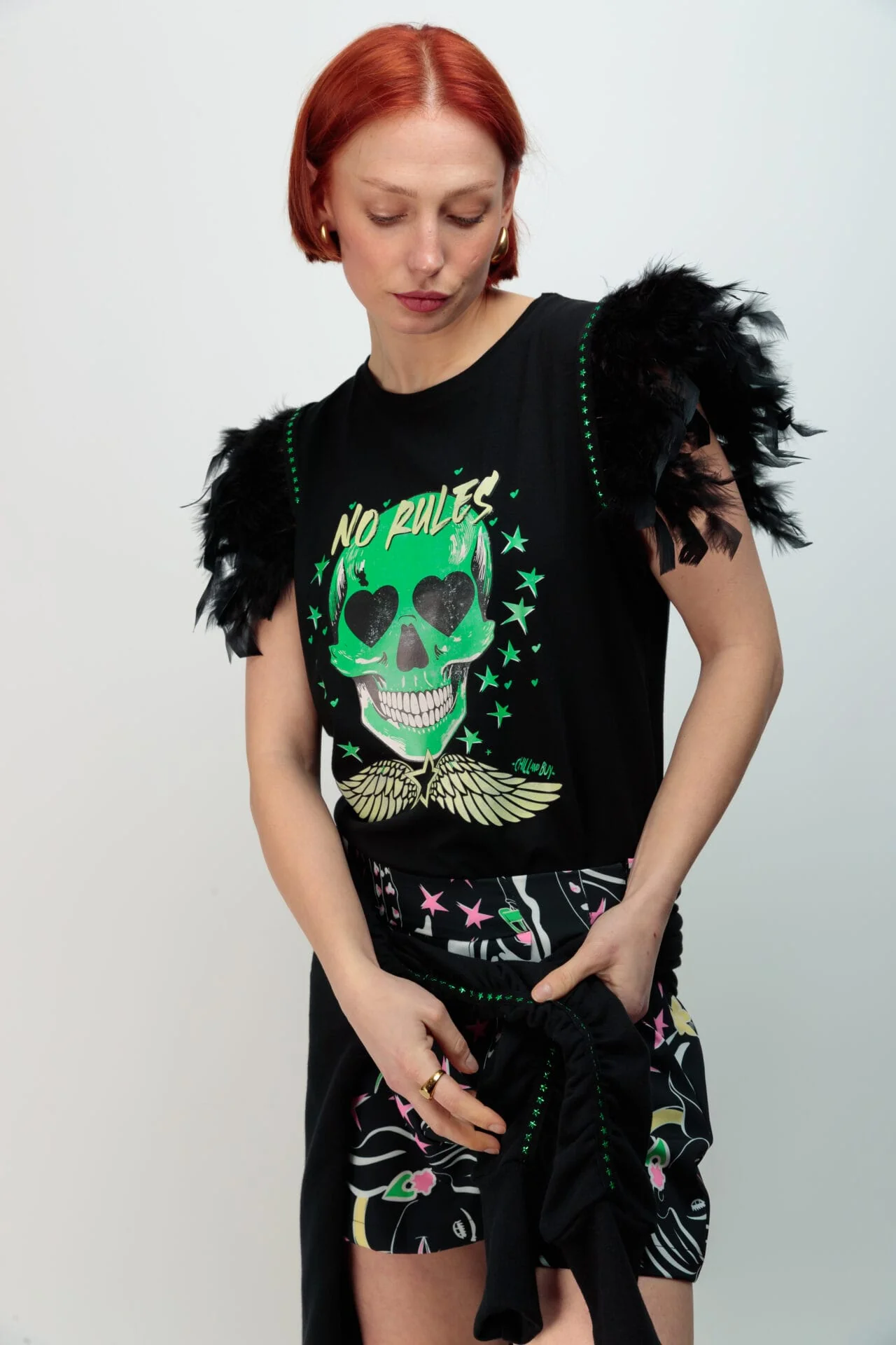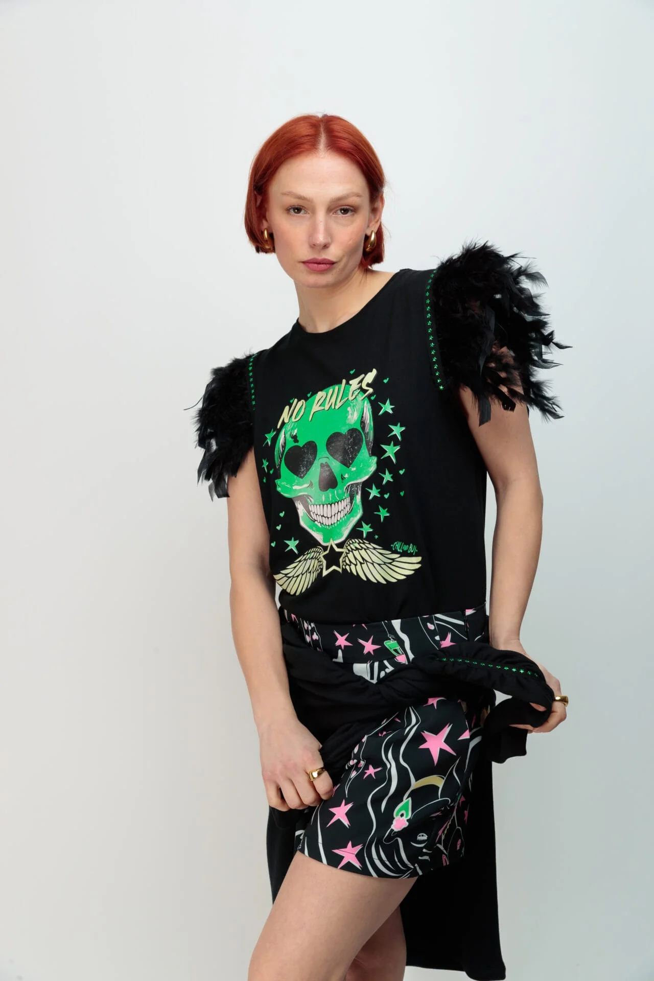 Camiseta negra de algodón, con cuello redondo, corte evasé y bajo asimétrico. Detalle plumas en la sisa en color negro rematadas con tira de tachuelas metálicas en color verde y con forma de estrella. Las plumas se pueden lavar en la lavadora en un programa delicado y dejar secar al aire libre. Estampación frontal. Hecho en Vigo.