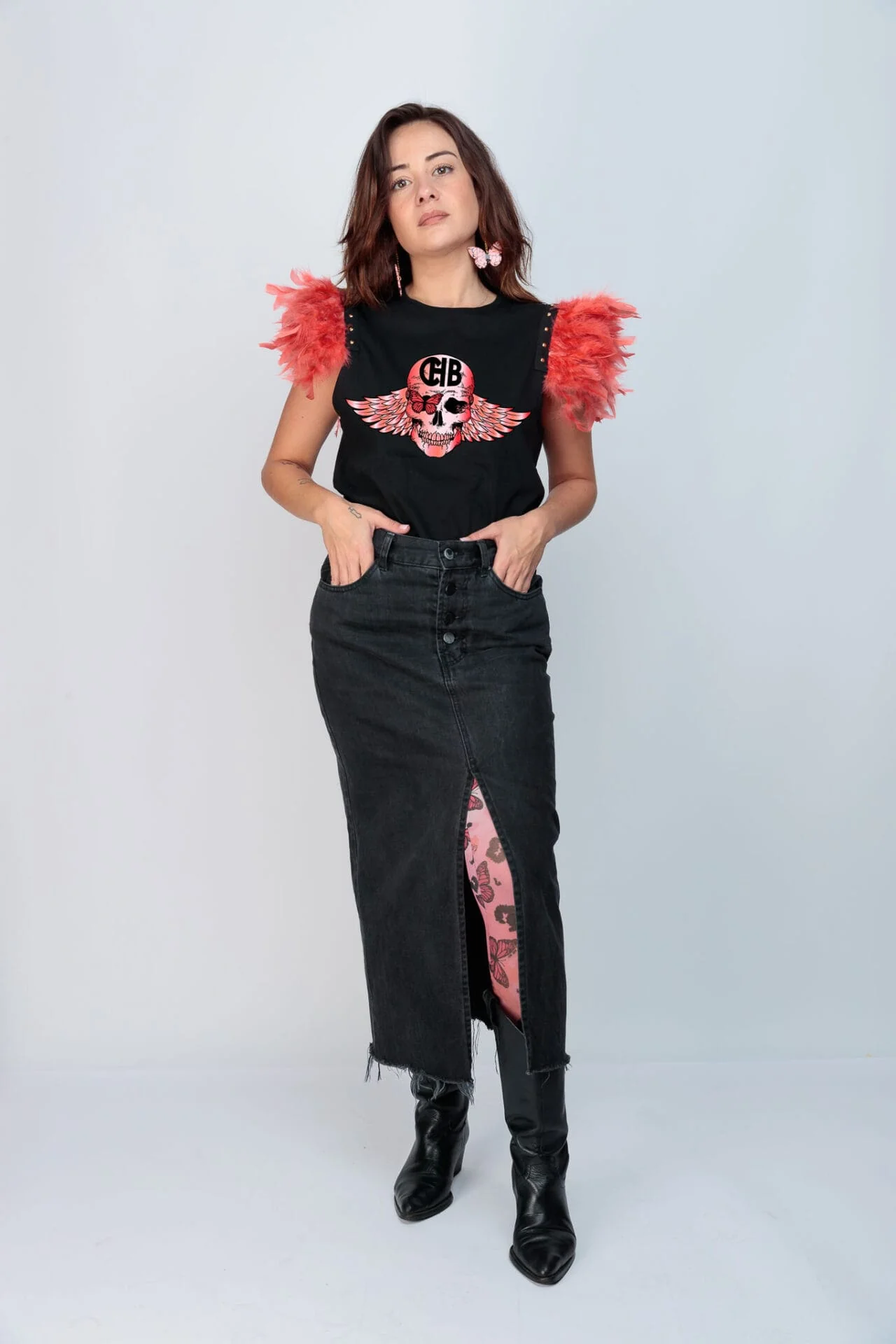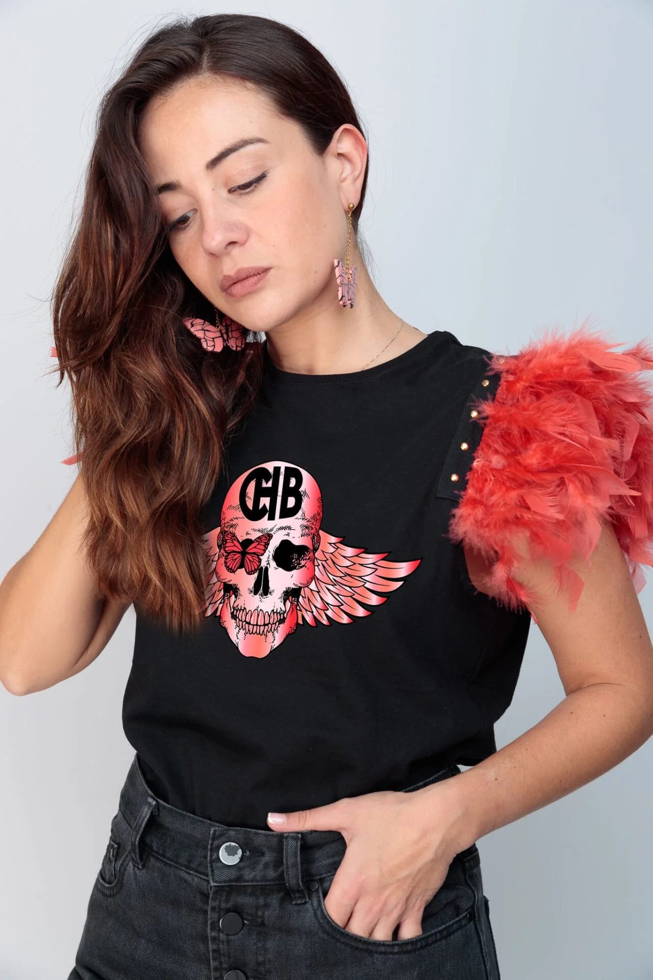 Camiseta Plumas Skull Tie, cuello redondo corte evasé y bajo asimétrico, adornada con plumas en color coral y tachuelas doradas en las sisa. Estampación frontal.