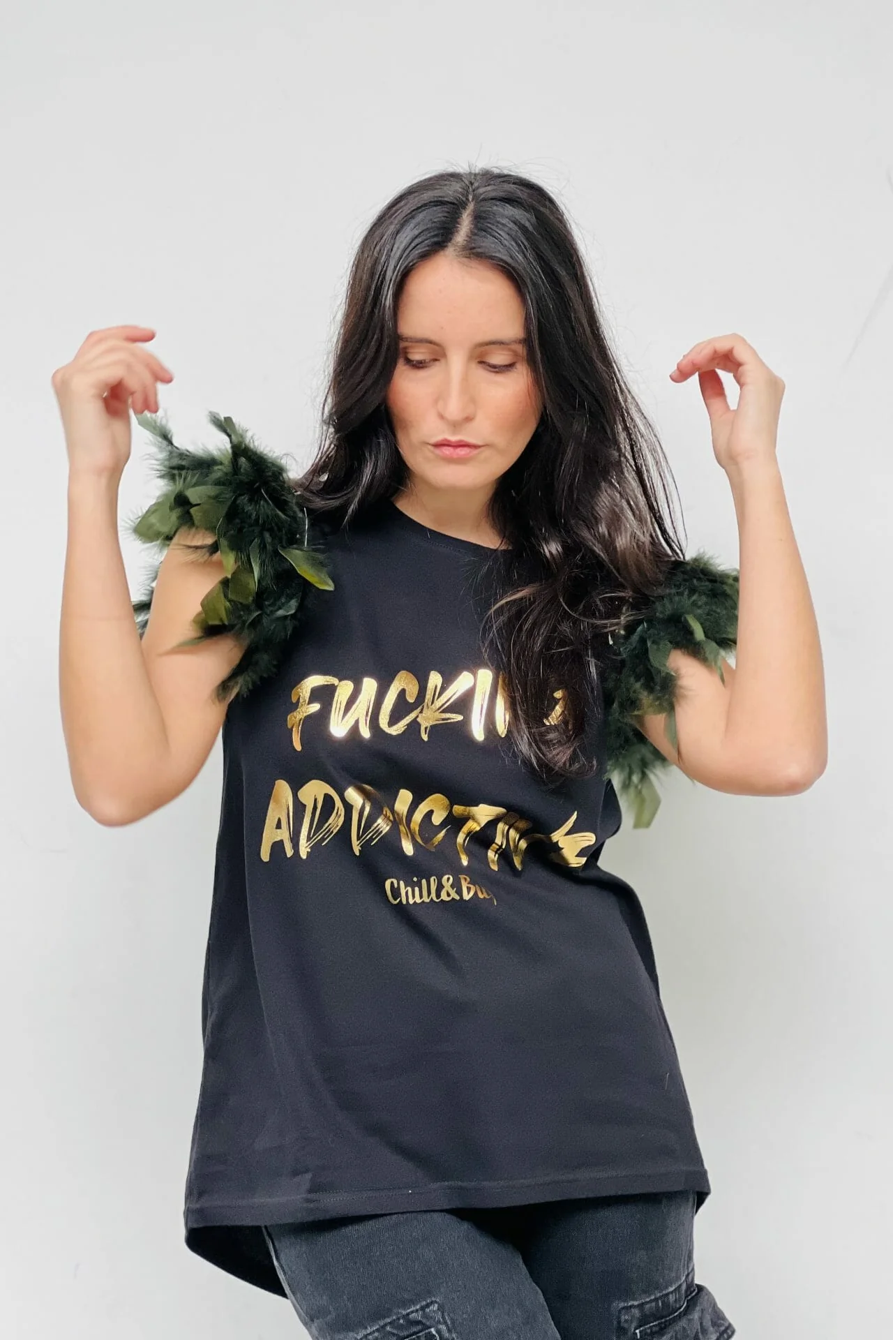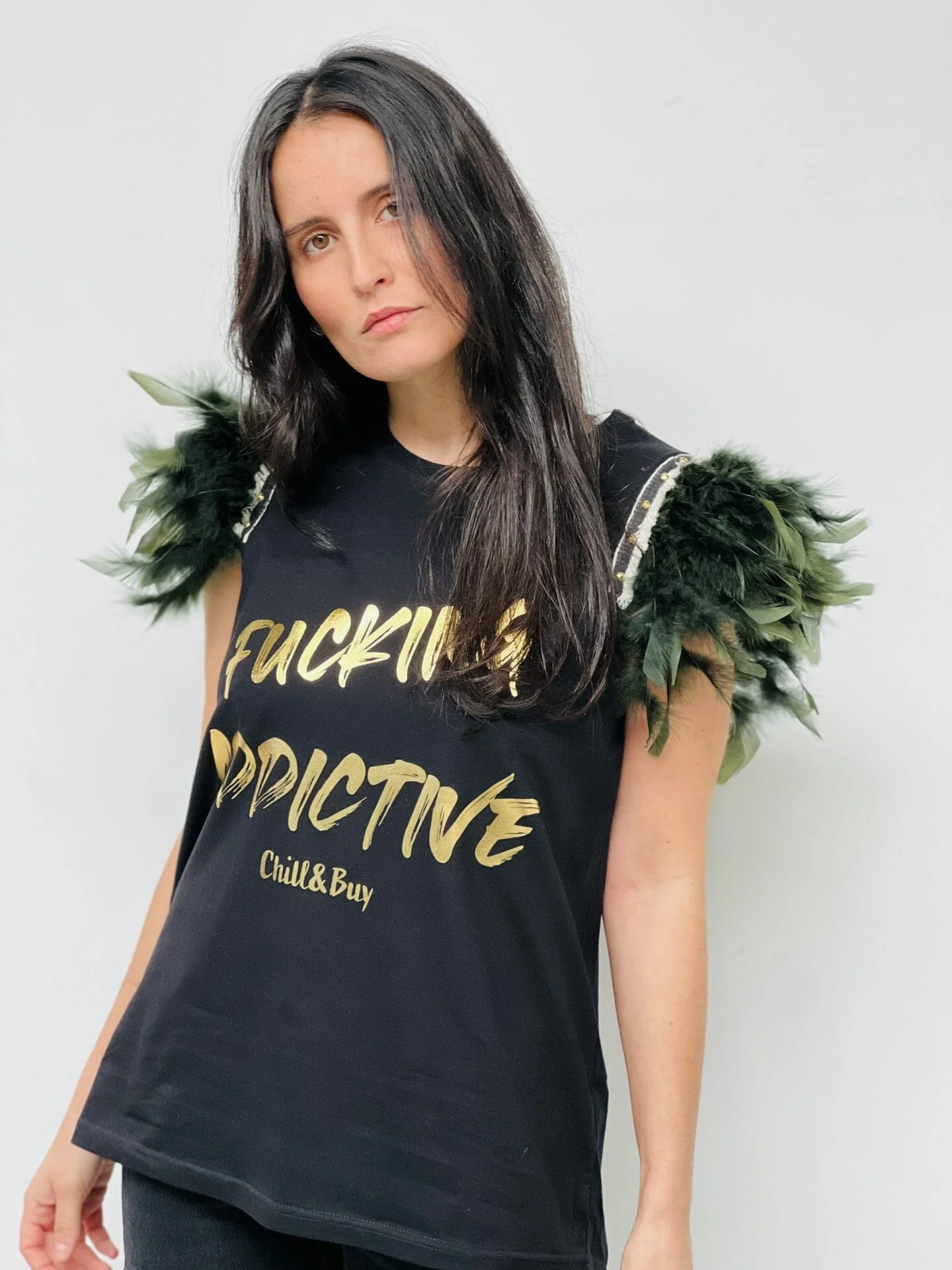Camiseta de algodón con corte evasé, cuello redondo y bajo asimétrico. Detalle de manga con plumas en color verde rematadas con cinta de tachuelas doradas. Estampación delantera.